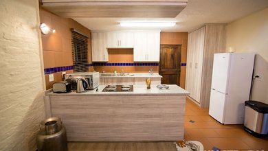 Self Catering unit with a full kitchen that is separate from the main room with, stove-top, fridge, and micro oven. The room has a double bed, reading...