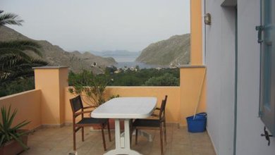 A large furnished terrace with spectacular uninterrupted panoramic views of Yialos harbour, Nimos Island and Turkey in the distance runs along the whole...