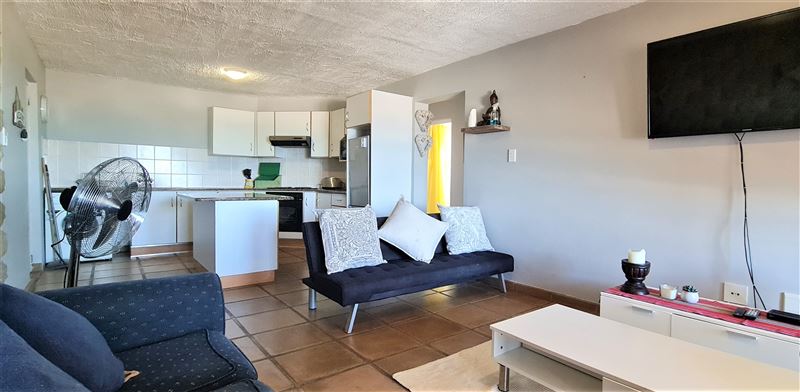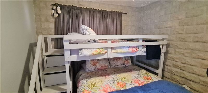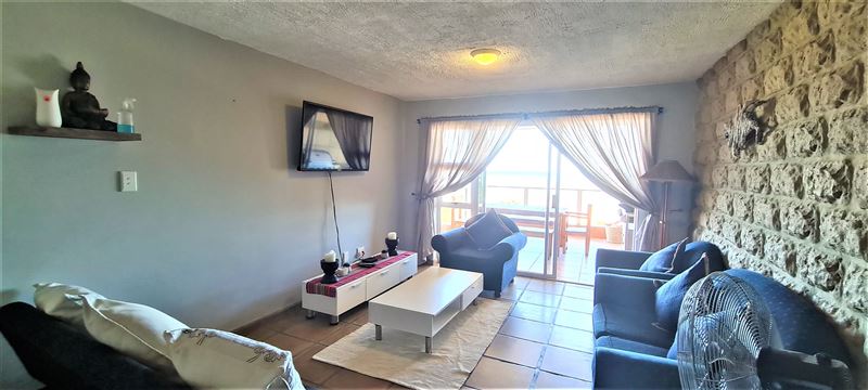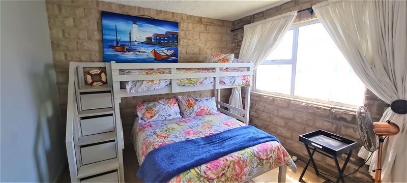 This awesome holiday apartment is located on the Margate beachfront and promenade. It has a spectacular balcony view of the Indian Ocean and beach. It is located on the sixth floor and only has stairs access (no elevator), so please note that this unit is not wheelchair friendly.The apartment offers three bedrooms: a main with a double bed, and two rooms with a tri-bunk (double and single). There is also a single sleeper couch in the lounge. The apartment can therefore sleep seven adults and two children in the optimum configuration. In addition, there are two full bath