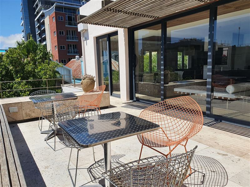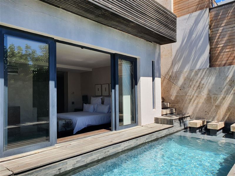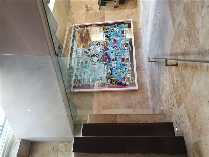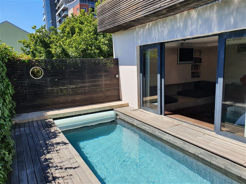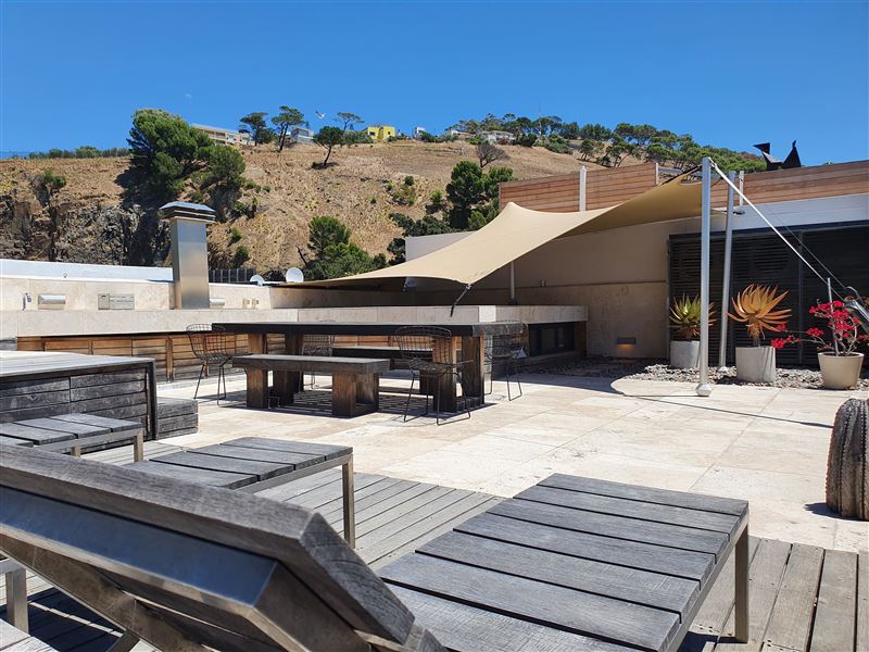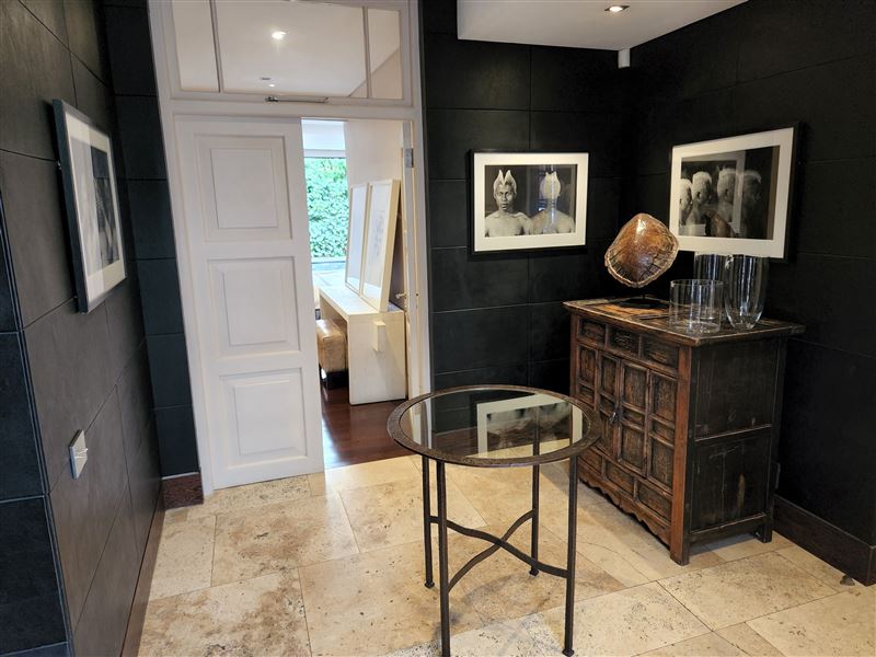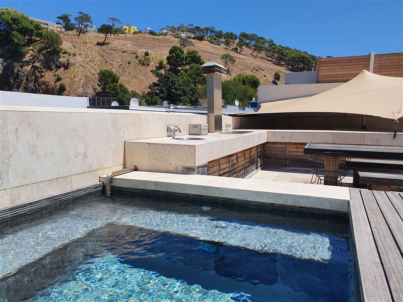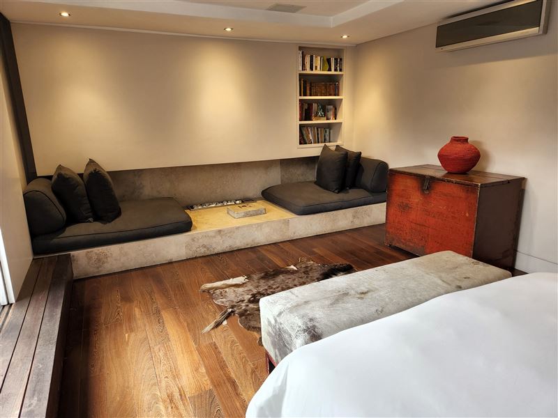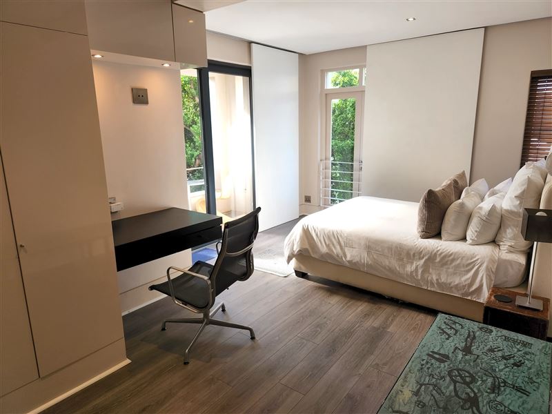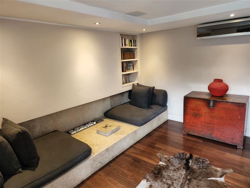 A great house for families or friends, traditional in appearance from the street, this large stylish property has been cleverly designed with massive entertaining space inside and out.You enter into a glamorous hallway with black and white prints. Leading directly off is the air-conditioned master bedroom that boasts a large walk in dressing area with shower and bath. The huge air-conditioned bedroom has bookshelves and sofas surrounding an ornamental stone gas fireplace and suspended television. Sliding floor to ceiling glass doors open onto a private fountain pool that also has Cape Town sky