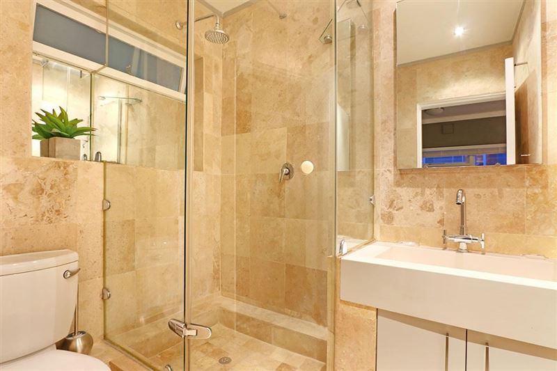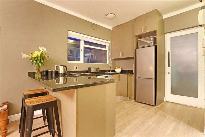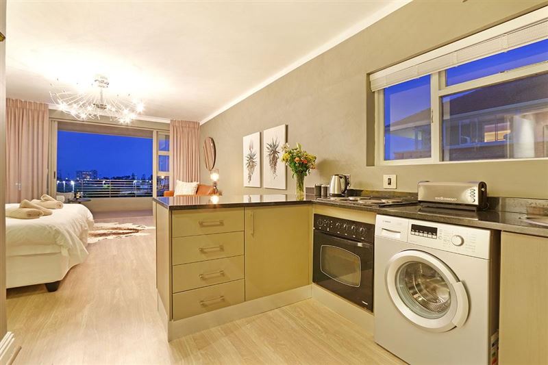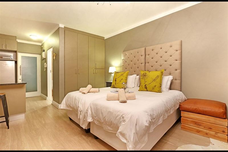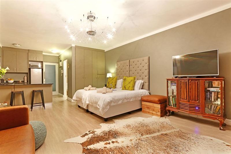 Mainhill is an elegant self-catering studio apartment with some glitzy touches to make you feel like you’ve landed a real gem of a Cape Town holiday apartment. The twin or king bed has a luxurious deep-buttoned headboard and sparkly light fitting, while the opposite wall is adorned with botanical originals of Cape flora. A leather sofa and Nguni rug create a sophisticated lounge and open up the terrace doors to find a huge balcony with deep cane chairs. A perfect place to watch the world go by and the sun set.There’s free Wifi, good security and parking and a fully equi