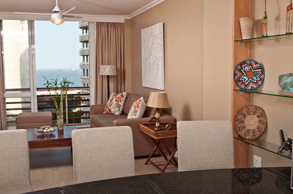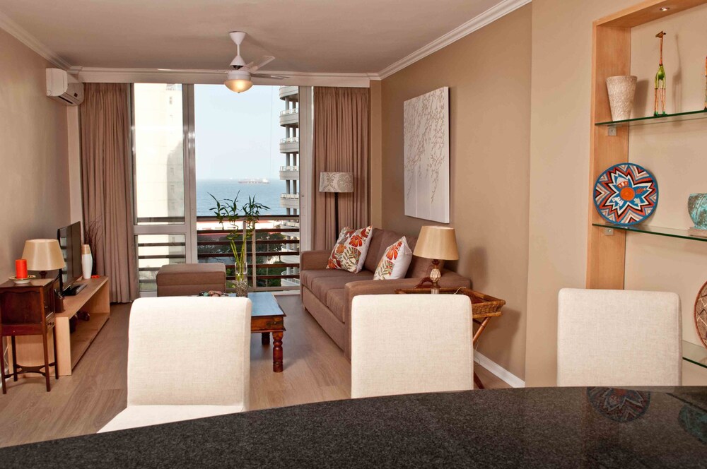 304 Lighthouse Mall is a gorgeous self-catering holiday apartment, situated on the third-floor of the Lighthouse Mall building, in the centre of the upmarket town of Umhlanga Rocks. The apartment enjoys picture perfect sunrises and the sounds of the Indian Ocean, and is conveniently located with a variety of restaurants and alfresco dining options right on the doorstep.This modern vacation-rental is beautifully appointed and enjoys good sea views from both the lounge and the bedroom. The apartment can accommodate up to two guests and contains a king-size bed, which can be convert
