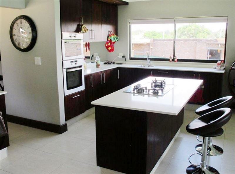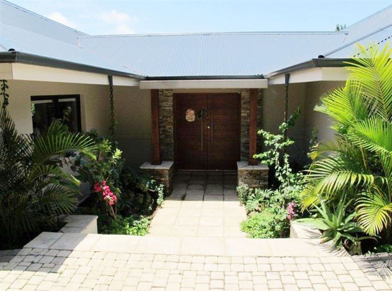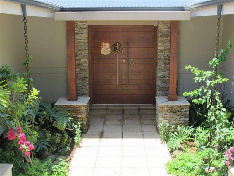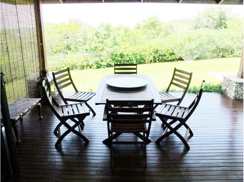 The covered patio offers additional seating and a braai area. The property also has a lovely swimming pool for guests to enjoy.