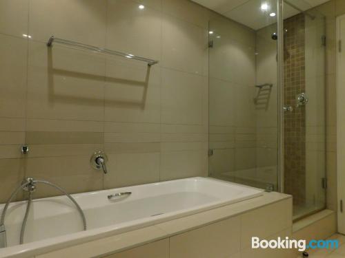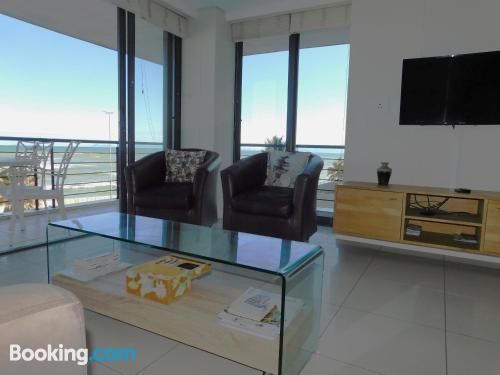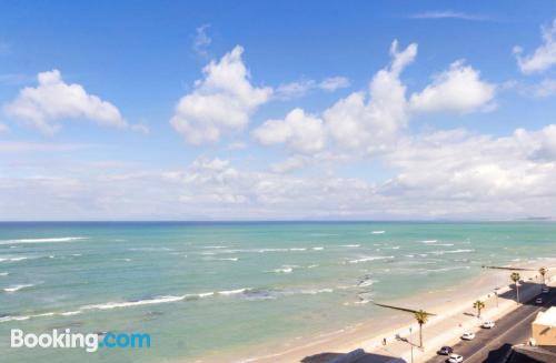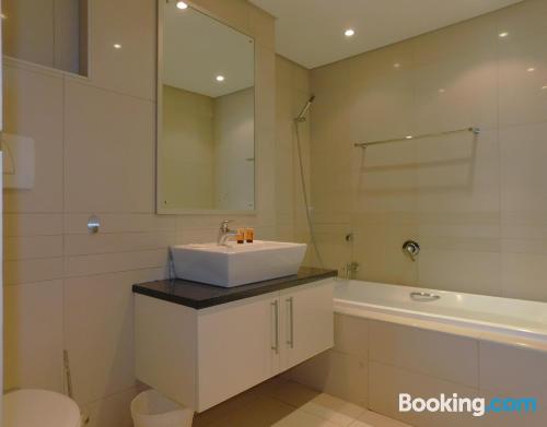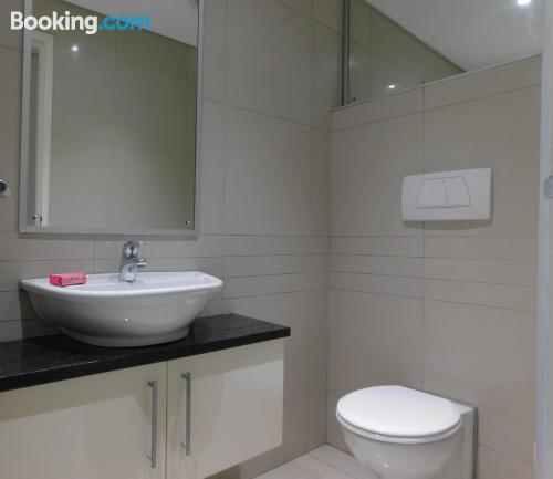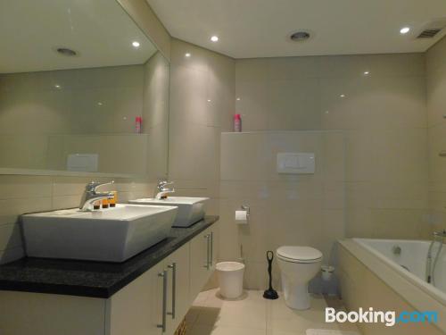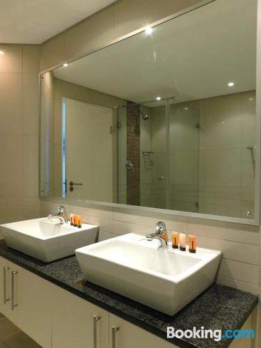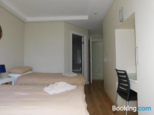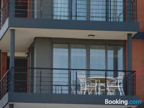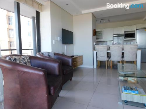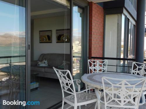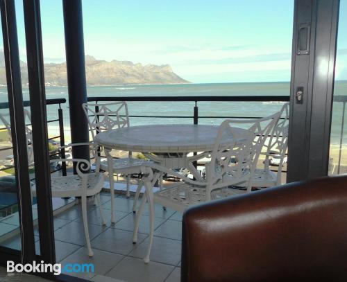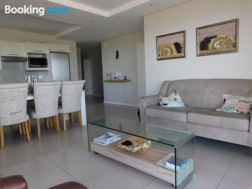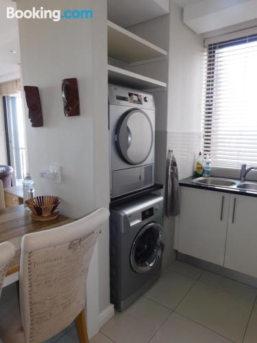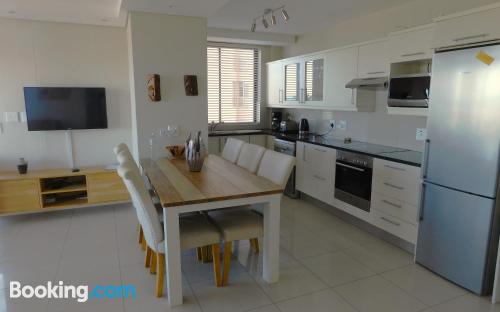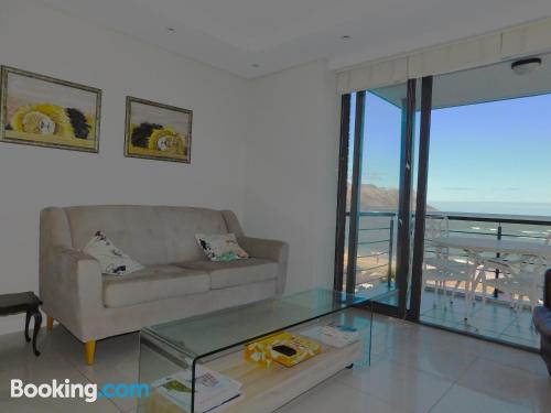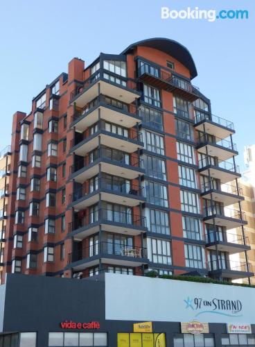 97 on Strand is located on Beach Road, Strand, an area popular during summer for its beaches.This elegant and modern two-bedroom beach apartment, is beautifully furnished offering all the modern day amenities. The main bedroom has a queen-size bed and an en-suite bathroom with ocean views, while the second room has a double bed and a separate bathroom with ocean views as well. The living area is open-plan and consist of a comfortable lounge with a TV, premium DSTV and a dining area seating six guests. There is a fully equipped kitchen fitted with a fridge, stove and microwave inclu