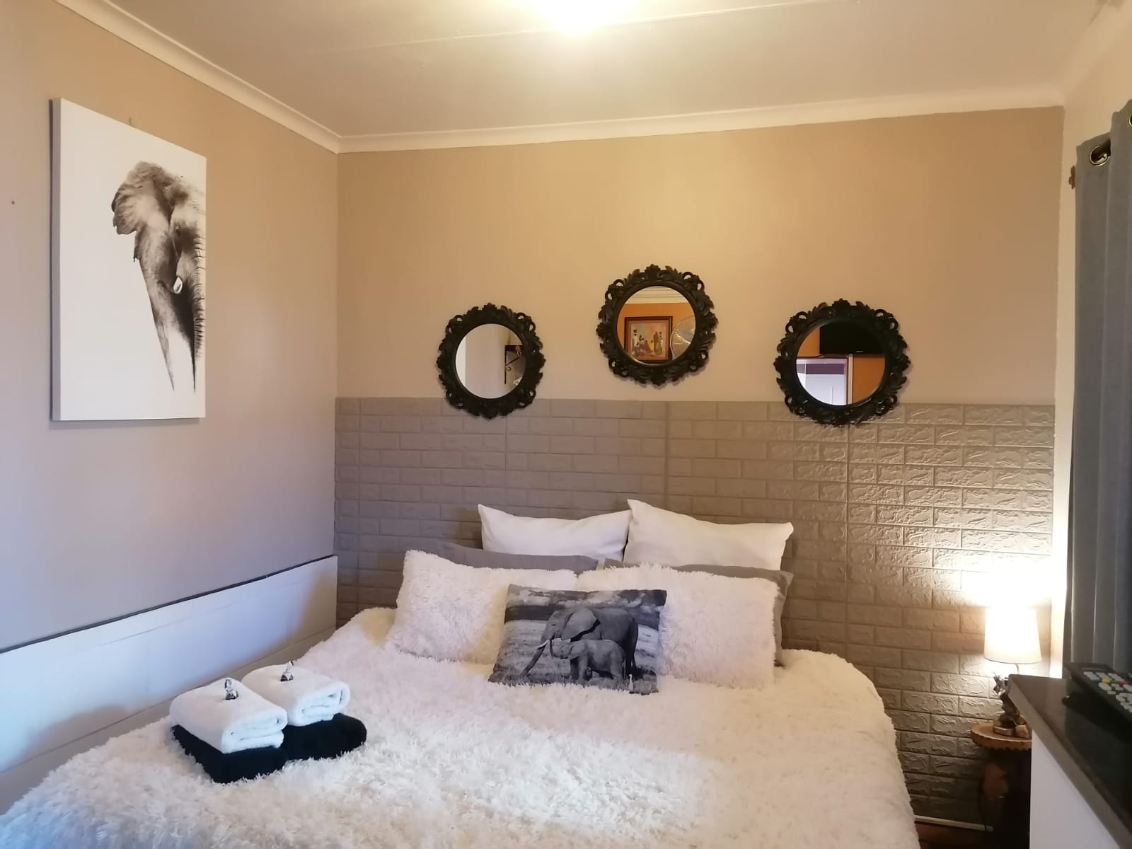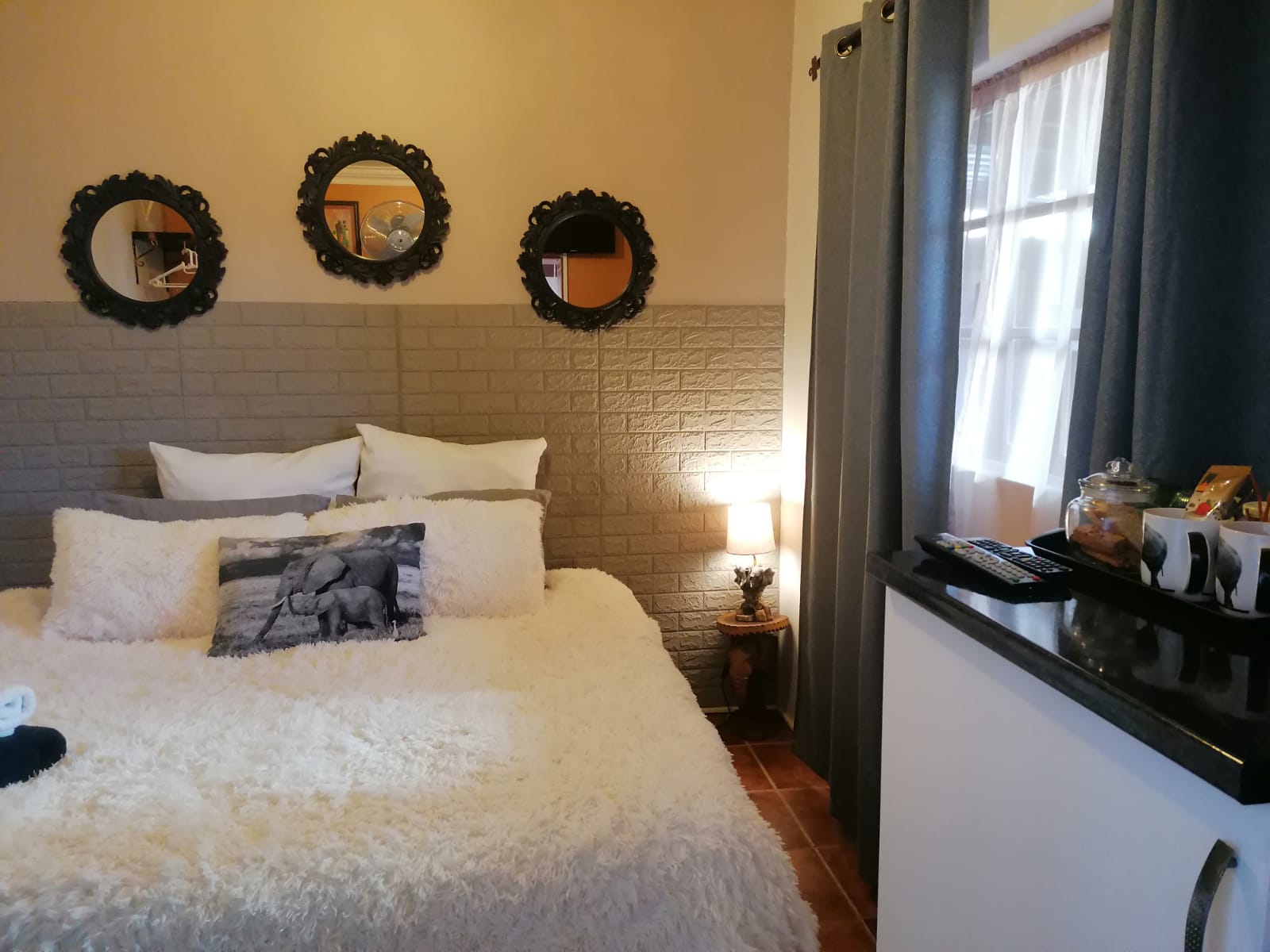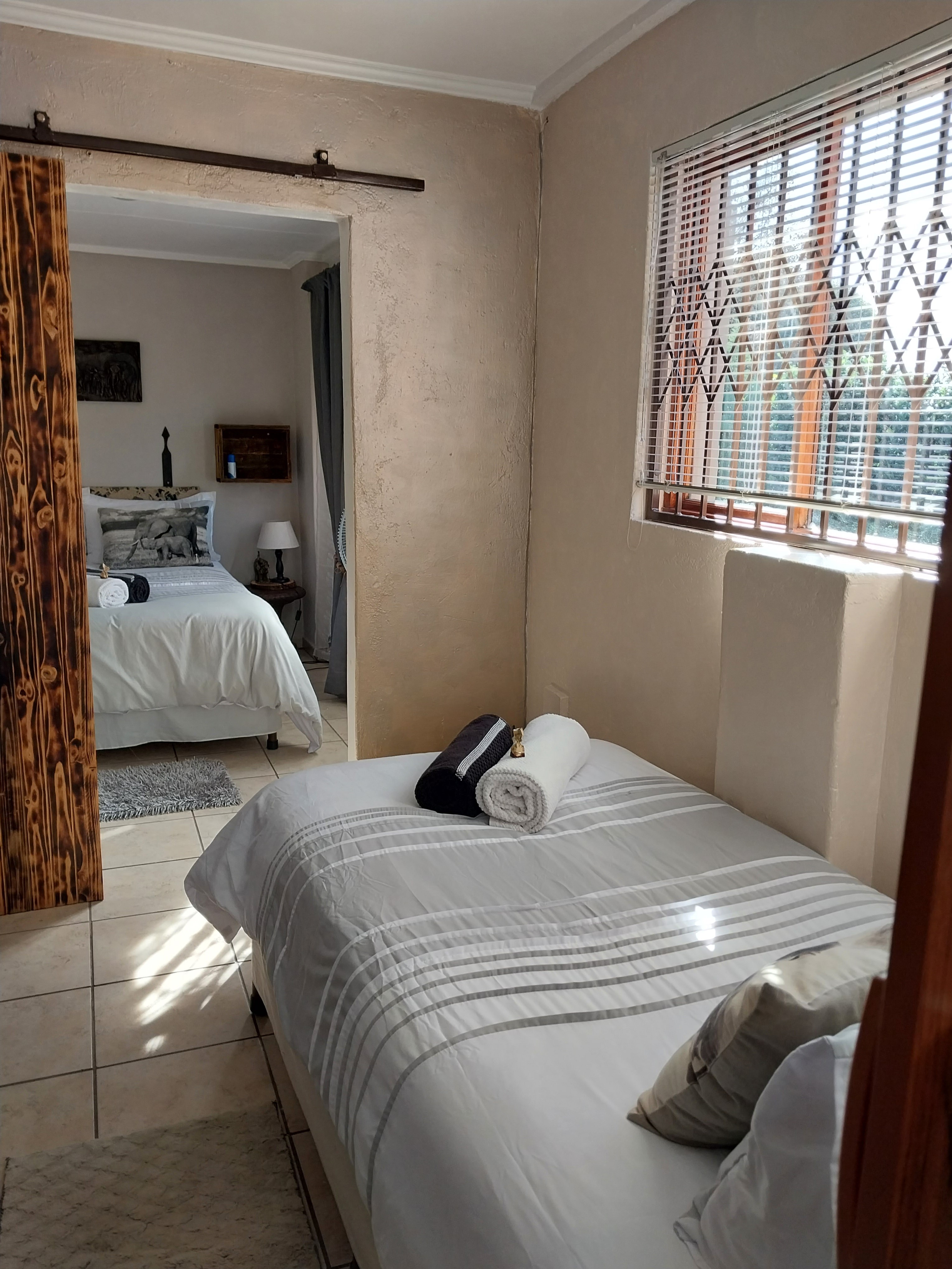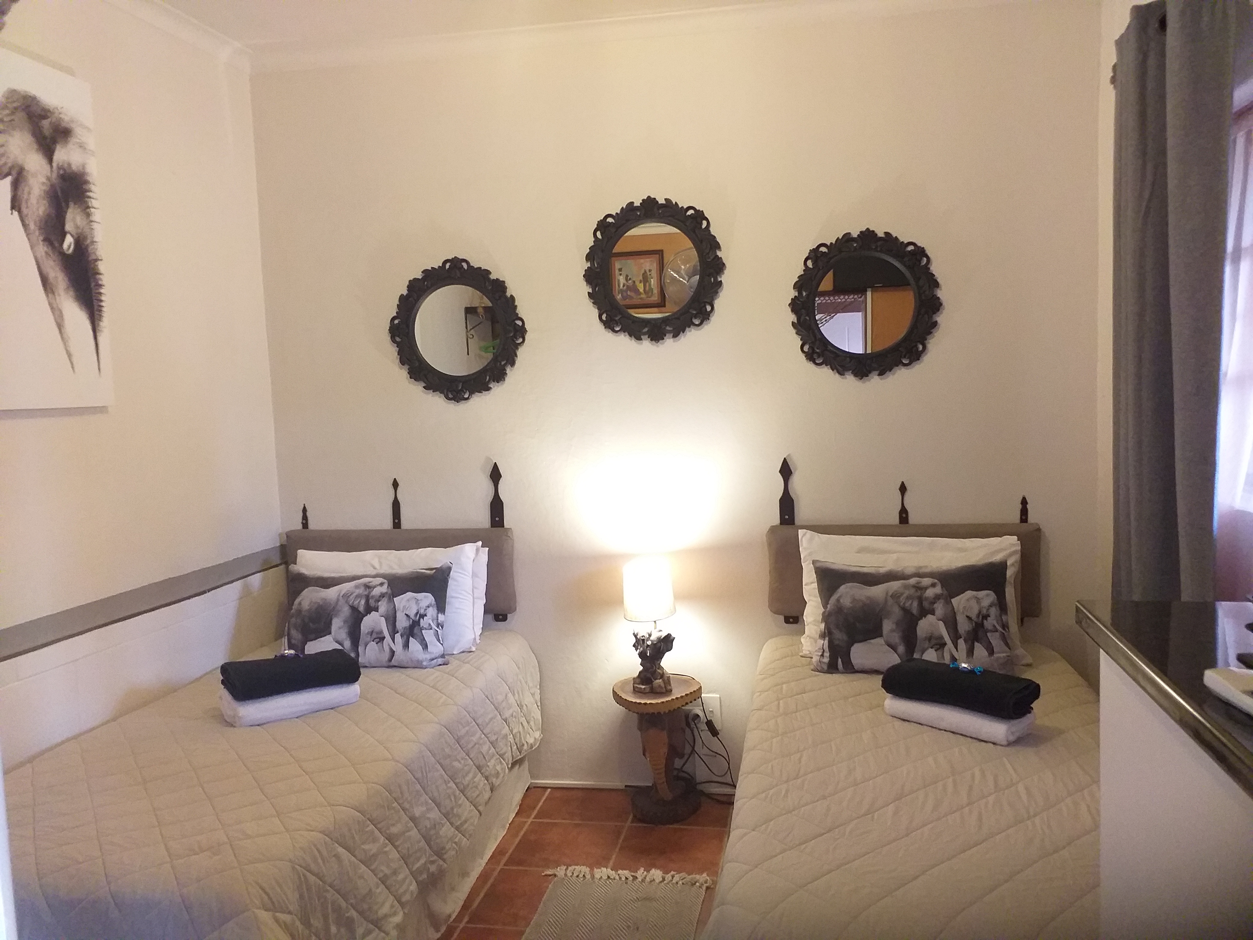 African Elephant's Den previously called 'A New Dawn,' is an old-school establishment where you can escape from the hustle and just relax. Enjoy your cuppa or wine in the peaceful garden with our ample birdlife and soothing water features.The accommodation offers two Matriarch rooms, one with an en-suite spa bath, the other with en-suite shower. It is ideal for ladies, as they are both wings inside the main house. The Dwarf Elephant Rooms comprises of three twin beds, the Bull Elephant has a double bedroom with en-suite and The Herd has a two-bedroom flat with an extra bed and bath