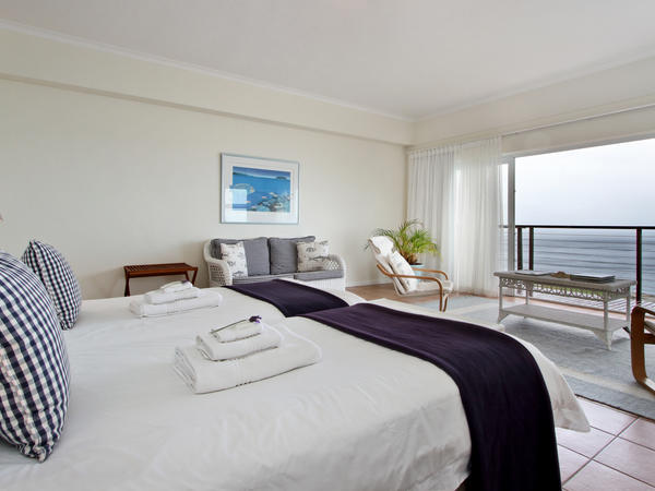 Shearwater, with its unrestricted and fabulous sea views, sleeps four adults comfortably. Facilities include a large open plan living room with self-contained kitchen and dining and sitting areas, a large sea-facing master bedroom and a second bedroom, both with twin beds, and two bathrooms, one with shower and one with bath. Both living room and master bedroom face onto a large wooden deck with magnificent views in all directions. Kitchen is fully equipped with hob, oven, microwave, fridge, crockery and cooking utensils. TV and telephone available and kettle braai by arrangement. Watsonia is a one bedroom suite, with twin beds, a bathroom with large shower and a light and airy living room with small but well equipped kitchenette (fridge, microwave, hob, crockery and cooking equipment). TV. It does not have a patio but guests staying here have access to our garden, which provides stunning sea views. Laundry service is available in the village. All towels and percale linen are provided and are changed twice a week. The apartments are serviced on a twice weekly basis.