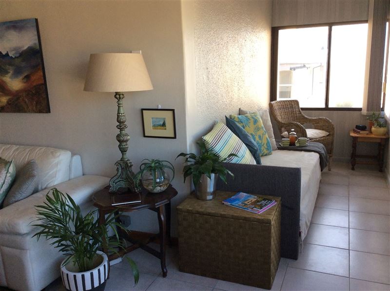 The quaint flat, which accommodates up to two guests, features an open-plan fully equipped kitchen with laundry amenities, a comfortable lounge with television, a four-seater dining table, and a sun room with sea views. The abode also offers guests parking on the premises.