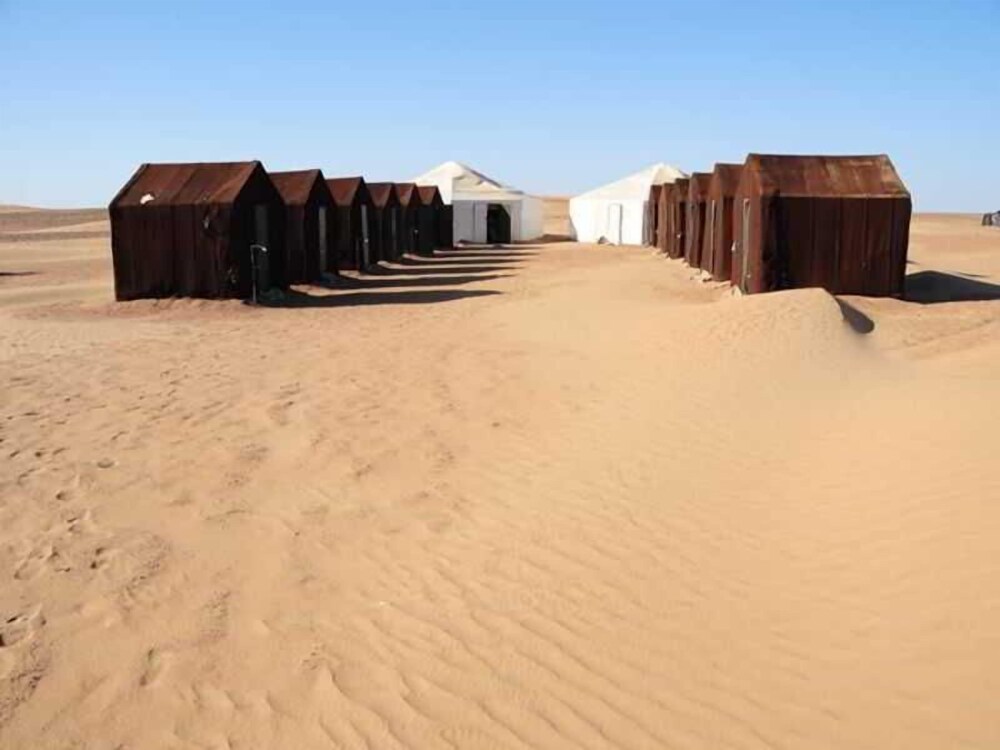 The camp is located 80 km from the town of Zagora, in the open sand dunes at Erg Lihoudi, which is well known by all lovers of the desert. Links to the public transport network are around 20 km away. Ouarzazate Airport is situated at a distance of approximately 170 km.The camp comprises 15 fully equipped nomad tents. It has a modern toilet block next to the tents with showers and toilets. The location is fantastic, very quiet and peaceful. The establishment also comprises a lobby and restaurant.The tents are nomadic tents made of camel's hair, which allows them to be waterproof. They are equipped with mats, carpets, and double mattresses with sheets and blankets.The camp offers the opportunity to go camel trekking in the dunes or guests may head out on foot to watch the sunrise and sunset.The camp offers breakfast, half board and full board stays. For customers who stay more than 1 night, full board is recommended.