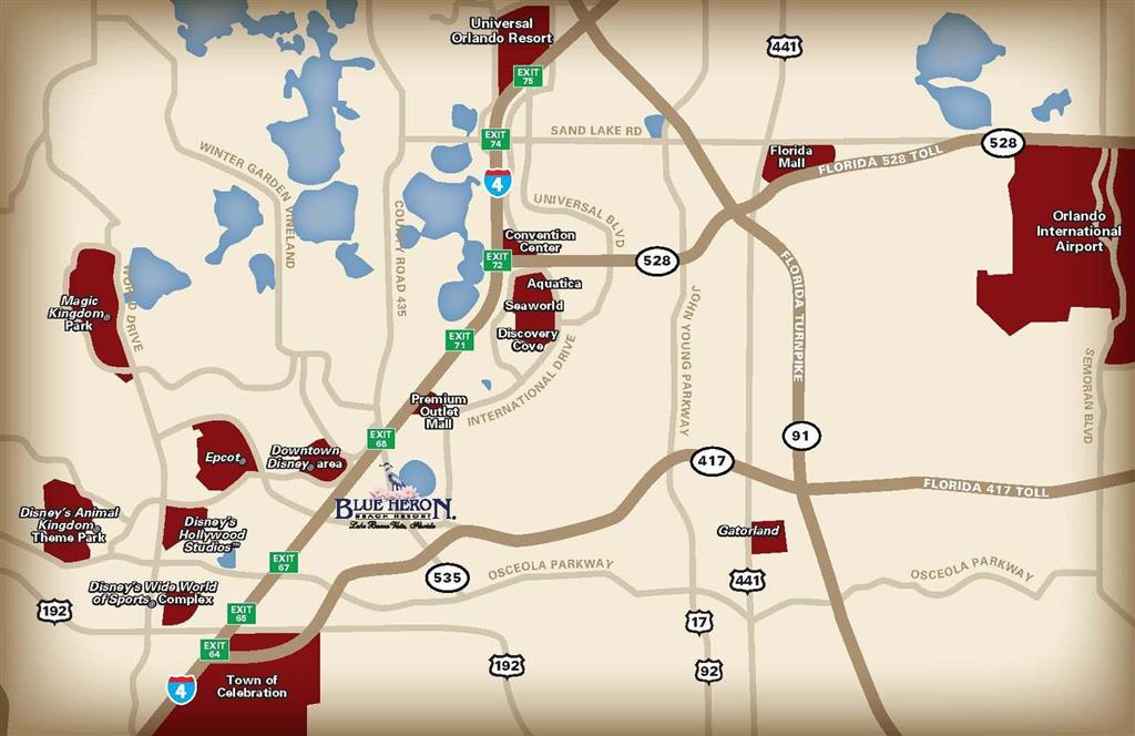 The Blue Heron Beach Resort is a Orlando family condo-style resort hotel located less than 1 mile/1.6 km from the entrance of Walt Disney World and only minutes away from SeaWorld and Universal Studios. Nestled on the banks of Lake Bryan, this self-catering Orlando resort is the perfect point of departure for experiencing all that Orlando has to offer. Positioned just south of I-4 this luxurious condominium resort is 6 miles/10km from downtown Orlando and only 25 minutes from over 30 different golf courses in the area. With soaring views of Lake Bryan this towering 16-story up-scale Orlando resort near Disney offers 1 and 2 bedroom condos with private balconies and fully equipped kitchens which include granite counter tops, dishwasher, full-sized oven, and microwave. Perfect for families with small children all condo-style units include highspeed Internet and a large living space with bunk beds. Family travelers will also appreciate a dryer for those sandy trips back and forth to the beach. After exploring Orlando's best amusement parks, unwind at the heated pool with lap lane and let the kids splash in the kiddy pool. For further relaxation try the hot tub, or maintain your workout routine at the resort's fully equipped fitness center. With 900 feet of lakefront footage, the Blue Heron also offers a myriad water adventures such as jet skiing, fishing, and water skiing. For your convenience there is a full-service supermarket within walking distance.