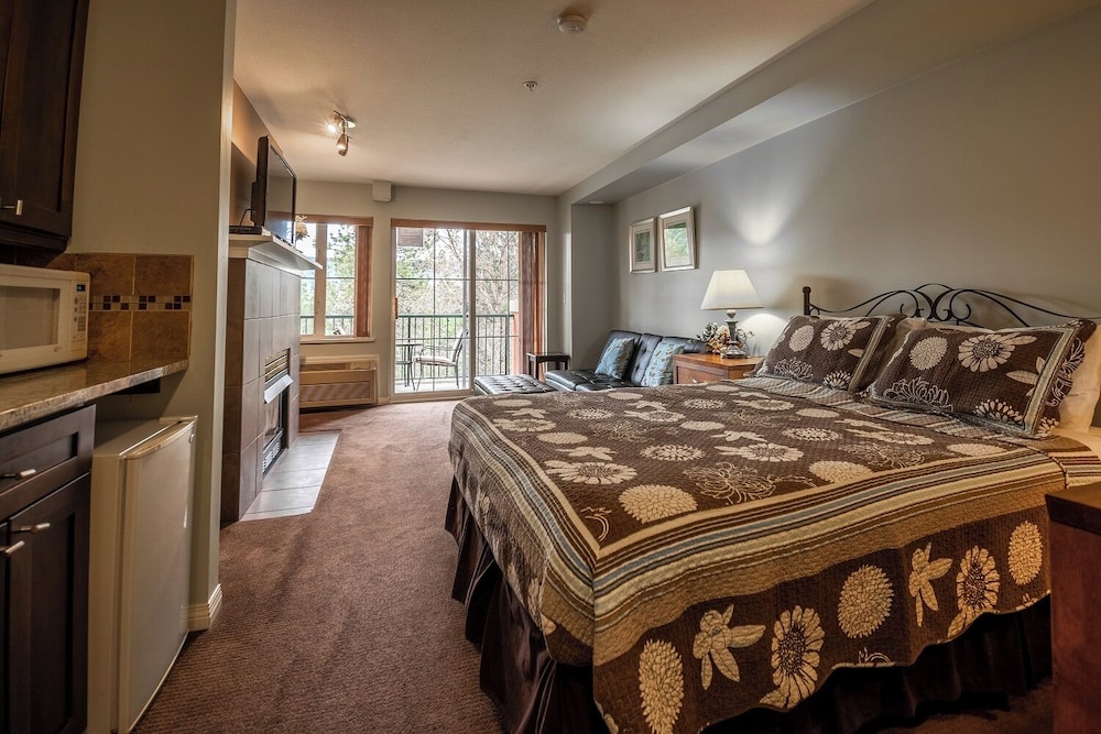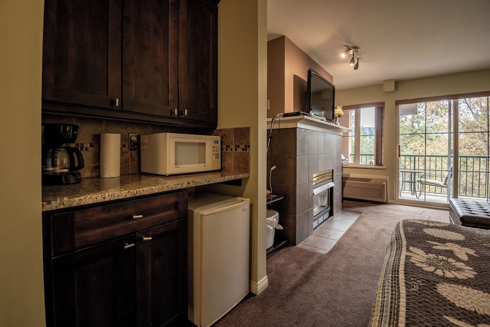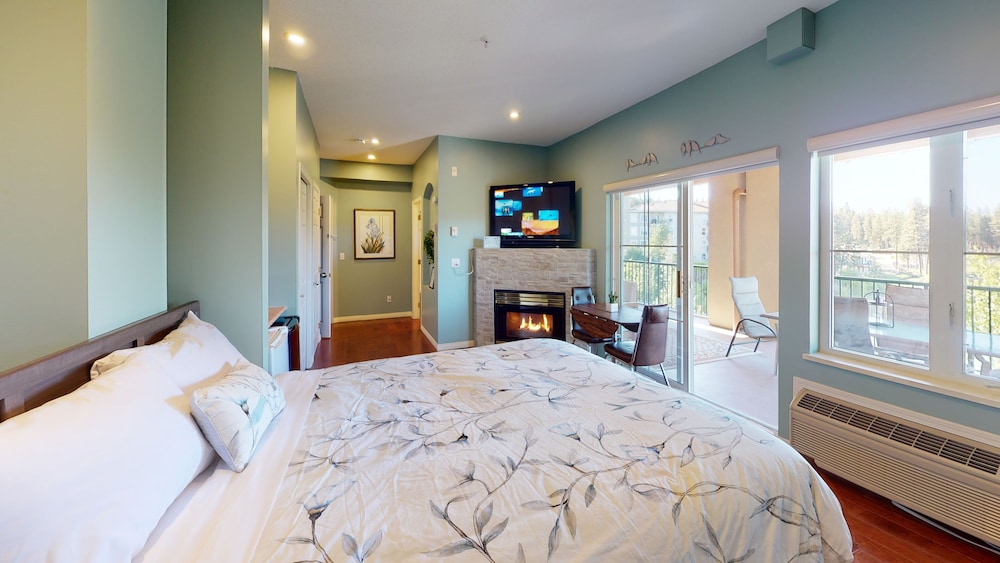With on-site golfing a spa and restaurant and apartment-style suites with kitchen facilities the Borgata Lodge features the comforts of home in the heart of the Okanagan Valley. The four-story Borgata Lodge offers 20 suites in a Tuscan-style lodge. Suites include gas fireplaces free Wi-Fi cable TVs washers and dryers microwaves and mini-fridges. One-bedroom two-bedroom and studio suites are available. Hungry guests can pick up a meal at the on-site restaurant. The on-site spa offers a variety of treatments to help guests relax. Golfers have access to 36 challenging holes of on-site golf. Free underground parking is especially appreciated during bad weather. Non-smoking rooms are available. The hotel is on the shores of Els Lake and is surrounded by 36 holes of golf offered at Okanagan Golf Club. Downtown Kelowna and Prospera Place Centre are 20 minutes from the hotel. Guests on a wine tour can reach at least eight vineyards in 15 minutes. Skiers are 27 miles from Big White Ski Resort 32 miles from Sil