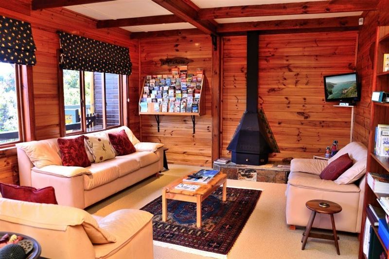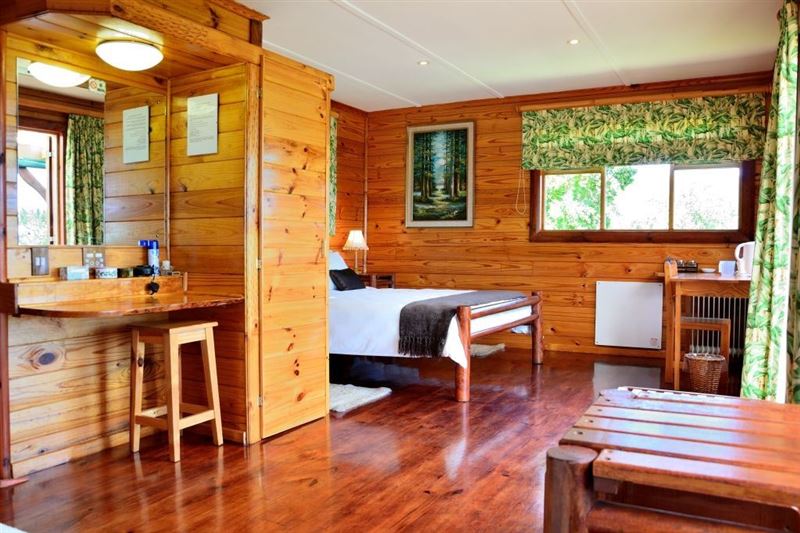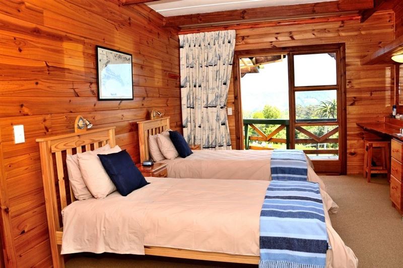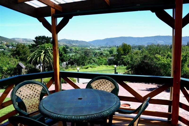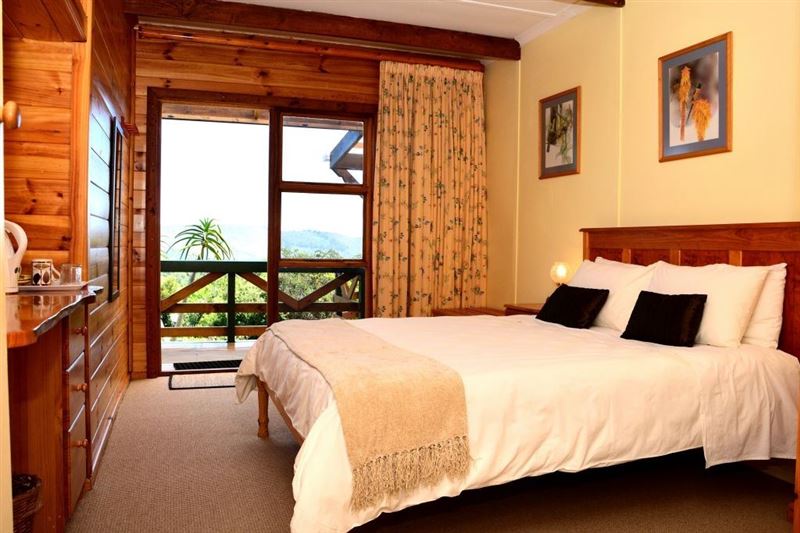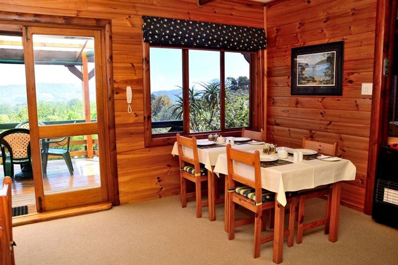 Small owner-run B & B in Hunters Home, a quiet suburb halfway between Knysna town and The Heads.Please note that we do not take children under 10 years of age.We offer 3 en-suite rooms with private access from an elevated deck with magnificent views of the forested valley towards the lagoon and the Heads. Guests can utilize the safe parking and braai facilities on the property. Our self-service breakfast consist of fruit juice, fresh fruit salad, yoghurt, cereals, eggs, bacon/sausage, mushrooms/tomato, toast, filter coffee and a variety of teas.The lodge