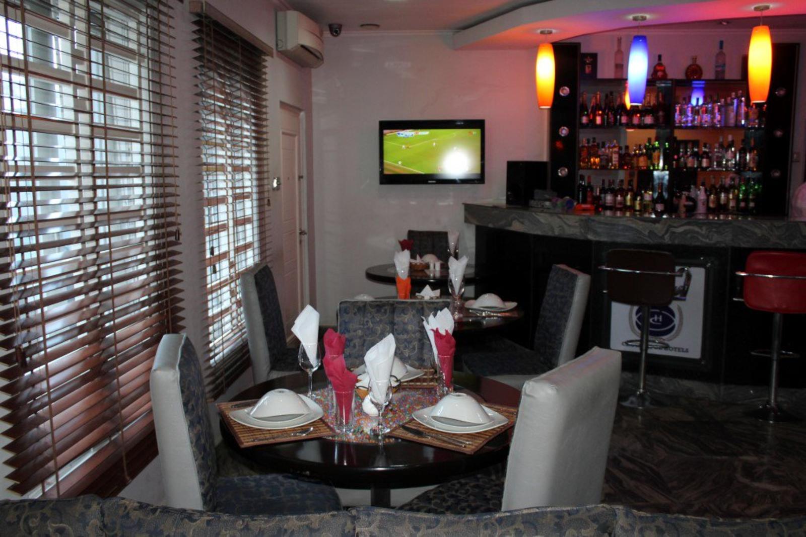 The onsite restaurant is stylishly decorated and offers African and intercontinental cuisines. Guests can enjoy light snacks and beverages at the outdoor bar while watching sports on the large screens. The hotel houses a fitness centre.