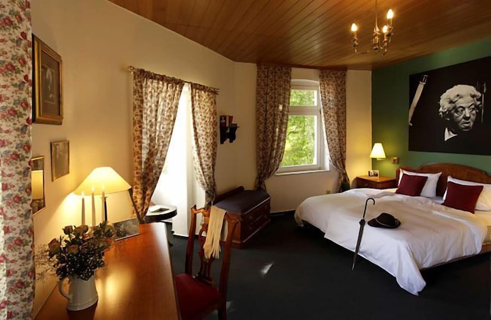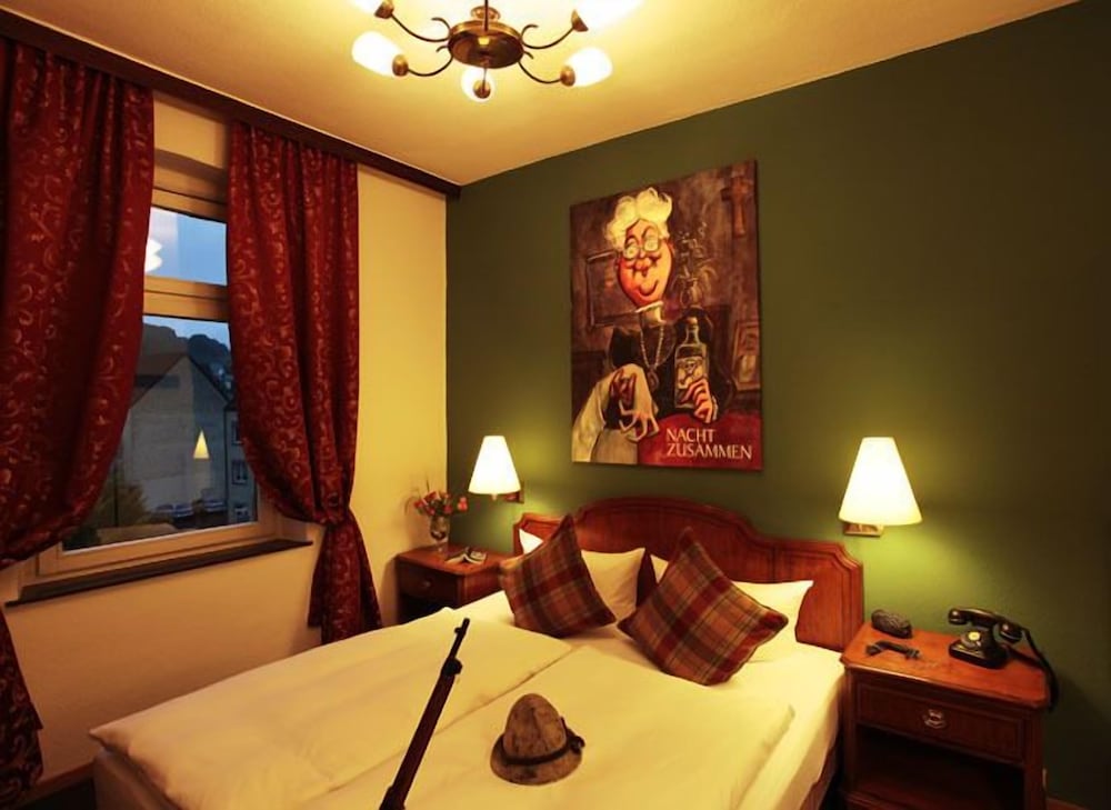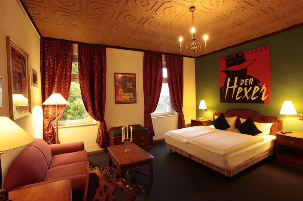 The hotel is the historical town of Hillesheim, next to the Bolsdorfer Tälchen, a recreation area perfect for biking, hiking and all kind of outdoor sports. The Nürburgring, the longest an most famous course of the world , can be reached within 25 minutes. The old-town of Hillesheim is one of the rare European historical relicts. The hotel rooms are all theme-rooms. We have rooms like Miss Marple, James Bond, Sherlock Holmes and a lot more. The 4 different categories are full equipped with a modern bathroom. The heart of the hotel ist the Krimi-Saloon and our club-room. Here you can stay and take the traditionell old English Tea Time with a lot of specialities and a good tea. Our beer garden is absolutely perfect in summer to let end comfortably the evening. One of the highlight of the Krimihotel ist the event "crimial-dinner". The free parking place, is available next the hotel.