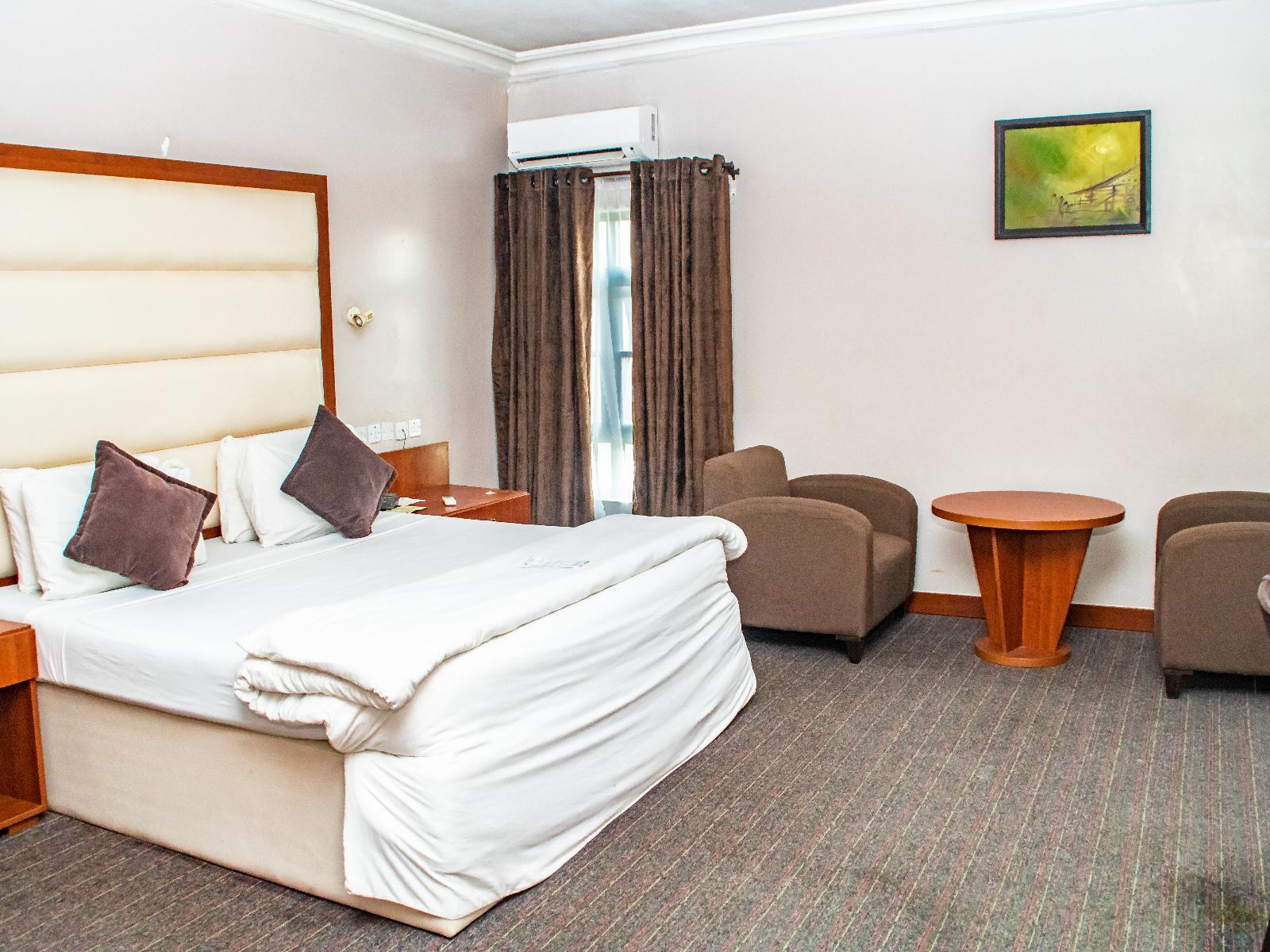 Denis Hotel is a hotel in Abuja, the capital city of Nigeria. The hotel is listed among the top hotels in Abuja and boasts a restaurant and bar. Free WiFi is available for guests. Each room in Denis Hotel Ltd is fully air conditioned fitted with a set of cushion chairs, a worktable, an en suite bathroom, a flat screen TV and a sofa.Guests of Denis Hotel Abuja can order for different delicacies at the onsite restaurant and a variety of alcoholic and non-alcoholic drinks at the onsite bar. Breakfast is made available on request.Laundry is charged when arranged on r