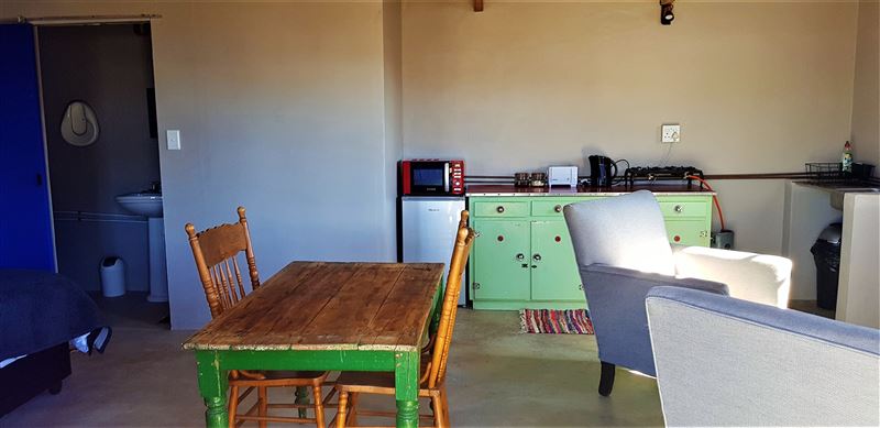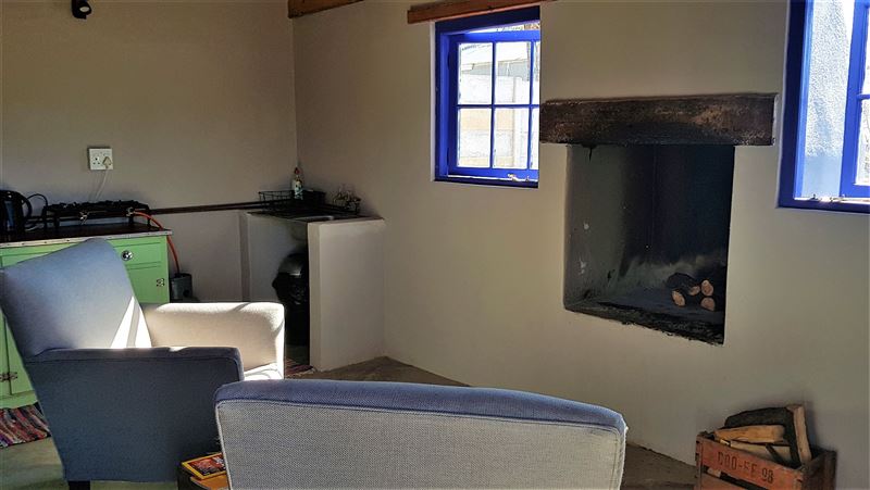 There is also a kitchenette, dining table and inside fireplace where you can braai with a seating area. There is also a fire pit outside should you wish you braai outside. The property is securely fenced in with safe parking next to the cottage.