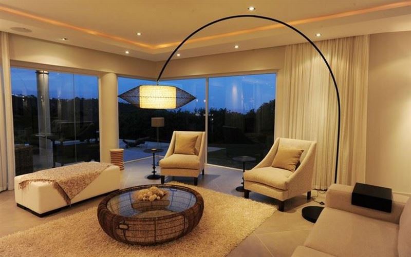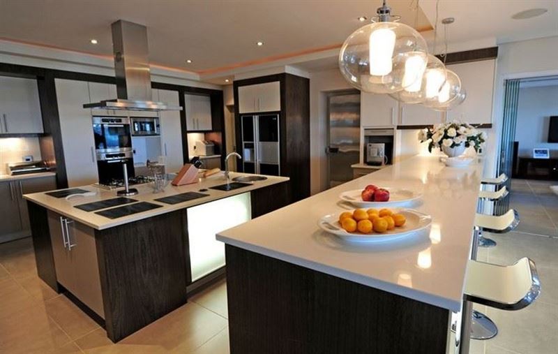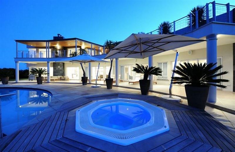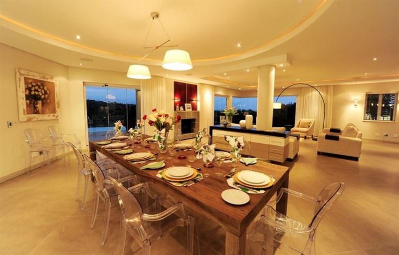 The fully-equipped kitchen features a breakfast bar, central island and large preparation area. It is furnished with the latest appliances; including a gas hob, double oven, walk -in cold-room, fridge-freezer, ice-maker, wine fridge, convection microwave, coffee machine, kettle and other appliances to suit every need. A separate scullery and laundry contain a dishwasher, washing machine and dryer.The dining and lounge area are bright and spacious, and flow seamlessly onto the pool deck by means of the large glass fold-out doors. The dining area is fully equipped and boasts a custom-made eight-seater hard wood table. Adjoining the living area is a wine cellar with dining area, walk-in fridge-freezer and wine cooler. A separate TV lounge with large leather couches features top quality audio-visual technology, with plasma TV featuring full DStv, as well as a Blu Ray DVD player. This, together with the high-end Marantz sound system, grand view cinema screen and projector makes even a quiet night at home into a memorable evening of movie watching.