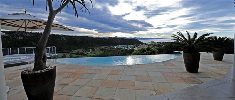 The spacious, living area flows onto a large, sunny pool deck. Ideal for entertaining, the deck is completed with external gas braai, rim-flow heated salt pool and Jacuzzi, with sun loungers on which to relax and enjoy the panoramic views and spectacular sunsets.