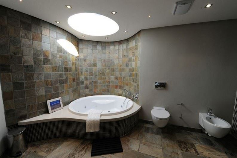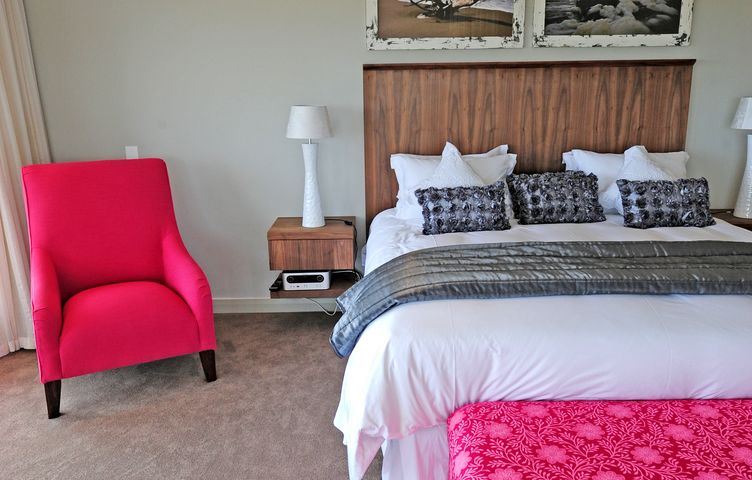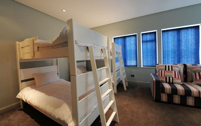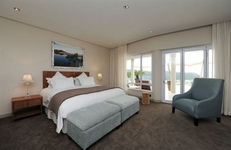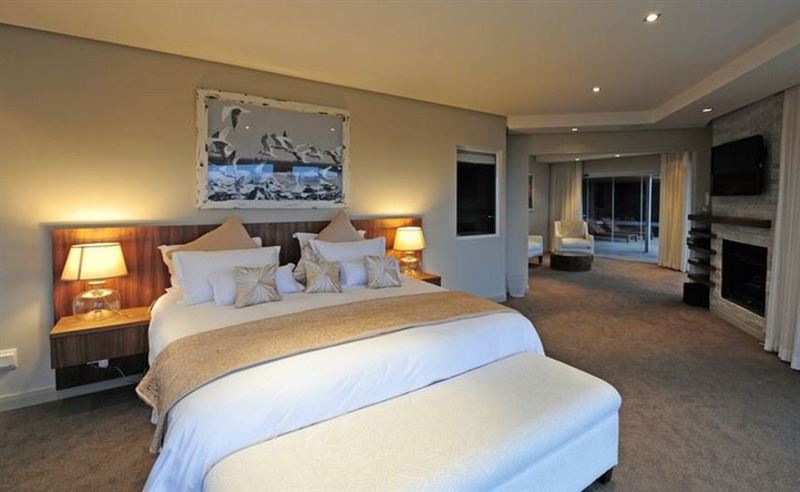 The guest bathroom is complete with vanity, shower and toilet.The villa sleeps twelve guests (8 adults and 4 children) in five spacious bedrooms, all elegantly furnished and with en-suite bathrooms. Four of the five suites open onto the pool deck, upper deck or patio, affording breath-taking views of the surrounds. King-size extra length beds, which can be divided into single beds, have the finest quality bed linen. The ample cupboard space, block-out curtaining, state of the art music systems ensure a luxurious and comfortable stay. En-suite bathrooms are fitted with under-floor heating, heated towel rails, bath, shower and dual washbasins. The master bedroom includes a dressing room, private sitting area with gas fireplace, as well as sumptuous spa bath and shower with protected views of the valley and ocean. The fifth bedroom has two bunk beds and a sleeper couch.Staff quarters with private access are fitted with kitchenette, single bed and fold-out sleeper couch, TV with basic DStv and en suite shower and toilet.