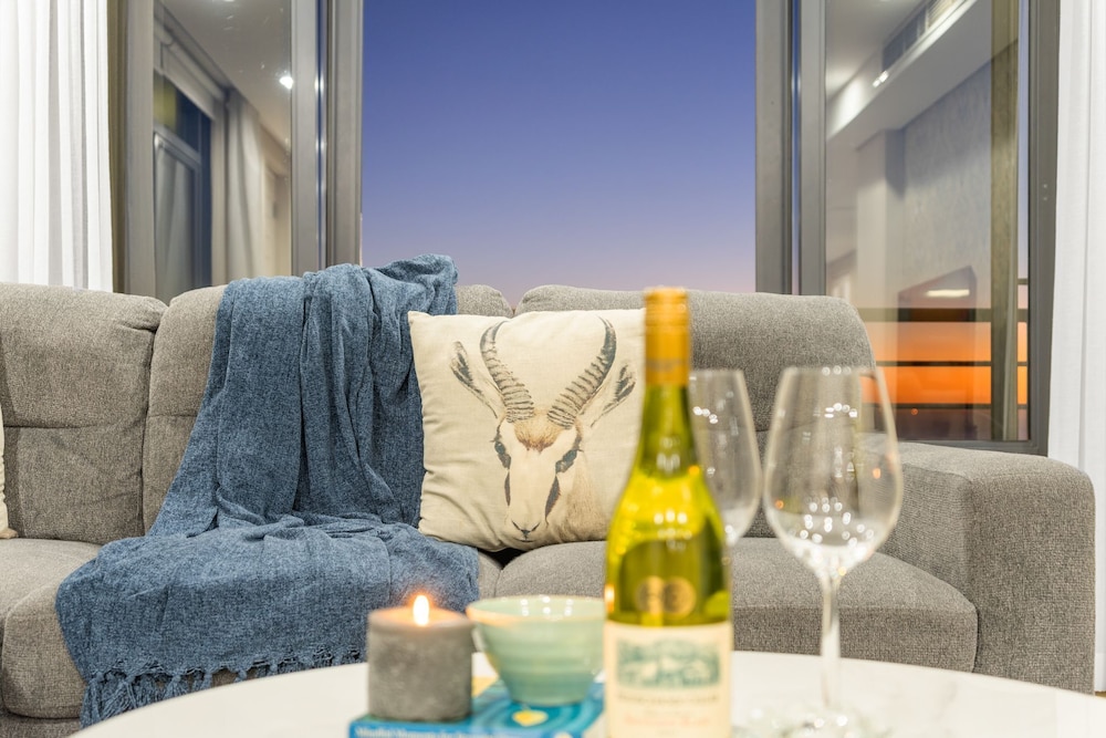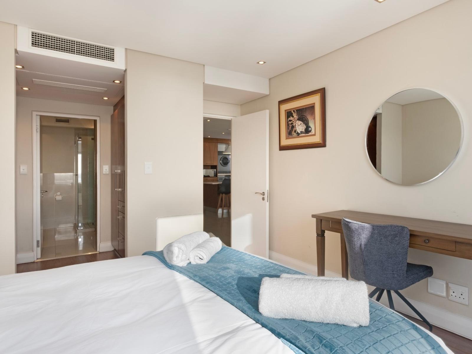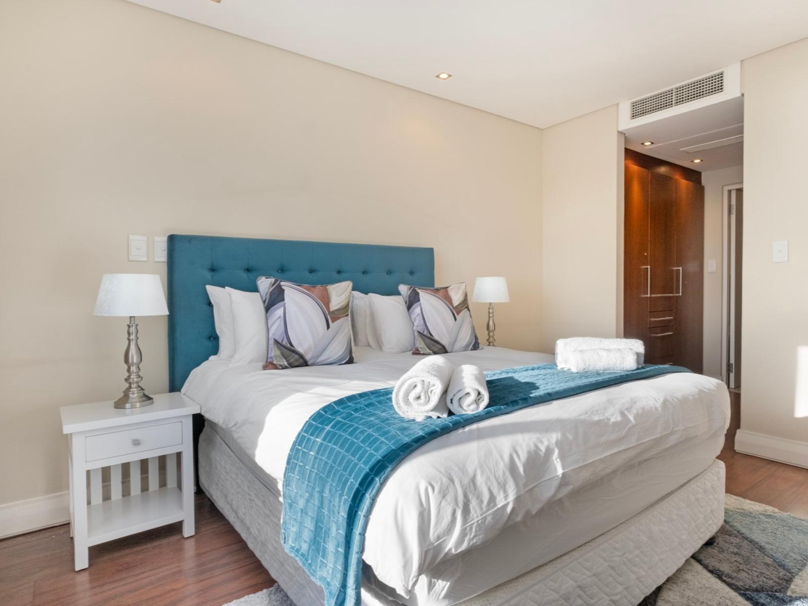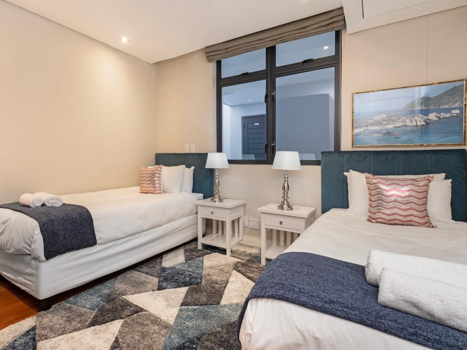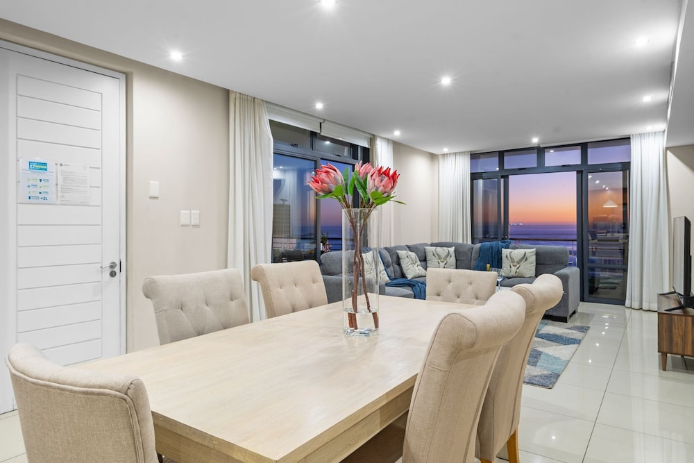 Allow yourself the pleasure of a stay in this elegant and private three bedroom holiday apartment in the shopping and lifestyle complex of Eden on the Bay in Big Bay, Bloubergstrand. This vacation package offers you a wonderful location in a secure complex, close to the Atlantic Ocean with views towards the beautiful Table Mountain.The charming main interior is open plan with the kitchen leading to the dining area and lounge. The kitchen with granite topped counters is fully equipped, including a kettle, fridge, microwave, duo washing machine/dryer and a built-in oven with a stove