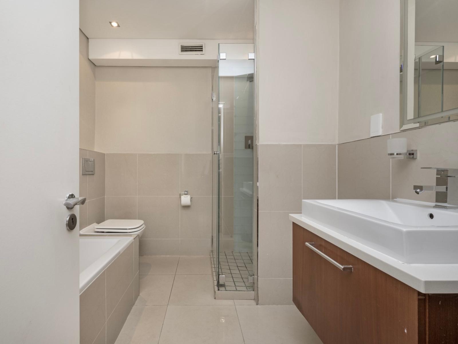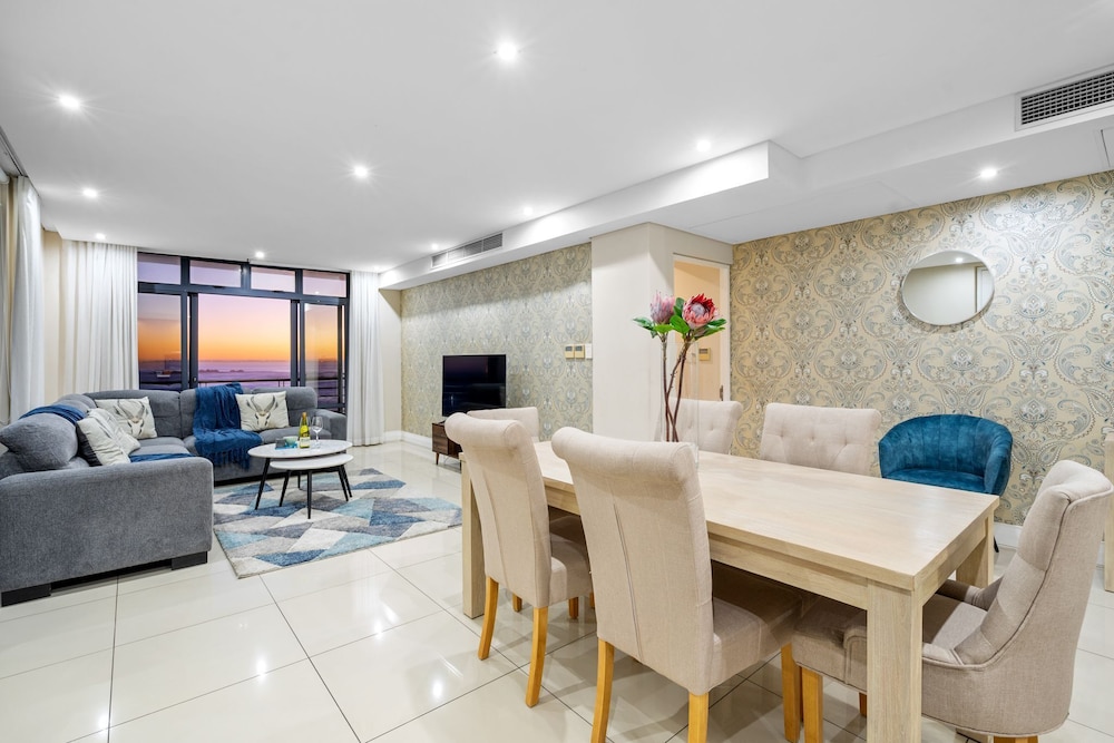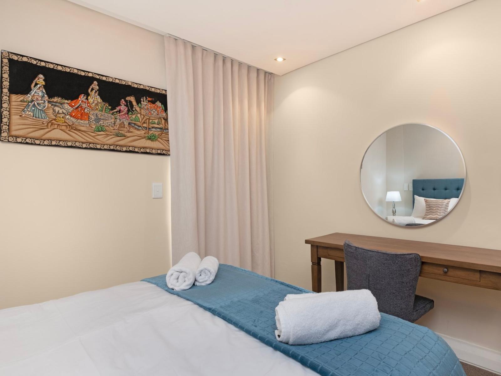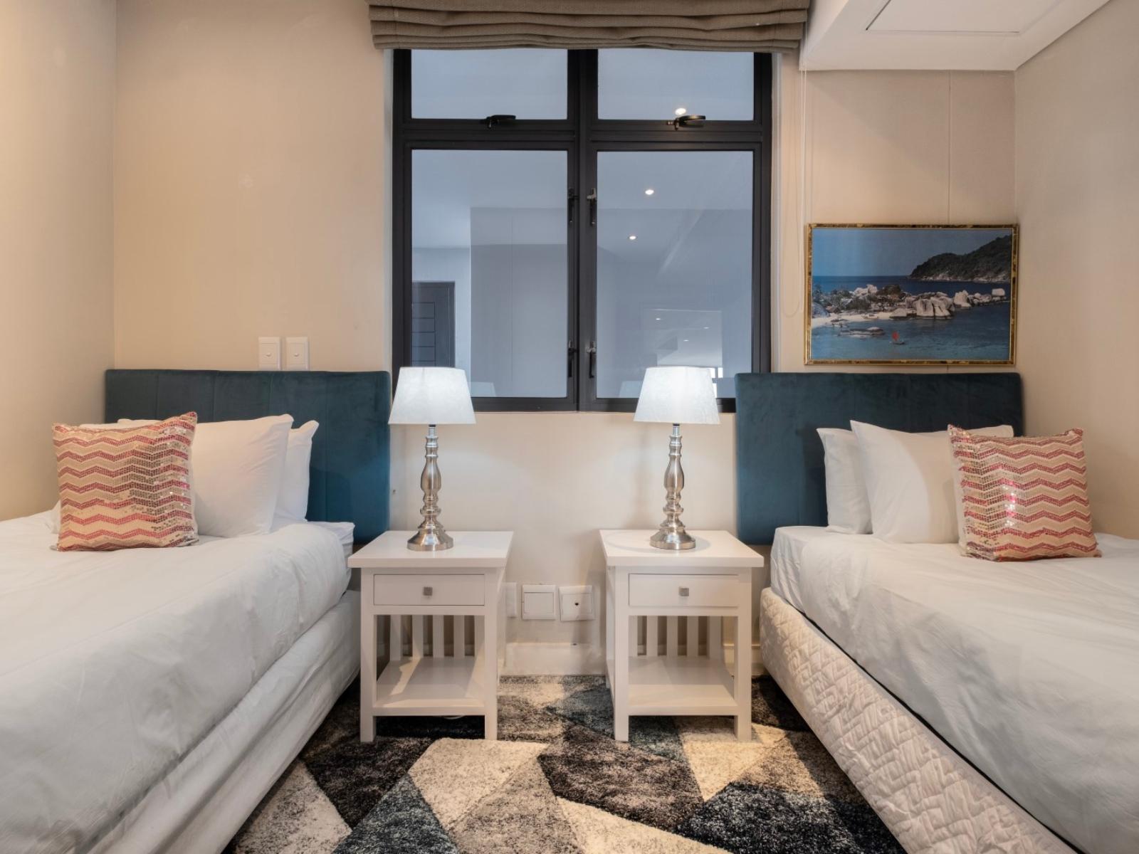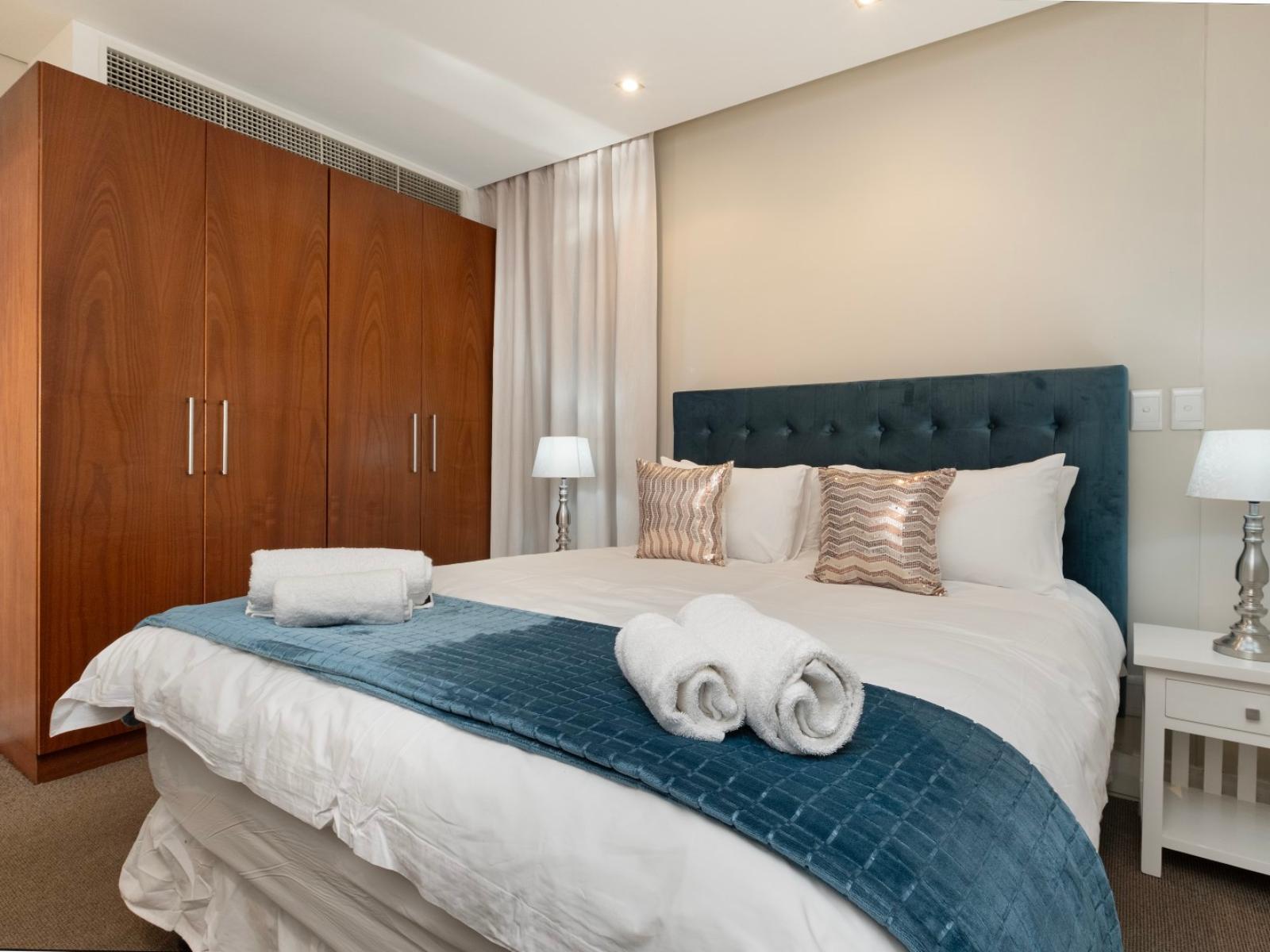 Allow yourself the pleasure of a stay in this elegant and private three bedroom holiday apartment in the shopping and lifestyle complex of Eden on the Bay in Big Bay, Bloubergstrand. This vacation package offers you a wonderful location in a secure complex, close to the Atlantic Ocean with views towards the beautiful Table Mountain.The charming main interior is open plan with the kitchen leading to the dining area and lounge. The kitchen with granite topped counters is fully equipped, including a kettle, fridge, microwave, duo washing machine/dryer and a built-in oven with a stove