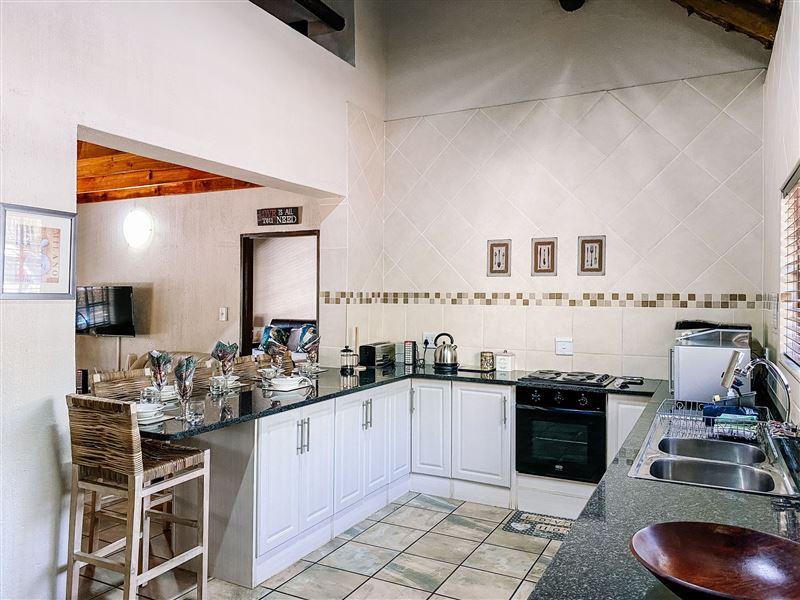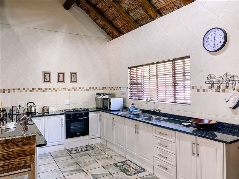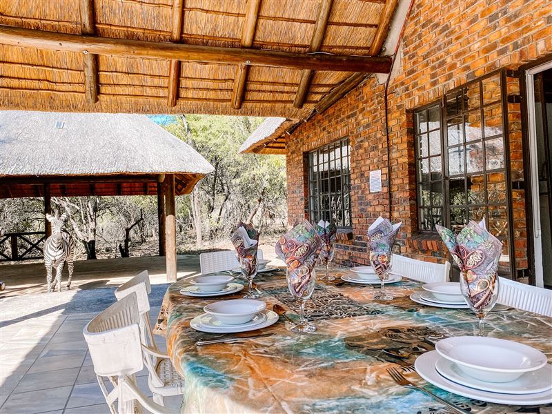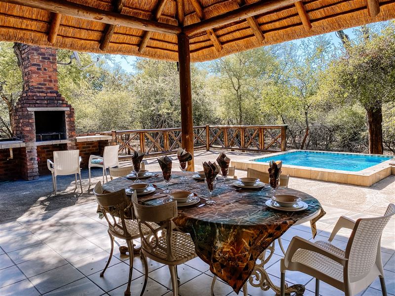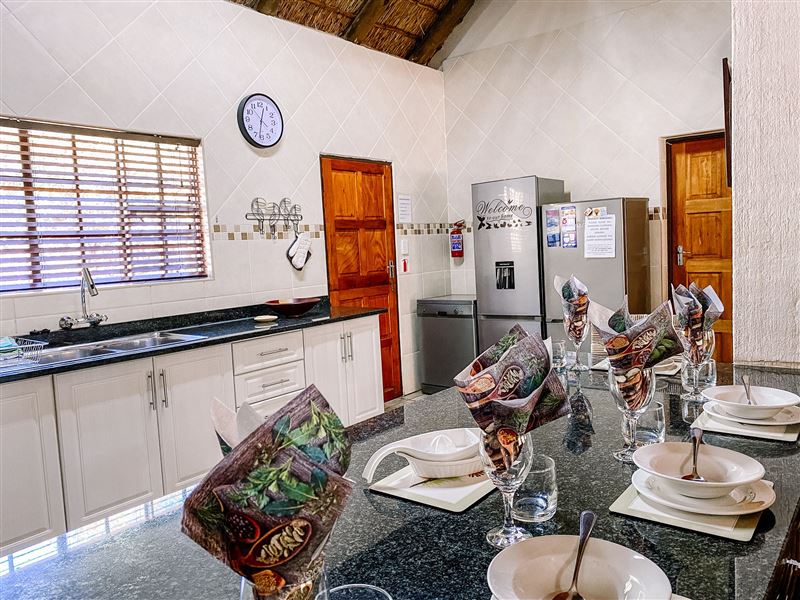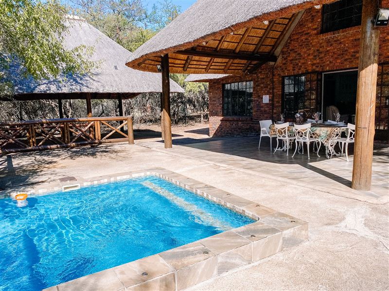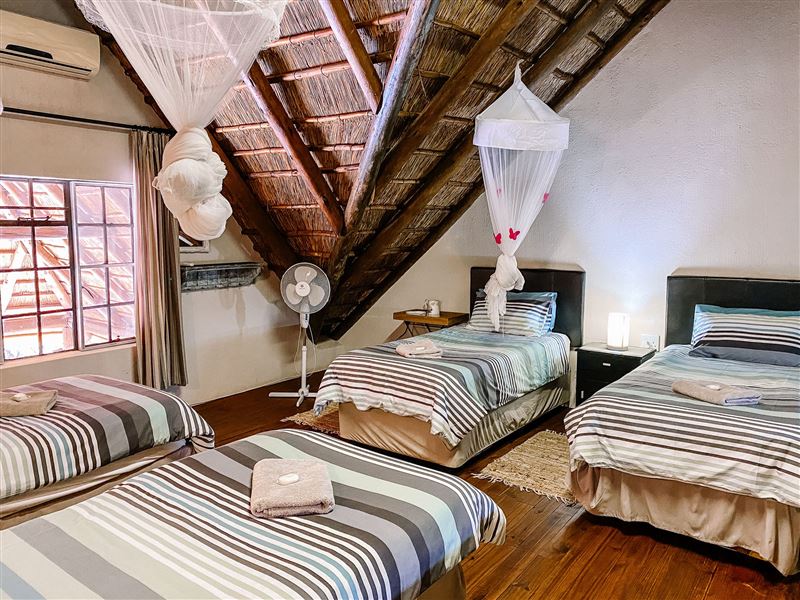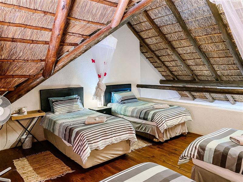 Escape@Butterfly is a thatched roof house situated in the popular Marloth Park Conservancy, just outside of the Kruger National Park. The house offers self-catering accommodation ideal for families and groups looking for a spot where you can enjoy game viewing, without even having to leave the property. The house comprises two spacious bedrooms, one loft bedroom, two bathrooms and an open-plan living area. The spacious kitchen includes all modern cooking appliances and facilities. A breakfast bar forms a border between the kitchen and lounge area. The lounge has a TV and comfortabl