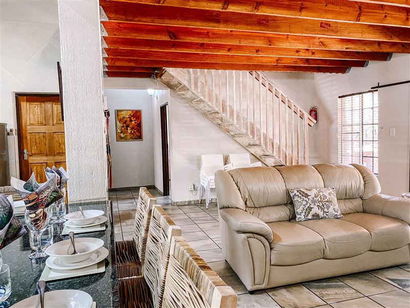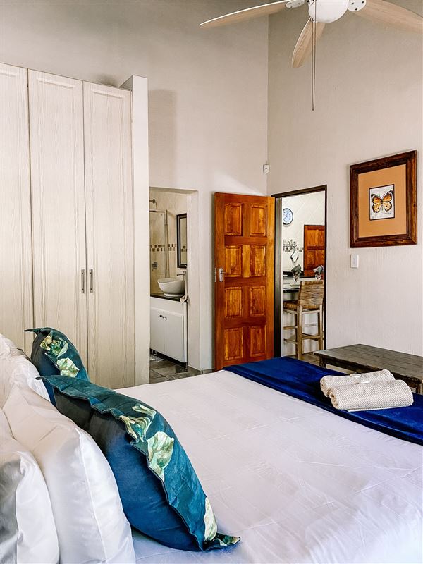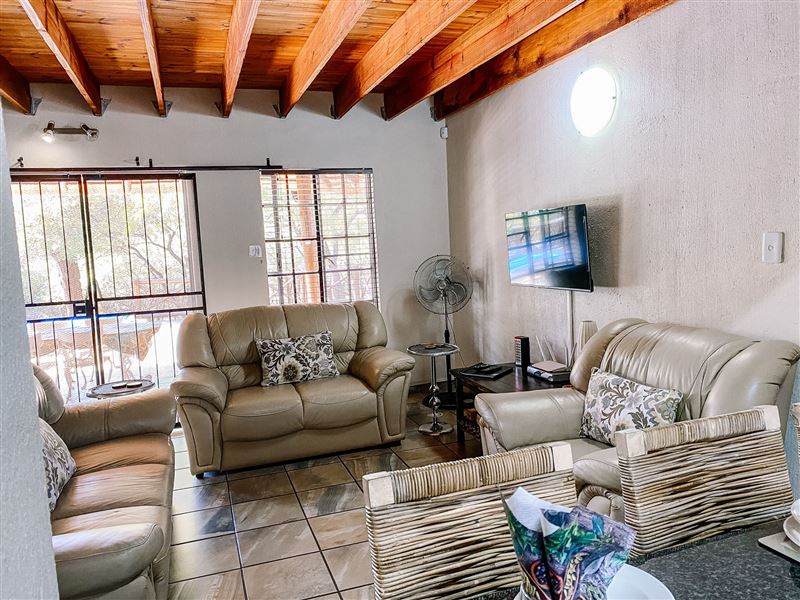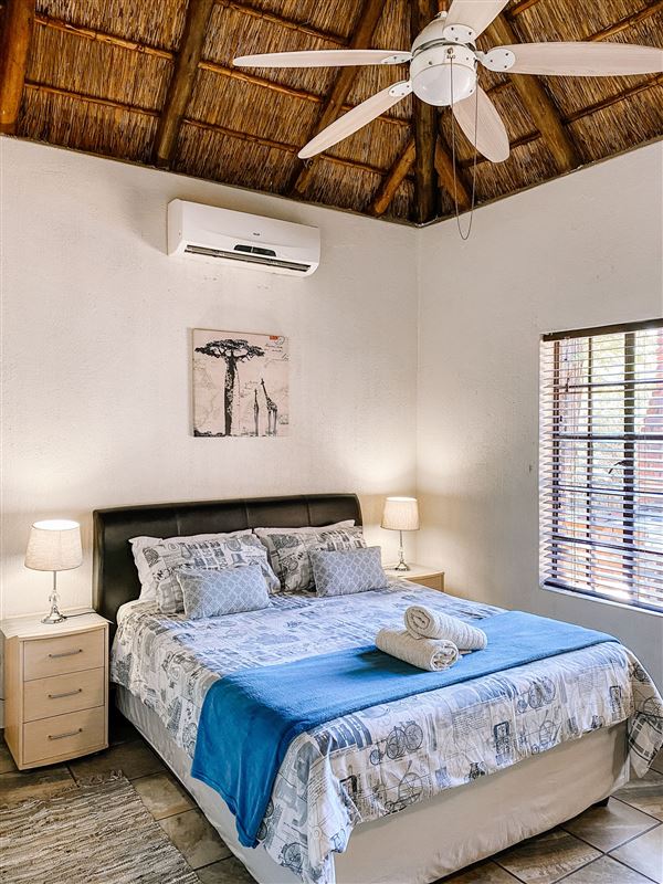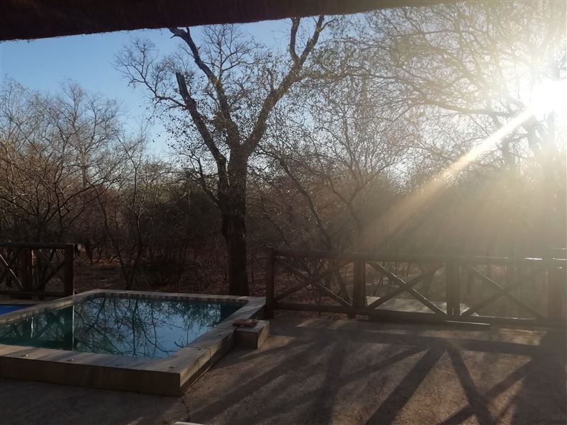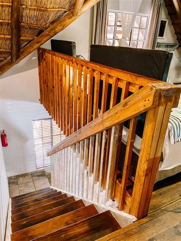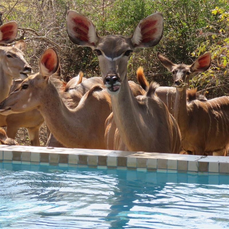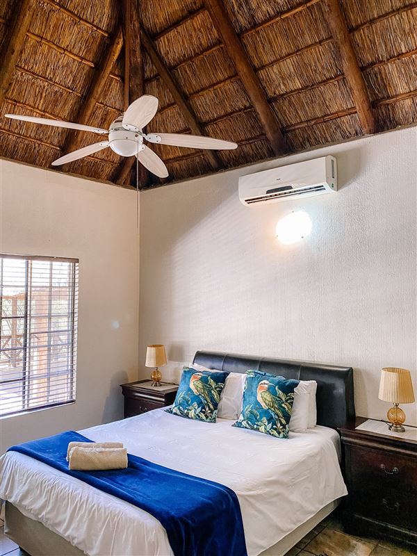 Escape@Butterfly is a thatched roof house situated in the popular Marloth Park Conservancy, just outside of the Kruger National Park. The house offers self-catering accommodation ideal for families and groups looking for a spot where you can enjoy game viewing, without even having to leave the property. The house comprises two spacious bedrooms, one loft bedroom, two bathrooms and an open-plan living area. The spacious kitchen includes all modern cooking appliances and facilities. A breakfast bar forms a border between the kitchen and lounge area. The lounge has a TV and comfortabl