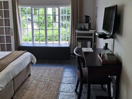 Eshowe Hills Secretary's Cottage is situated on the Eshowe Hills Golf Estate on the majestic, rolling hills in Northern KwaZulu-Natal, southeast of the town of Eshowe which was the historic capital of Queen Victoria's Zululand.Accommodation in the Secretary's Cottage consists of three double bedrooms, each with en-suite bathrooms and separate entrances. The bedrooms are tastefully furnished in vintage style and the fully fitted bathrooms have black and white tiles, luxuriously deep baths, showers and twin basins. These rooms all have access to a comfortable sitting room with a fl