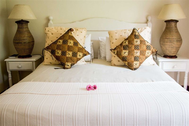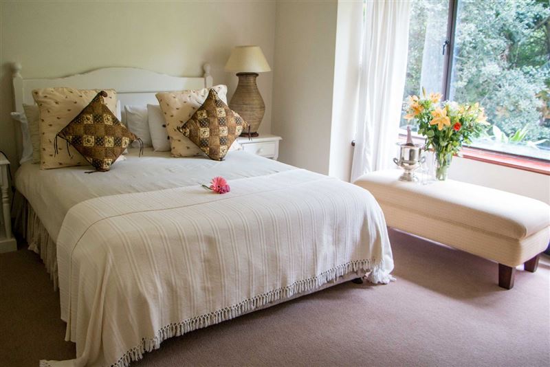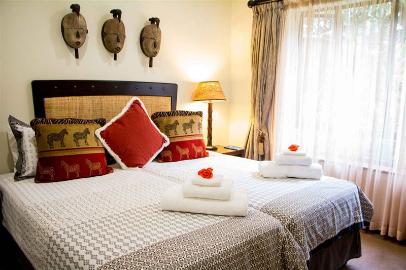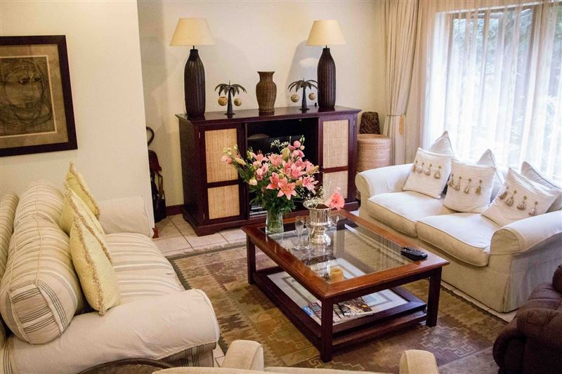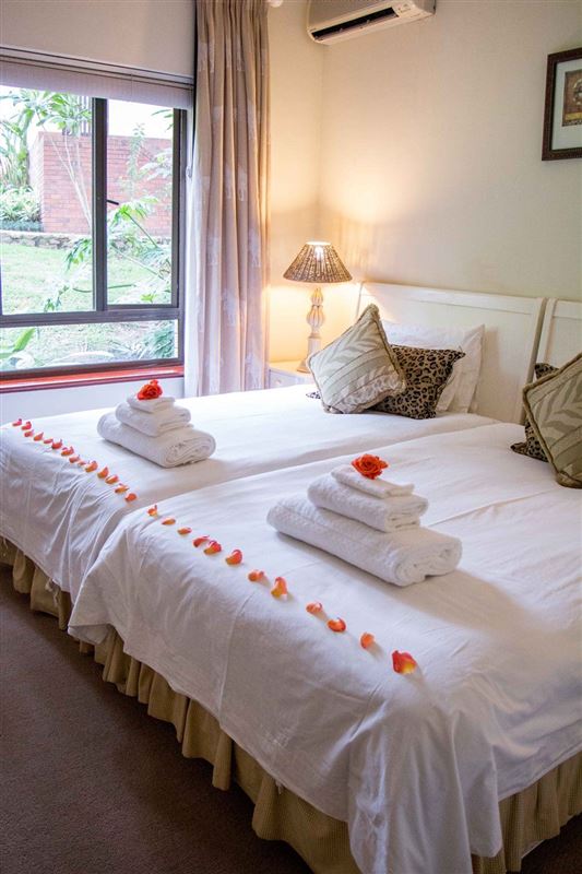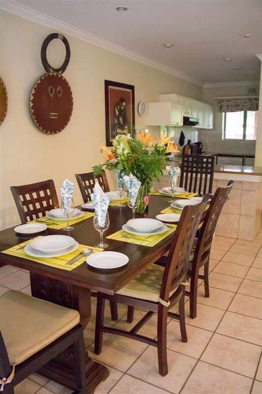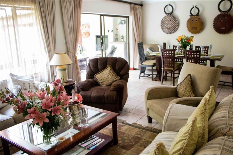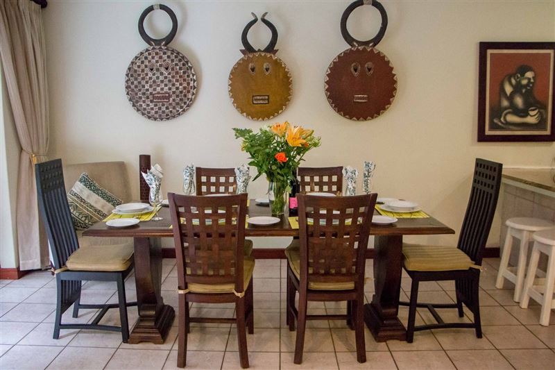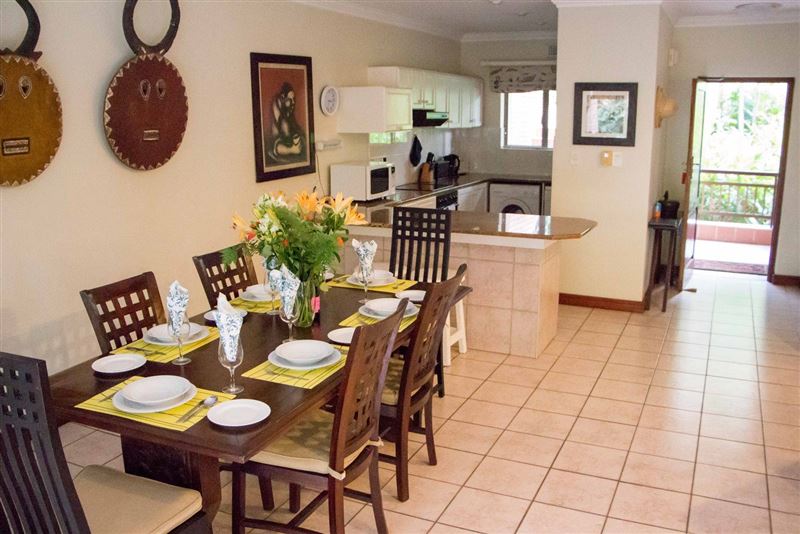 Surrounded by lush indigenous vegetation, Forest Glen is an exclusive three bedroom holiday villa in Selborne Park Golf Estate.The living room is in an open-plan set up and flows from the lounge into the dining area with six-seater table and out to the comfortably furnished balcony which overlooks the garden area.The magnificent and spacious lounge is furnished with a plush lounge suite and decorated in whites and browns. The kitchen, is just off the dining room and fully equipped with modern appliances; making self-catering a pleasure.The main bedroom is fu