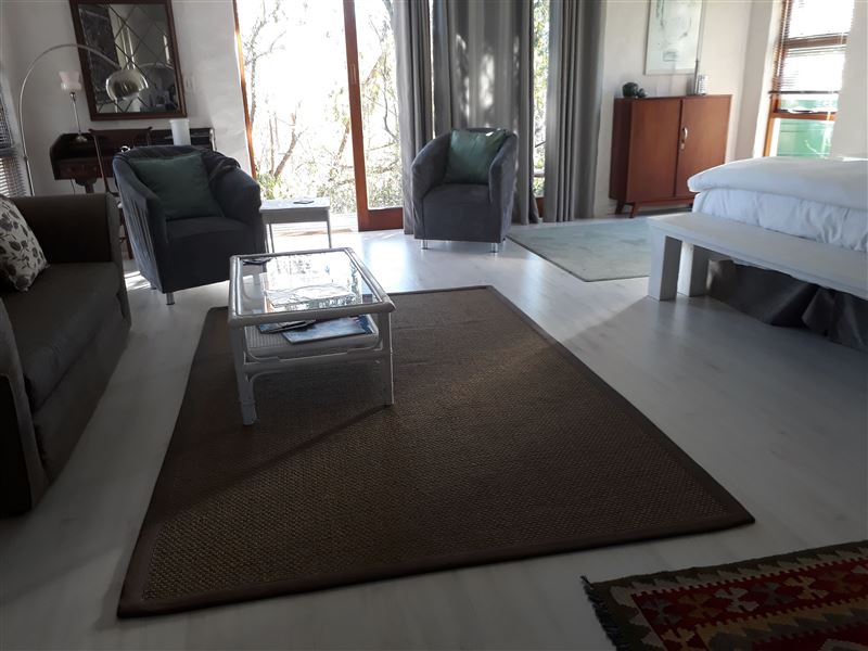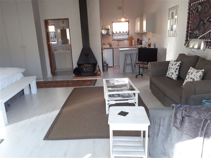 Fynbos Garden Suite is a tranquil hideaway in the heart of the famous Garden Route. This is the perfect location from which to explore the surrounding forests, beaches, adventure activities and golf courses. It is ideal for a couple or family of four. .The suite comprises a lounge area with a recently installed laminated floor, with a fire place, a king-size bed, fully equipped kitchenette, sleeper couch and en-suite bathroom with a shower, where the shower has been re-tiled with superior tiles. The suite leads out onto a deck with a table where you can simply enjoy the view or eat al fres