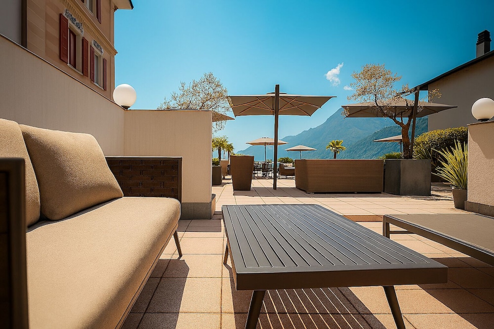 The "Meridiana" offers the charm of a historic Swiss-Italian Ticinese house with walls from the Middle Ages blended with modern architecture and facilities. The rooms and the large terrace offer a direct view to the lake. Make use of the wellness and fitness facilities including an indoor swimming pool a sauna steam baths a whirlpool and a bike rental. Relax in the reading room in a 13th-century tower with fireplace and enjoy the cosy atmosphere in the breakfast room with its rustic courtyard. Around the hotel you find a charming village with many cosy "Ristoranti" shops and a harbour. Covered parking lots are available in the immediate vicinity.