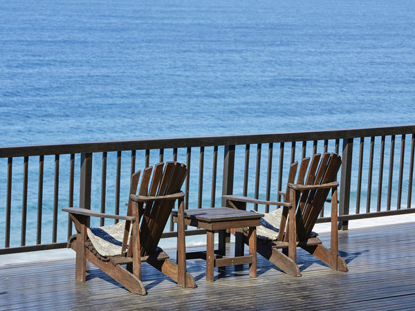 The love seat on the newly refurbished wooden deck overlooking the ocean is the perfect place for romantic evenings, drinking a glass of bubbly, watching the moon rise like a big orange ball over the ocean.