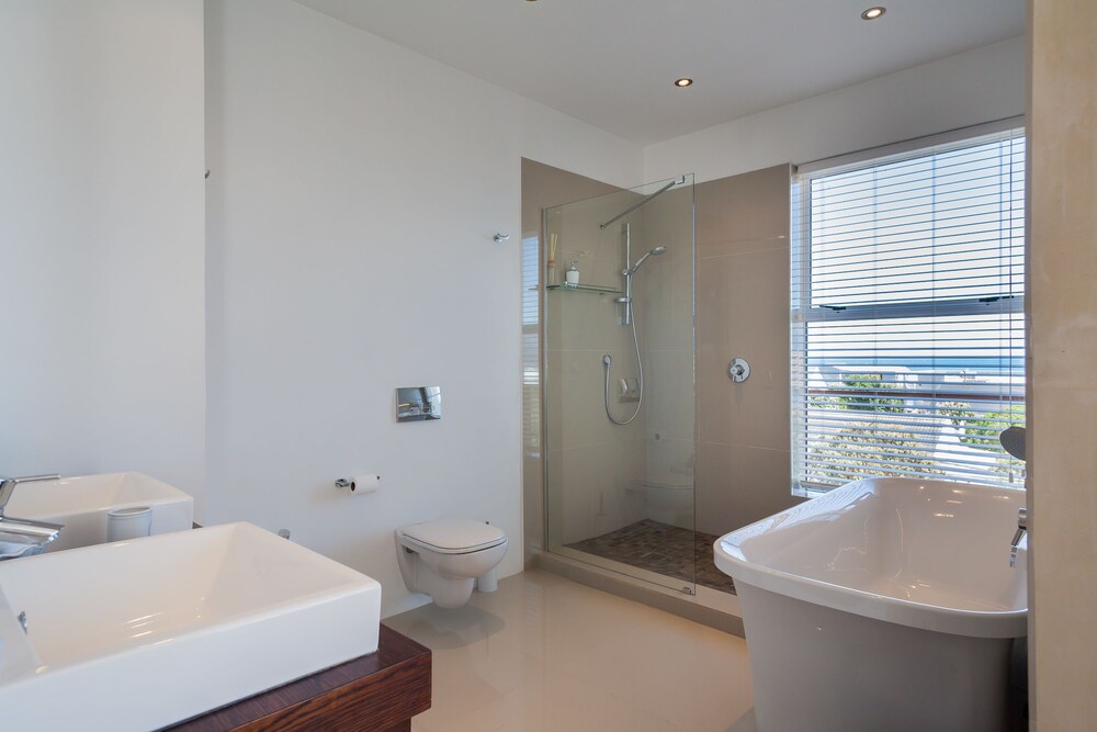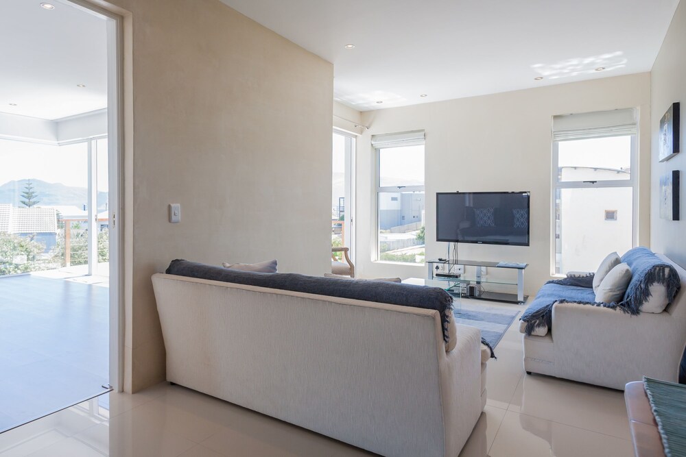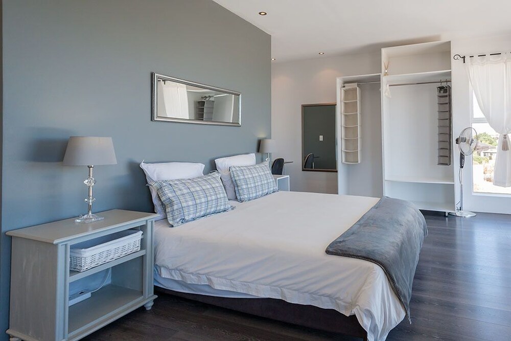 Greenways Beach House is situated in Kommetjie. Kommetjie is a town at the west end of the Cape Peninsula and is a popular surfing spot.This is a large modern four-bedroom house. All bedrooms have en-suite bathrooms and lovely seaviews. The house has two storeys; downstairs, is the open-plan living area featuring a fully equipped, a dining area seating six people and a lounge. The kitchen and dining areas leads out to a patio with outdoor furniture and braai facilities, and overlooks the sparkling swimming pool. The house has Wi-Fi and DStv access. Visitors to the area