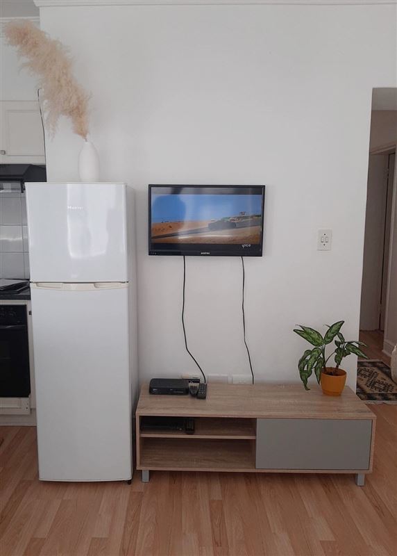 The apartment has one bedroom with two single beds, an en-suite bathroom, an open-plan living area with a TV, and a fully equipped kitchen. All linen and towels are provided.