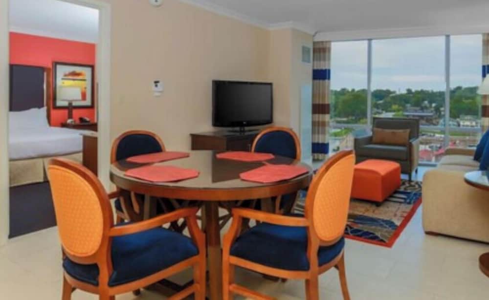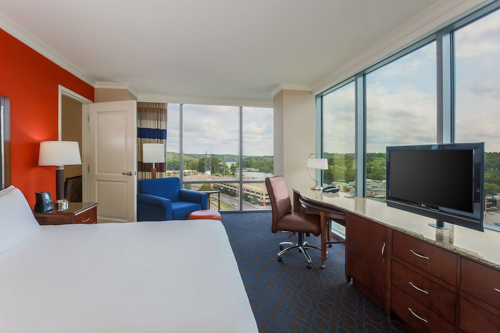 Located in Branson, Hilton Branson Convention Center is minutes from Gone with the Wind Museum and Branson's Scenic Railway. This hotel is within close proximity of Owen's Theater and Patricia's Victorian House.Rooms Make yourself at home in one of the 294 air-conditioned rooms featuring refrigerators and MP3 docking stations. Your room comes with a pillowtop bed. LCD televisions are provided for your entertainment. Private bathrooms have designer toiletries and hair dryers. Be sure to enjoy recreational amenities, including an outdoor pool, an indoor pool, and a fitness center. Additional amenities include wireless Internet access (surcharge), concierge services, and shopping on site.Dining Satisfy your appetite at the hotel's restaurant, which serves breakfast, lunch, and dinner, or stay in and take advantage of room service (during limited hours). Relax with your favorite drink at a bar/lounge or a poolside bar.Business, Other Amenities Featured amenities include a business center, express check-in, and express check-out. Event facilities at this hotel consist of conference space and meeting rooms. Self parking (subject to charges) is available onsite.