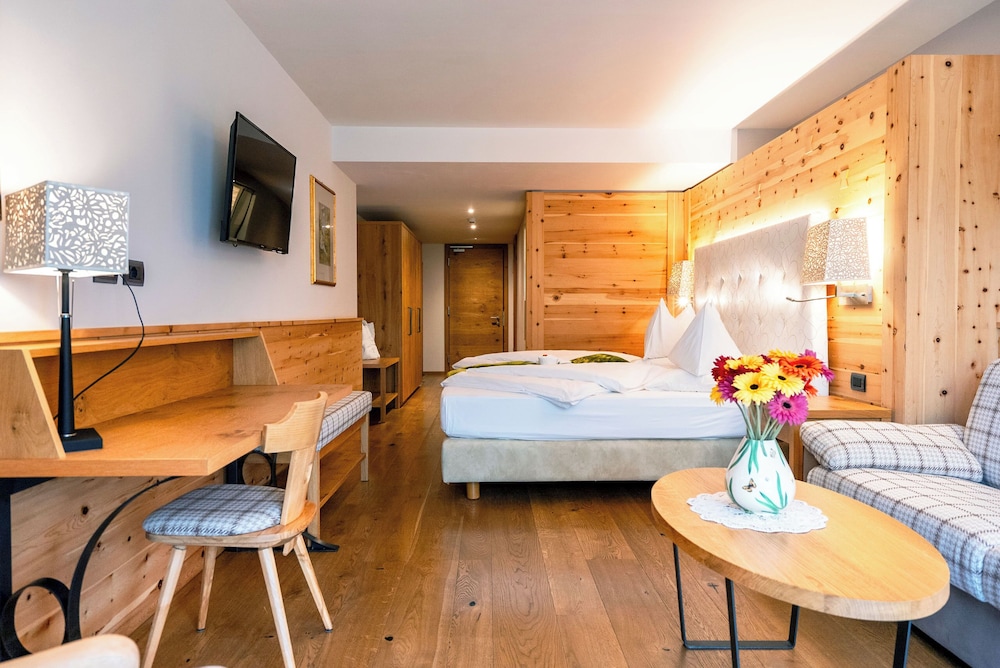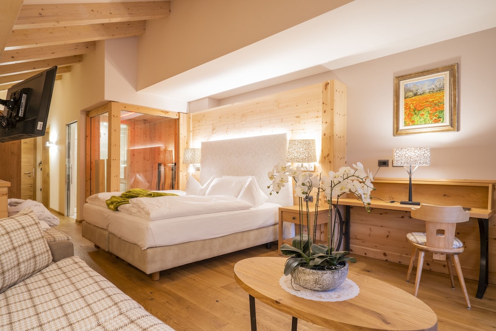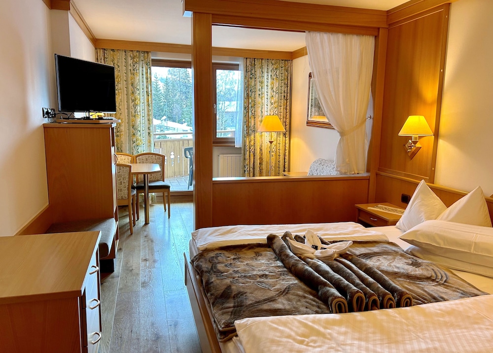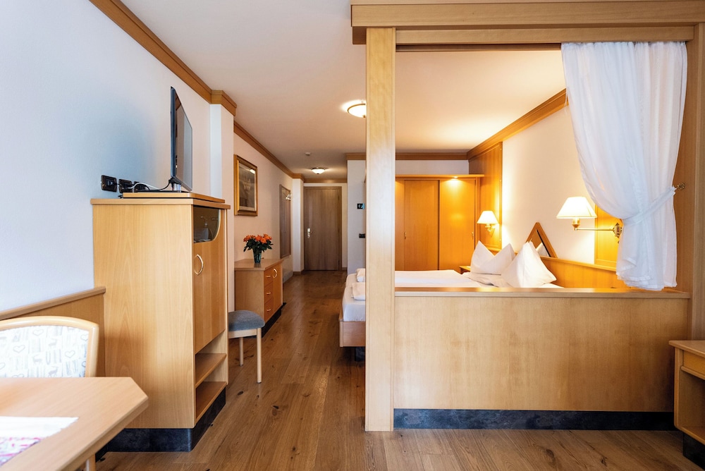 Offering a free wellness centre and gym Hotel Cesa Tyrol is in Canazei and has a free ski bus to the Belvedere slopes 700 metres away. Its restaurant is open at lunch and dinner.Every room has a furnished balcony overlooking the garden. You will also find free toiletries in the en suite bathroom and a flat-screen satellite TV. Wi-Fi is free at the bar and reception.Homemade cakes croissants and ham and cheese are part of the buffet breakfast each morning. Local and national dishes are available at the restaurant. Drinks and snacks are available from the bar.At Cesa Tyrol Hotel you can treat yourself to a sauna Turkish bath and sensory shower all free of charge. There is also Kneipp hydrotherapy treatments for free.The hotel has 2 terraces 1 for sunbathing and the other at the hotel entrance. You will also find a tennis court and free car park.