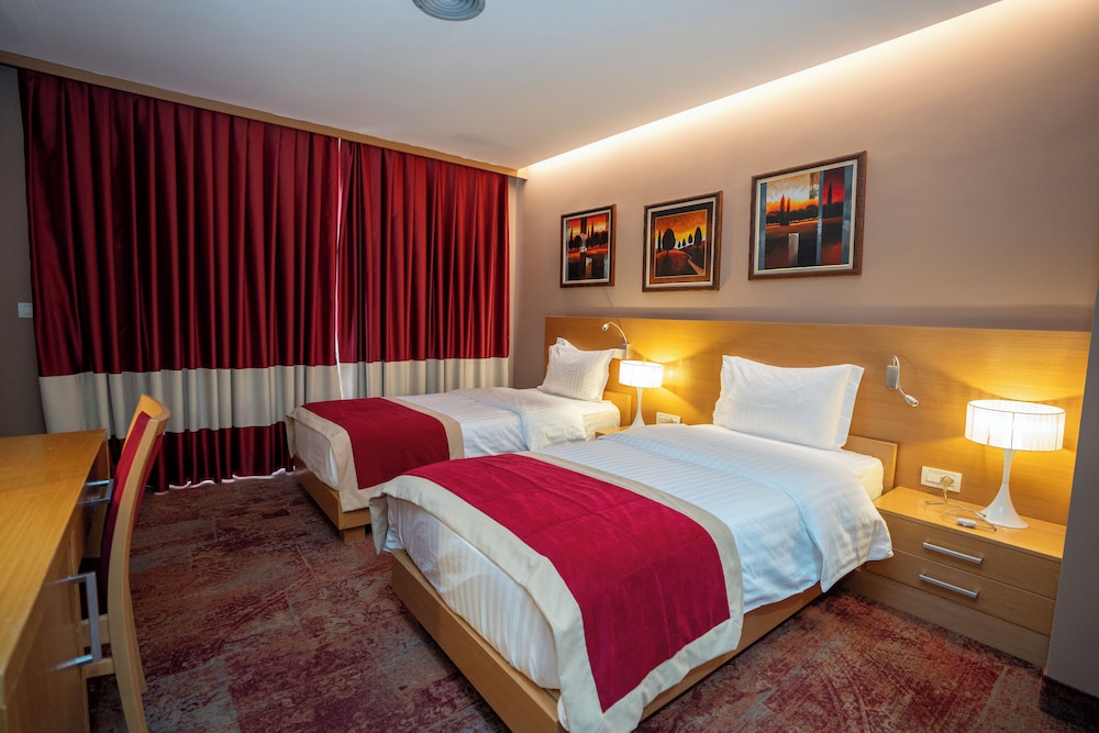 Hotel Colosseo is located in the city of Shkoder in a pedestrian area surrounded with houses bars restaurants pubs and night clubs. A fitness centre an indoor swimming pool massage facilities and a sauna are at guests' disposal free of charge. On-site restaurant serves local specialties.Rooms and suites at the Colosseo are air-conditioned and feature an LCD TV with satellite channels a desk and a chair as well as a minibar and a safe. En-suite bathrooms feature a bidet a shower and a hairdryer. Some rooms feature a balcony.The hotel lobby provides free Wi-Fi access and parking in front of the hotel is free for all guests. Breakfast is served daily at the hotel restaurant and room service is available. Dry cleaning laundry and ironing facilities can be requested at the front desk.Shkoder is one of the oldest towns in Albania as well as an important cultural and economic centre. The legendary castle of Rozafa known also as Rozafati can be reached in a short walk.Main Bus Station is 200 metres from the Colosseo Hotel. Tirana and Tirana Airport can be reached in 80 km. The coast is 30 km away.