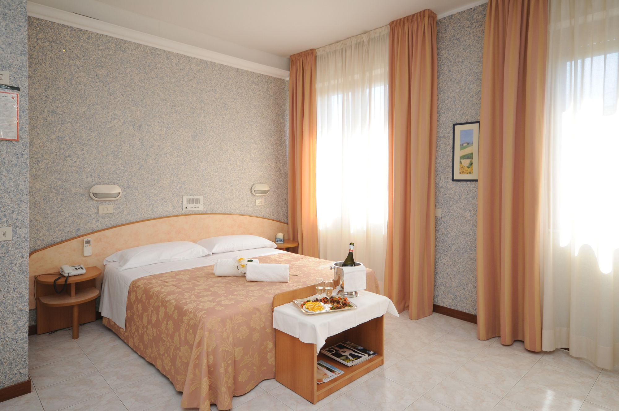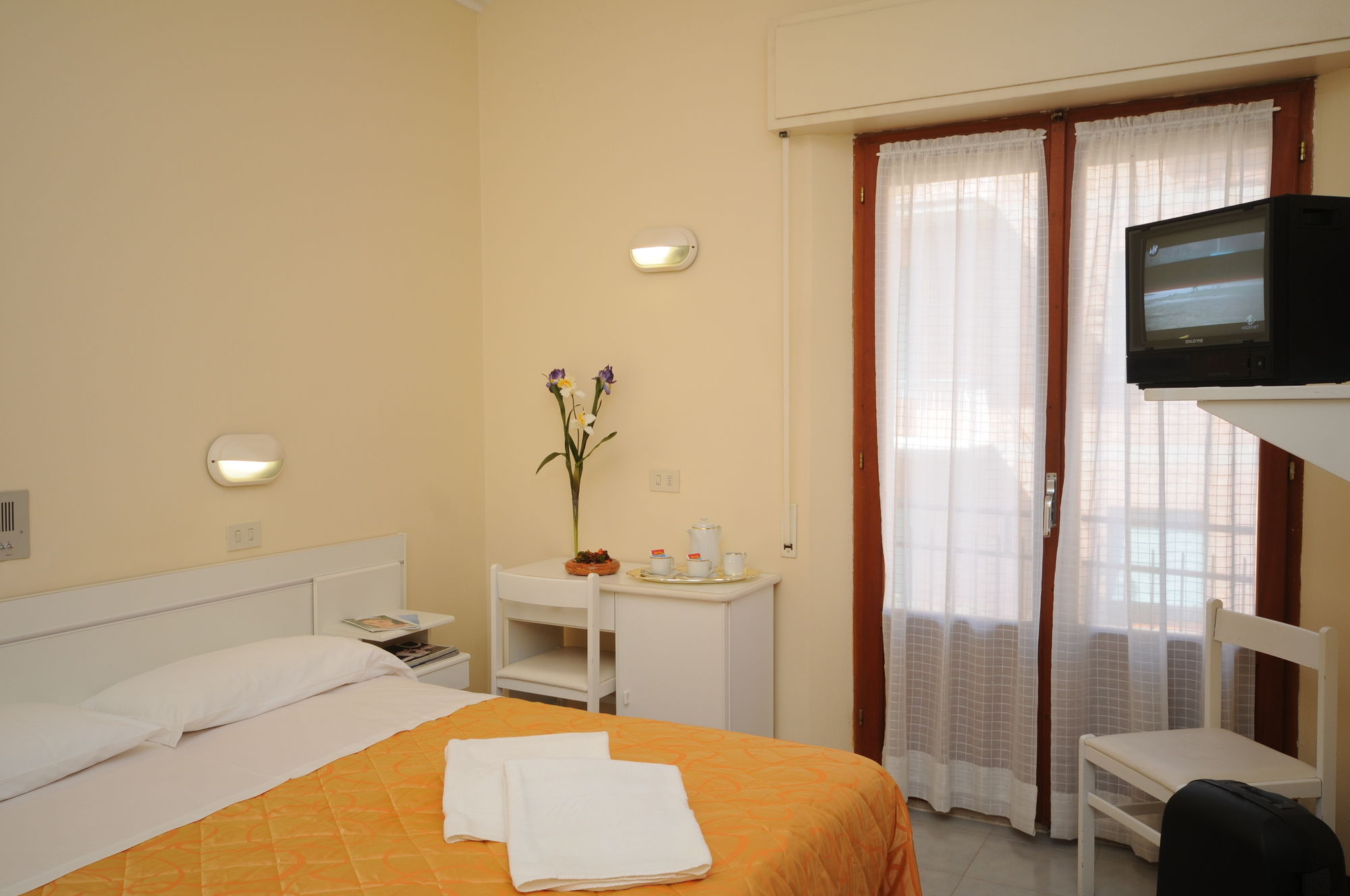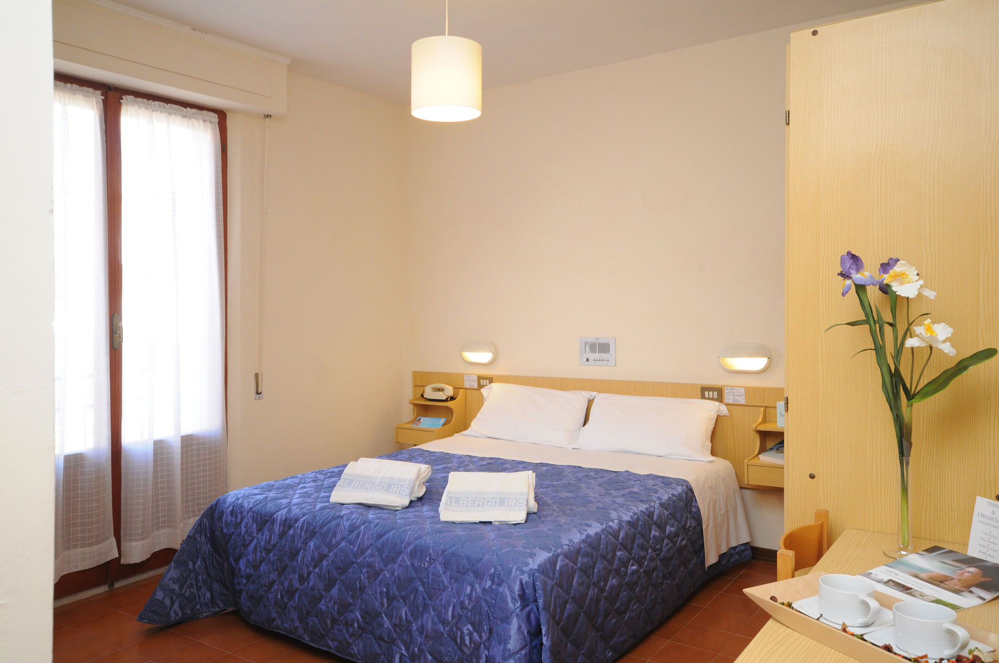 The hotel has a central location in Chianciano Terme, halfway between the thermal spas and the town's historic centre. The A1 motorway is 15 min' drive away.It is a family-run hotel offering panoramic views across the lakes of Chiusi, Montepulciano and Trasimeno from its rooftop sun terrace. The hotel has a spacious, air conditioned dining hall, lounge area, conference hall, elevator, solarium, garden and ample parking with attendant.All rooms have private bathroom, telephone, balcony, radio music, heating and TV.