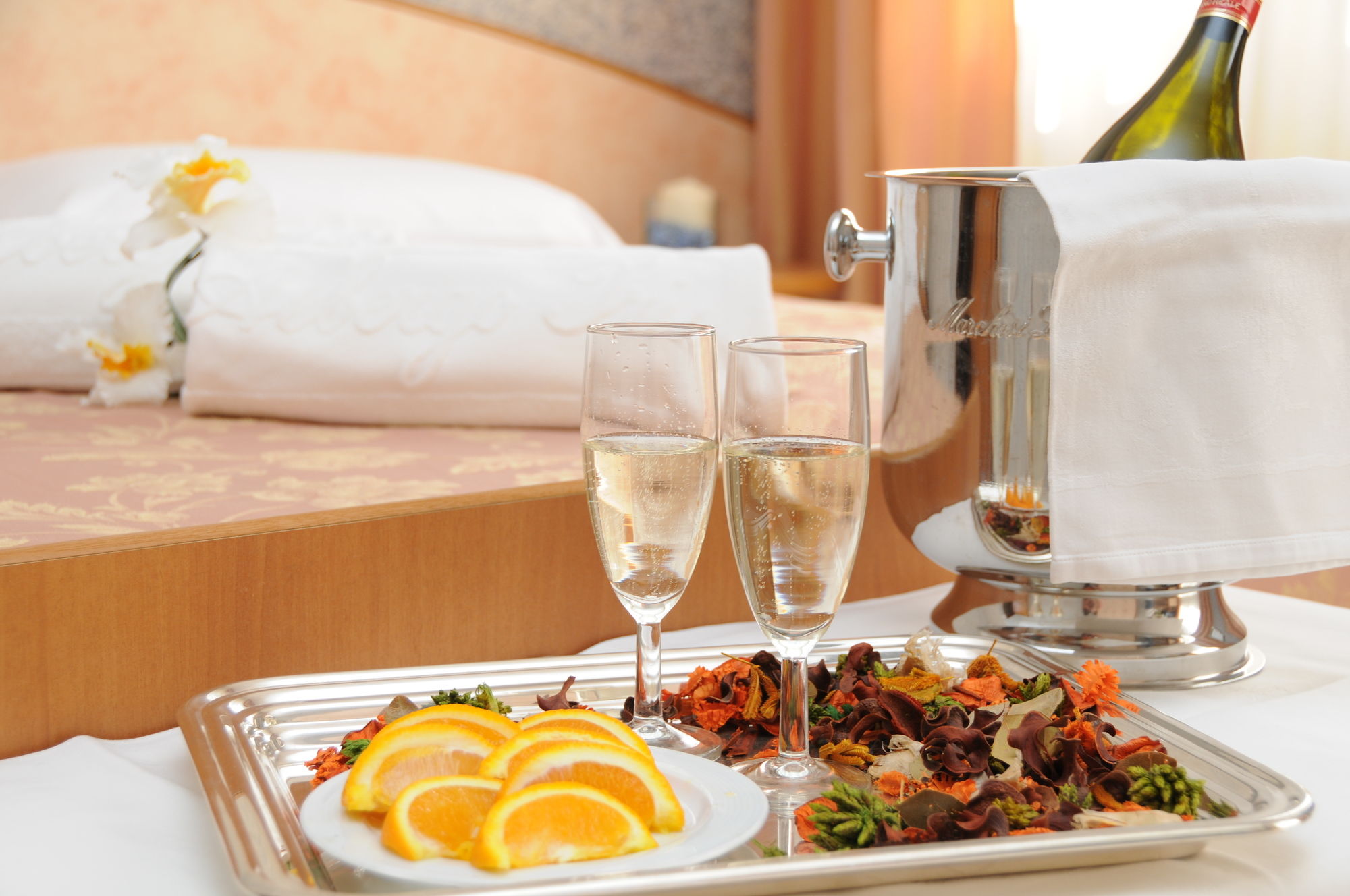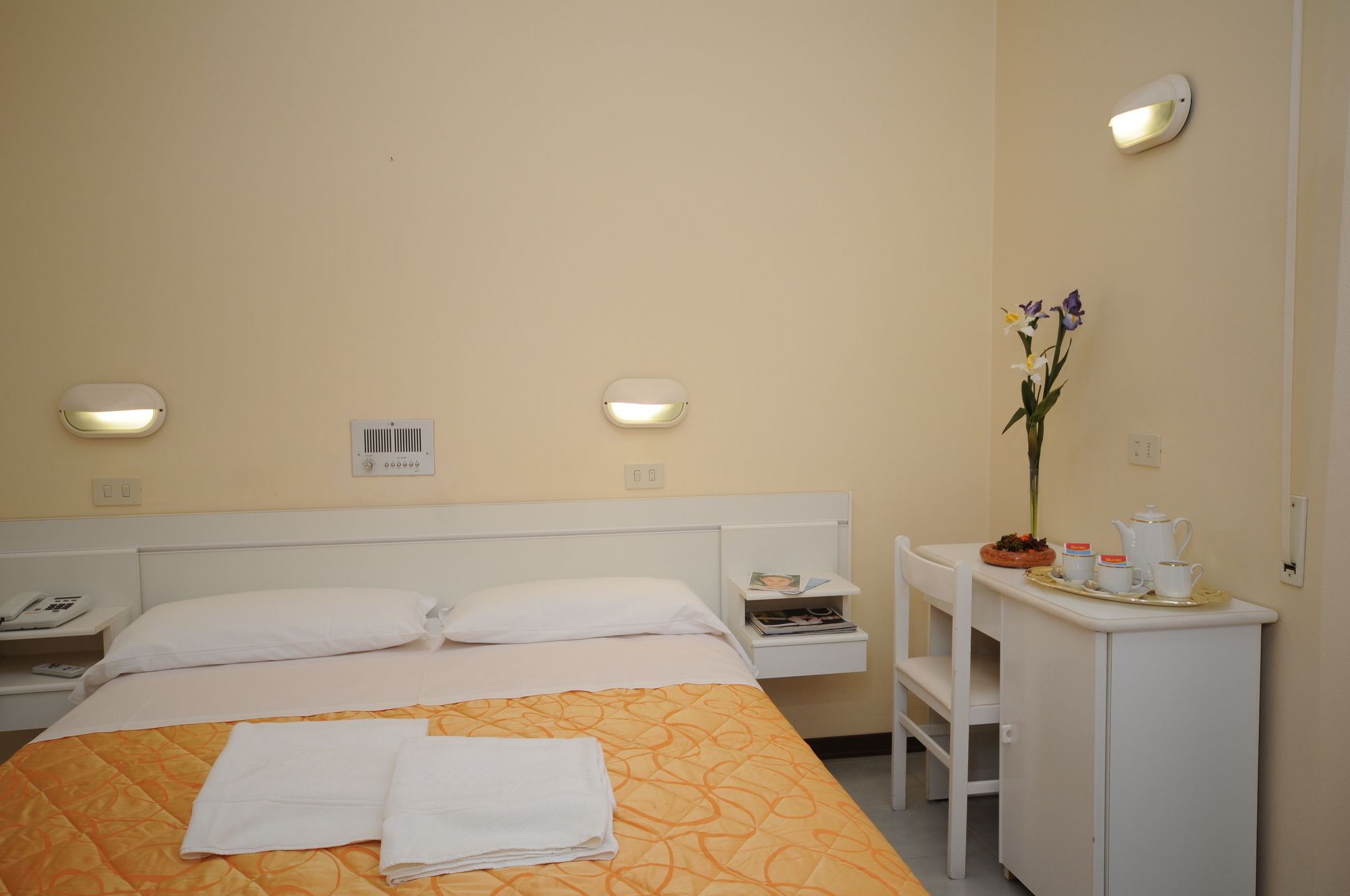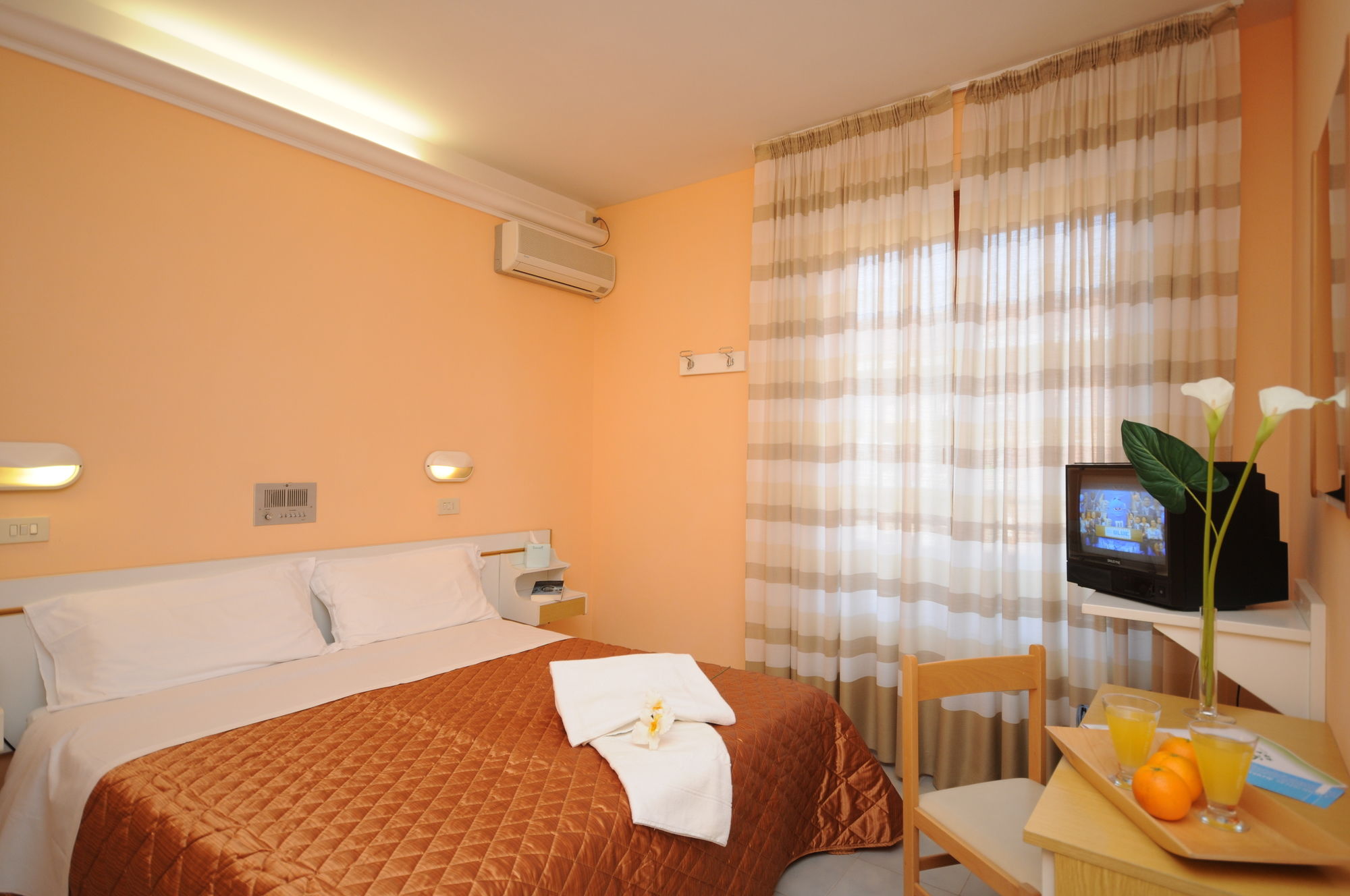 The hotel has a central location in Chianciano Terme, halfway between the thermal spas and the town's historic centre. The A1 motorway is 15 min' drive away.It is a family-run hotel offering panoramic views across the lakes of Chiusi, Montepulciano and Trasimeno from its rooftop sun terrace. The hotel has a spacious, air conditioned dining hall, lounge area, conference hall, elevator, solarium, garden and ample parking with attendant.All rooms have private bathroom, telephone, balcony, radio music, heating and TV.