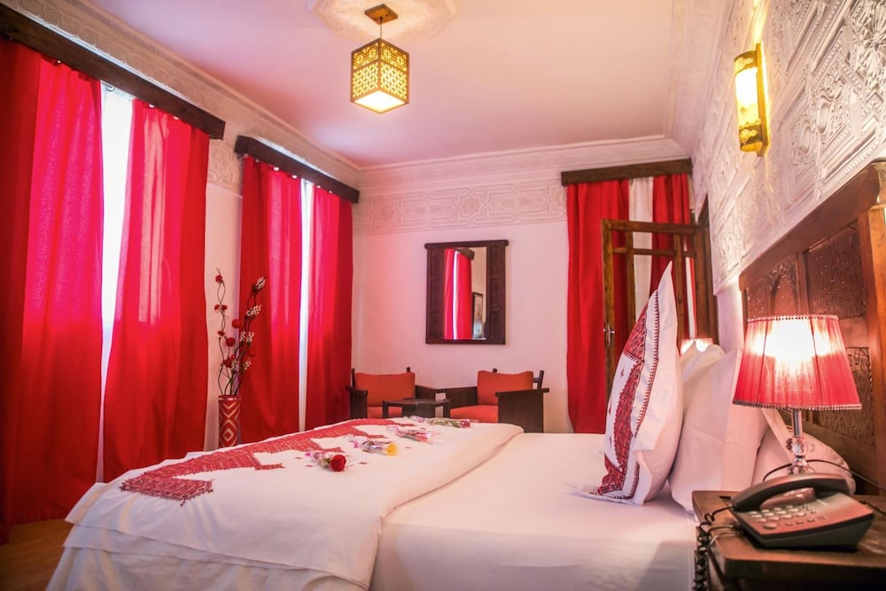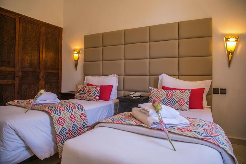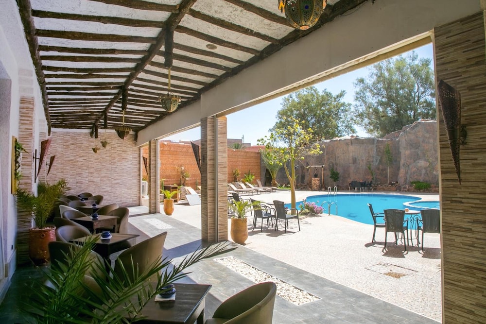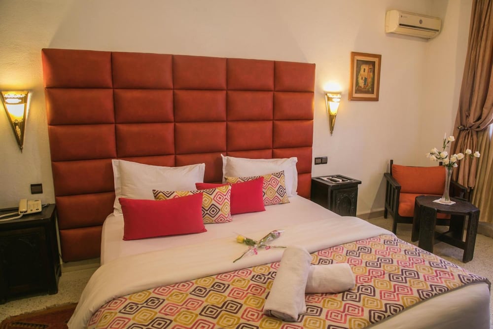 The hotel is located in the city centre, 5 minutes' walk from the Palais des Congres. Ouarzazate Airport is situated at a distance of approximately 6 km.The hotel offers 68 fully renovated guest rooms, built with traditional Moroccan handicrafts. The rooms' wooden doors welcome holidaymakers, while decoration is simple with wooden furniture, iron-forged wall lamps and carpets. The hotel also has a restaurant available to guests, and the dining room looks out onto the swimming pool. This is one of the most charming hotels in Ouarzazate. The air-conditioned property features a lobby, currency exchange facilities, a bar, disco and car park.All hotel rooms are of different sizes and are equipped with a minibar, television, individually regulated air conditioning and heating and a telephone. Some have a balcony. The en suite bathrooms offer a bathtub or a shower, a hairdryer and welcome products. Rooms with double or king-size beds are available.Guests may take an invigorating dip in the outdoor swimming pool, whilst children can enjoy their own swimming area. Refreshments are provided at the poolside snack bar. Sun loungers and parasols have been laid out for use.The Moroccan breakfast is served in the form of a buffet. The lunch and dinner may be selected from the buffet or à la carte. Moroccan specialities and international cuisine are offered.
