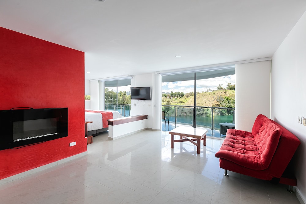 It is located 79 kms from Medellin and 40 minutes from Jose Maria Cordoba, JMC of Rionegro International Airport, with an average temperature of 19 º C. From the Hotel guests can visit two tourist regions with great attractions and options for rest and fun: the Guatapé and Peñol. Rooms have a minimalist style and colorful touch to allow a homely and friendly atmosphere will make guests feel at home, also the rooms have large windows that allows to appreciate the beautiful sunsets and landscapes that surround the property.