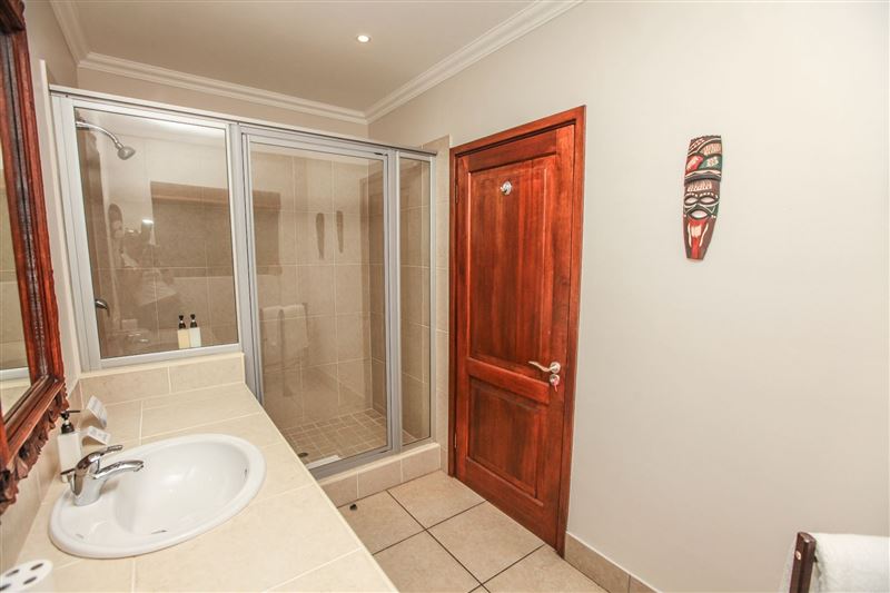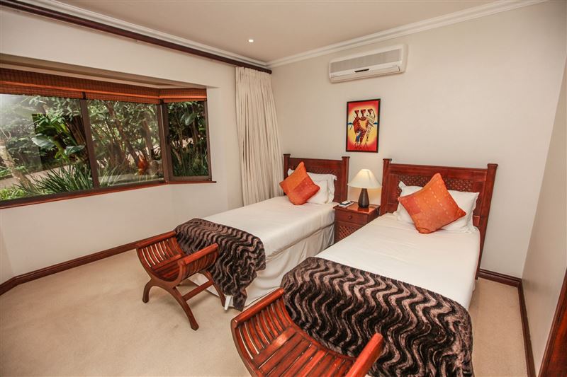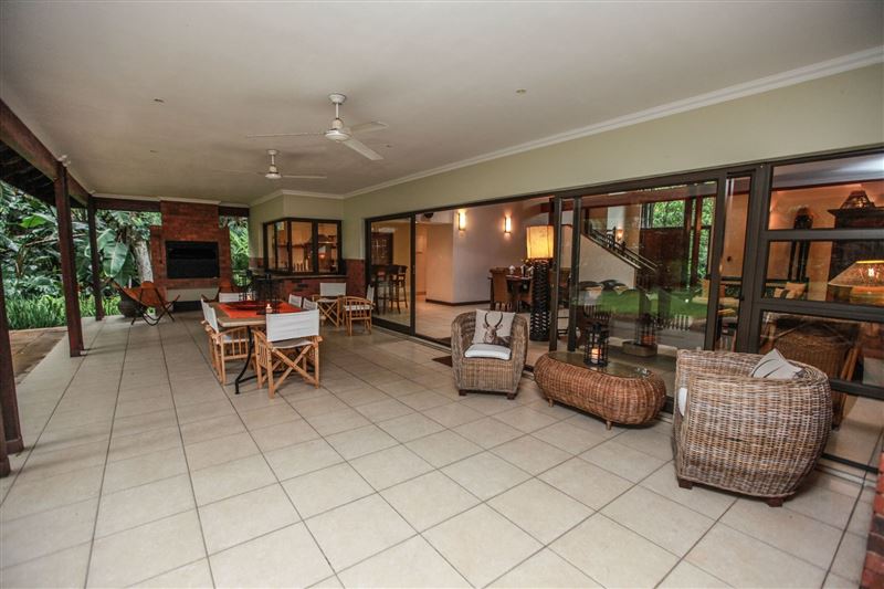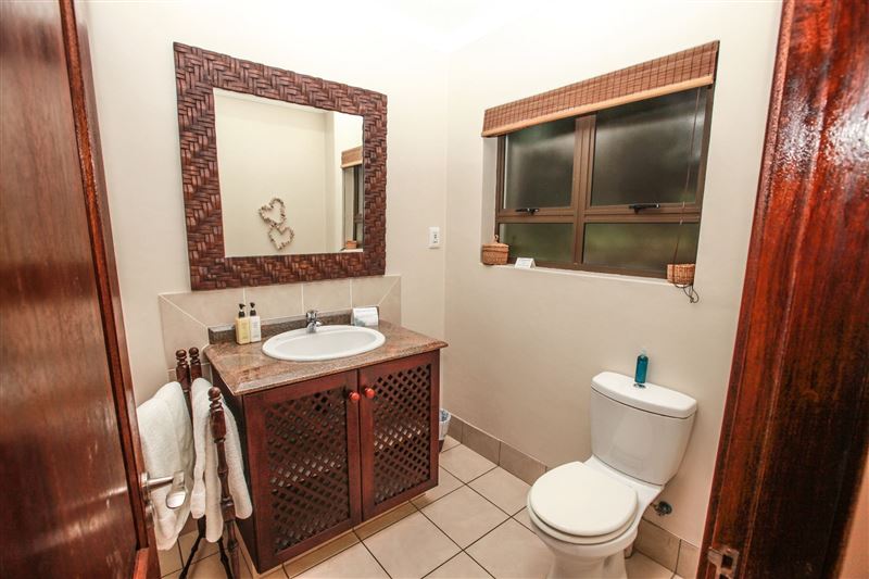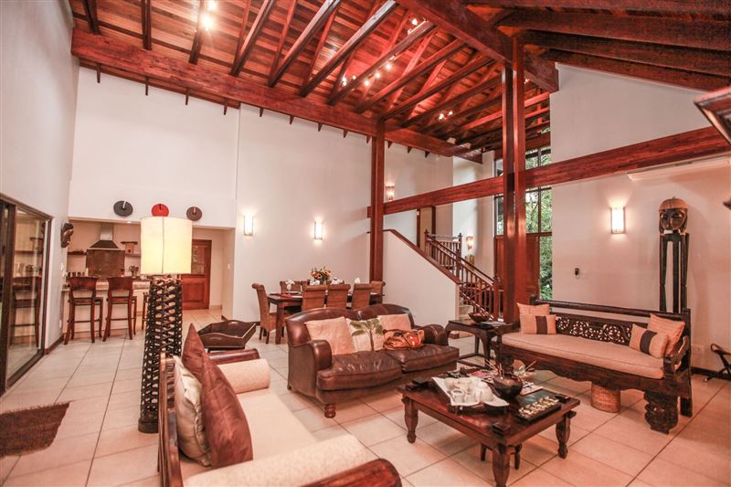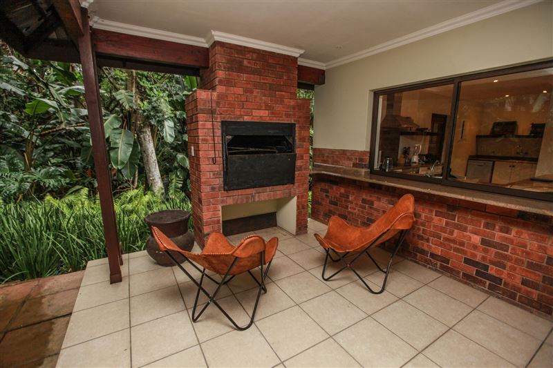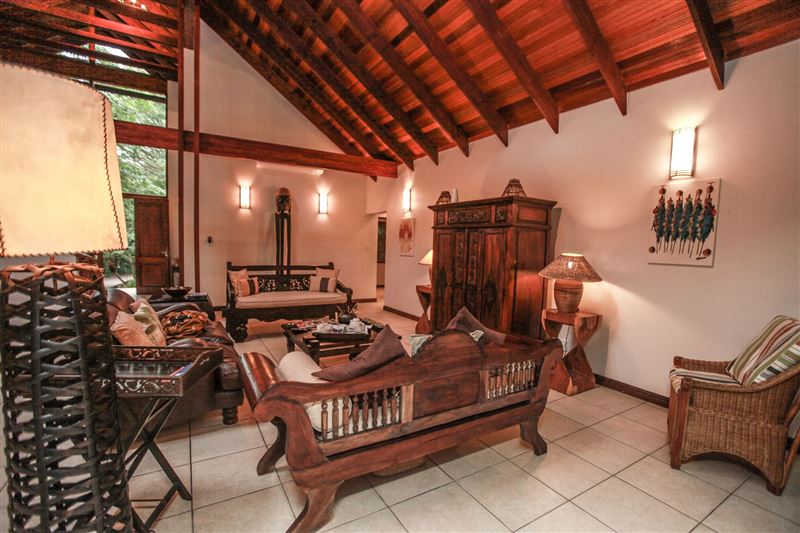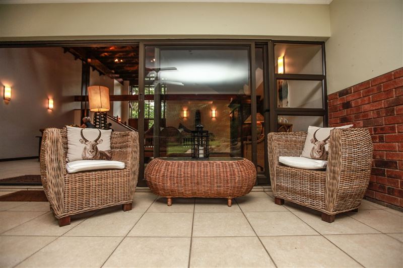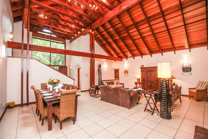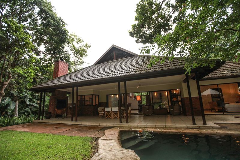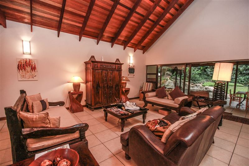 iMphiti Lodge is a three bedroom villa situated in Selborne Park Golf Estate on the South Coast of KwaZulu-Natal. The self-catering villa offers comfortable accommodation with all the modern luxuries for a family of six.The house has three spacious en suite bedrooms, a large open-plan living area, and lush garden. The open-plan lounge is elegantly furnished in dark wood and has large glass doors that open out to the garden area. The dining area, off the lounge, has an eight-seater dining room table. Semi-divided from the lounge and dining area by a small breakfast nook, is a spacio