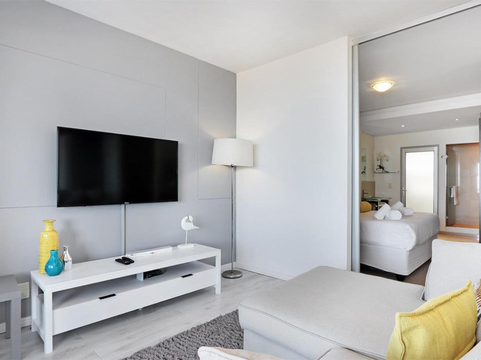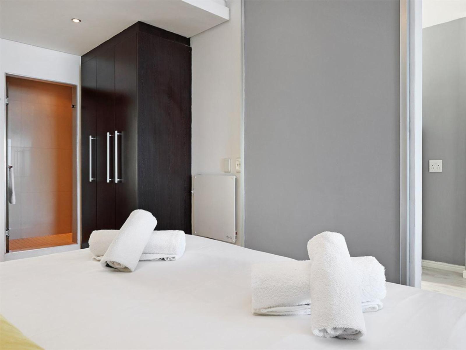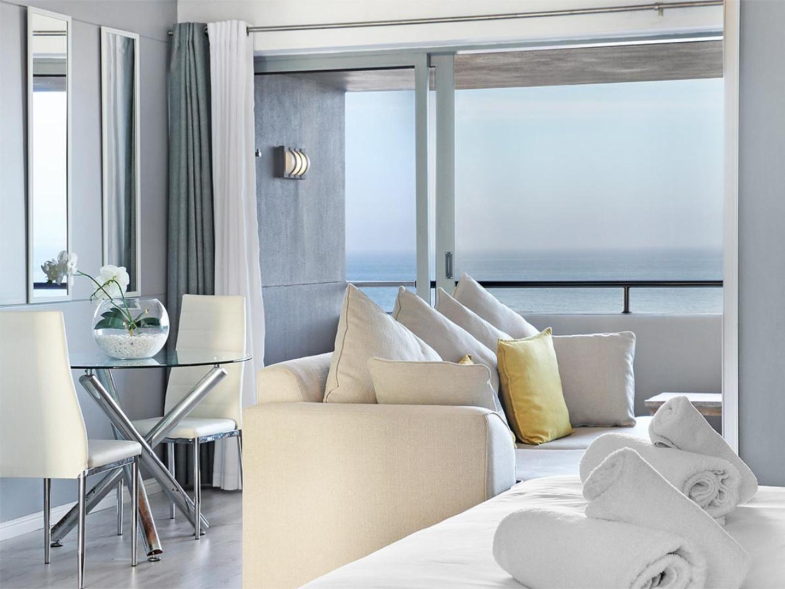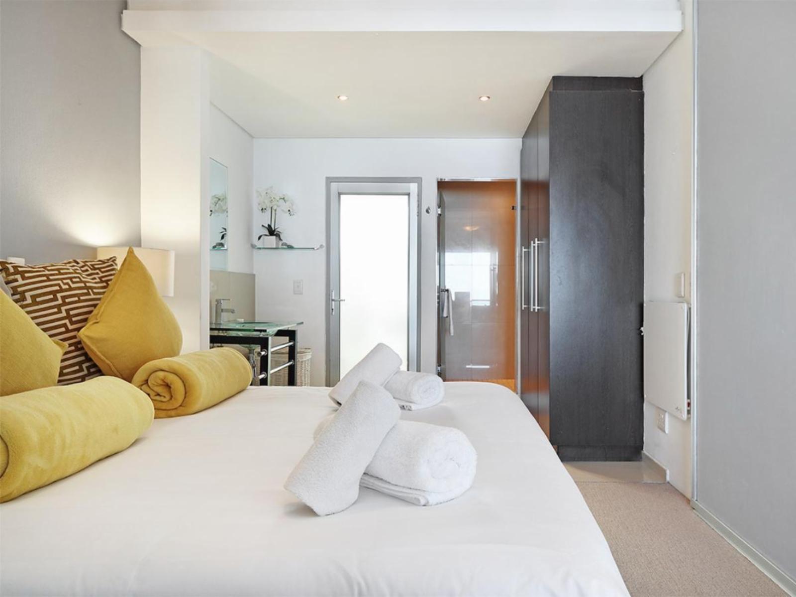 The cosy main interior is open plan, with a kitchen leading to a moderately sized dining area, a lounge and sliding doors that lead out to a balcony. The sleek kitchen is fully equipped, including a stove, oven, microwave and fridge. The casual dining area comfortably seats 2 around a round glass table. Sit back and relax in the nearby and gorgeous lounge, which includes a large couch that additionally serves a daybed, and enjoy your favourite movie or show on a wall-mounted flat-screen TV with a DStv decoder. Out on the balcony, you can indulge in breathtaking views over the magnificent Atlantic Ocean towards the majestic Table Mountain.