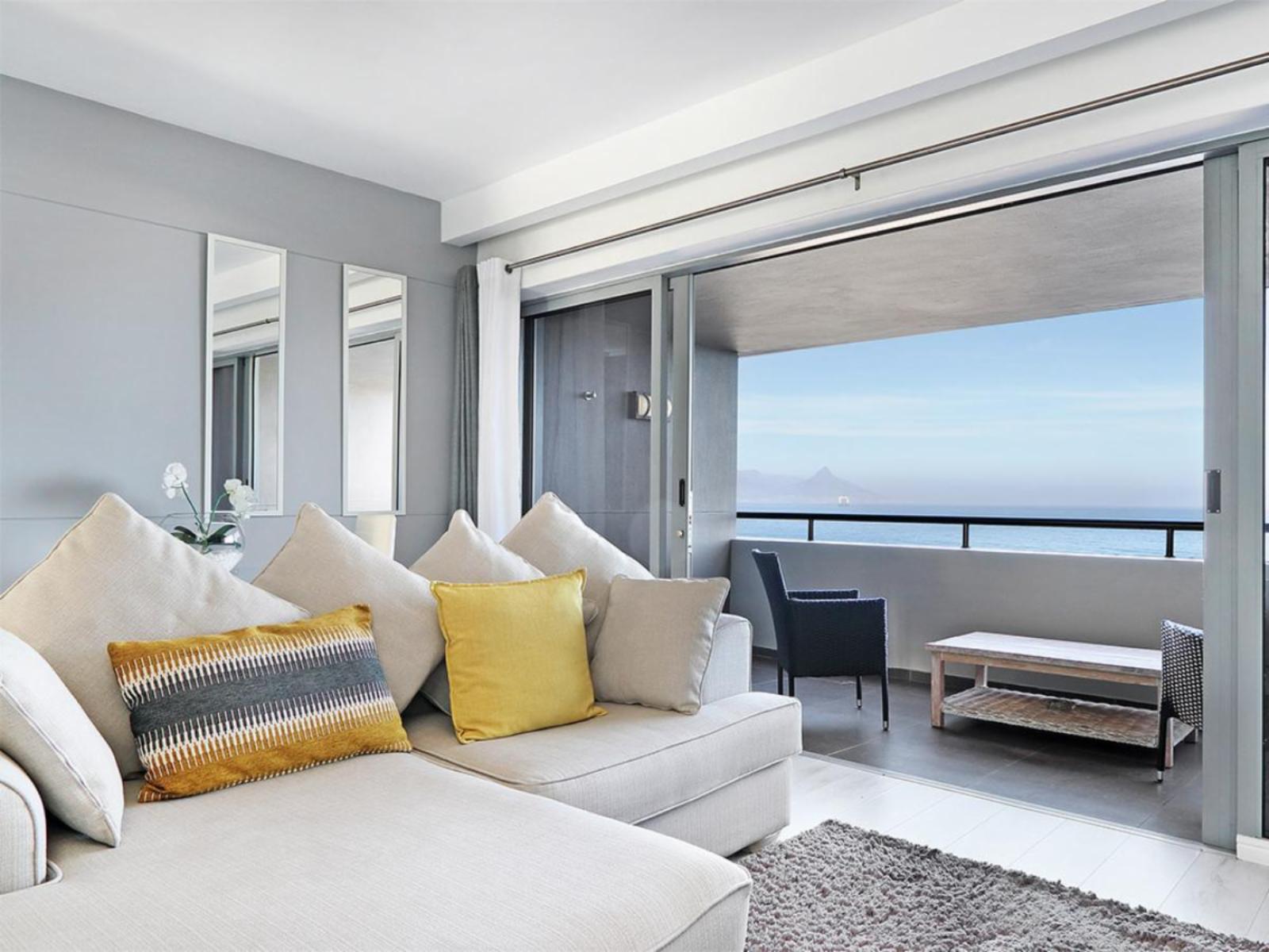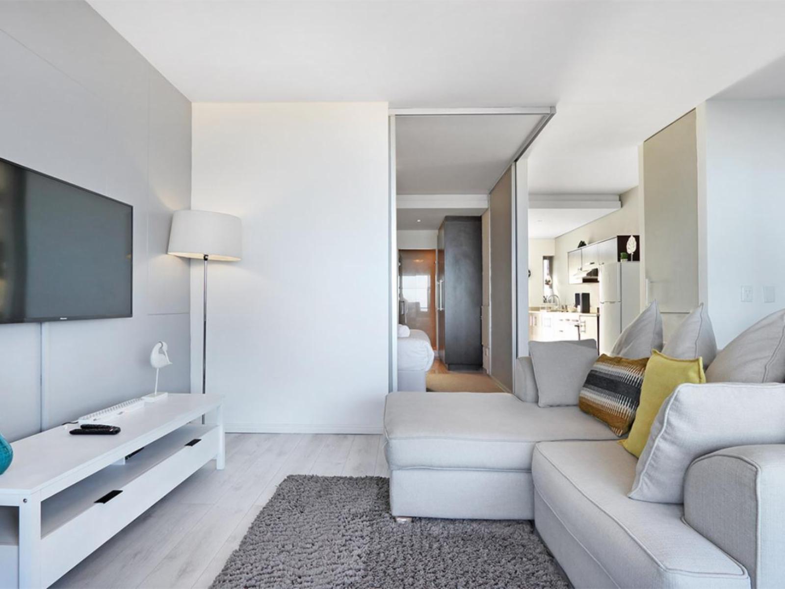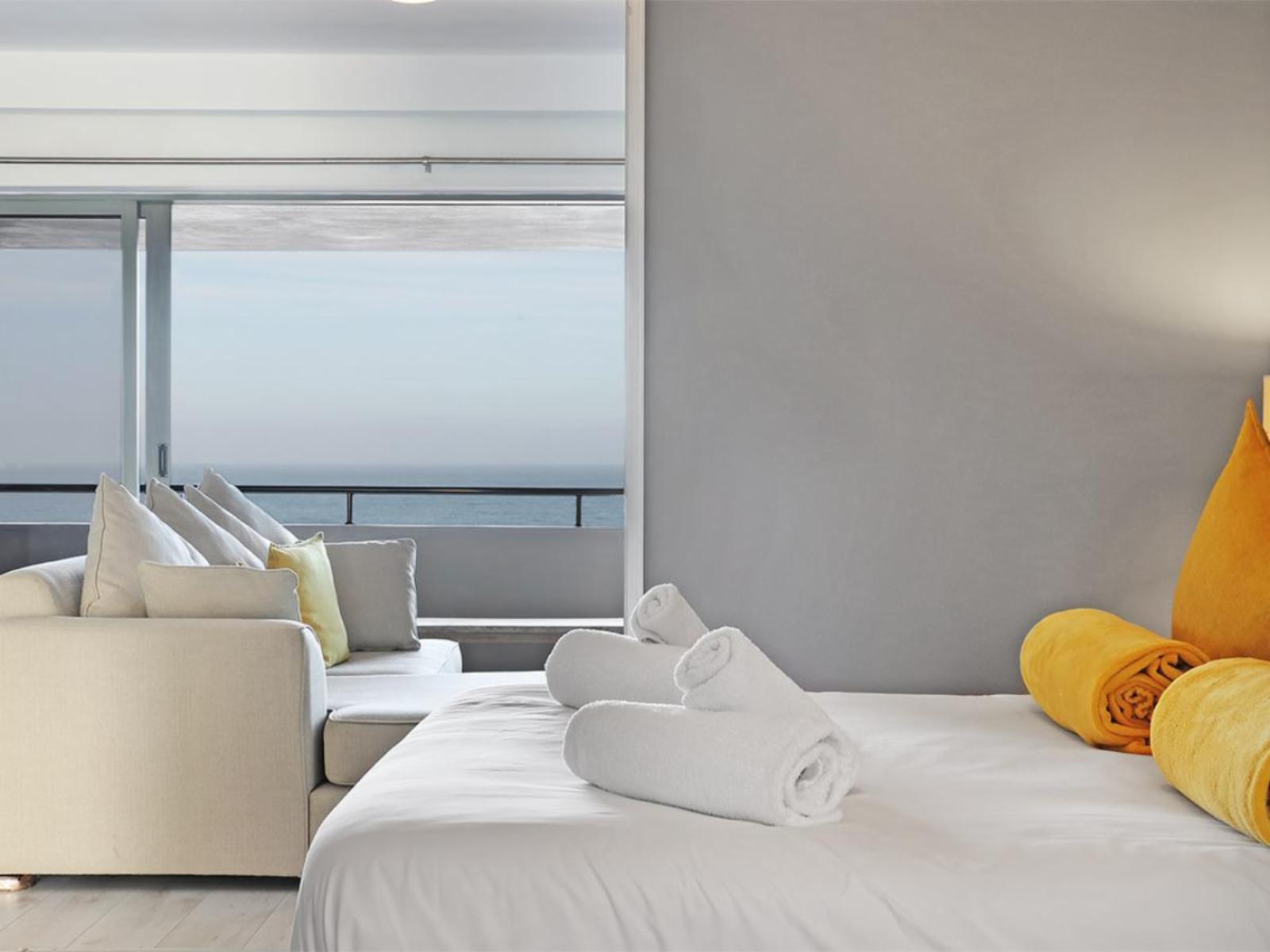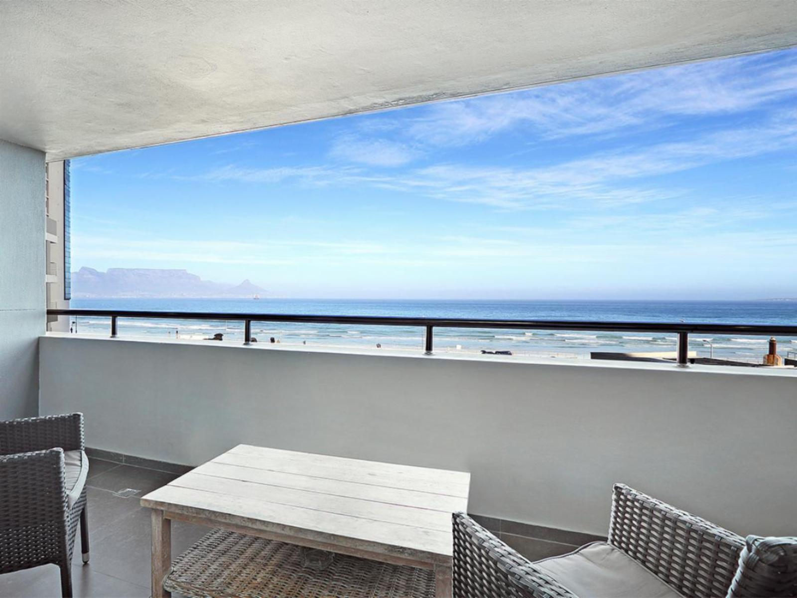 The cosy main interior is open plan, with a kitchen leading to a moderately sized dining area, a lounge and sliding doors that lead out to a balcony. The sleek kitchen is fully equipped, including a stove, oven, microwave and fridge. The casual dining area comfortably seats 2 around a round glass table. Sit back and relax in the nearby and gorgeous lounge, which includes a large couch that additionally serves a daybed, and enjoy your favourite movie or show on a wall-mounted flat-screen TV with a DStv decoder. Out on the balcony, you can indulge in breathtaking views over the magnificent Atlantic Ocean towards the majestic Table Mountain.