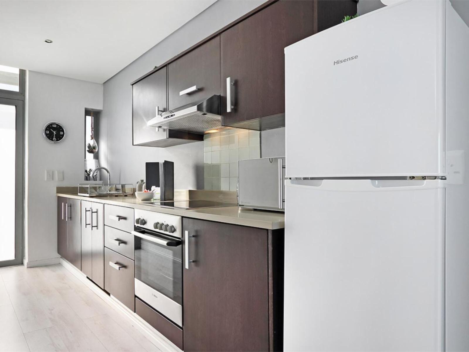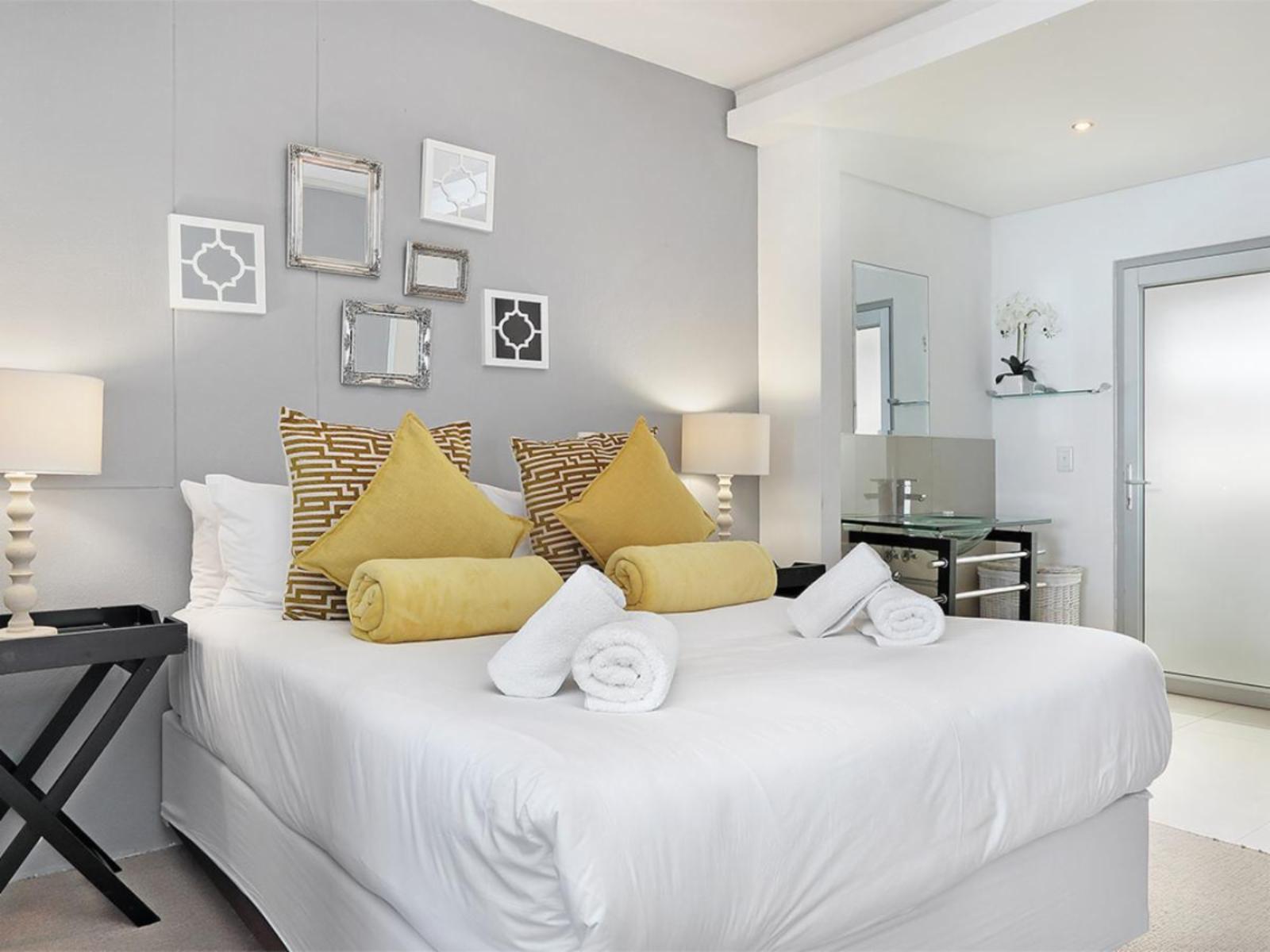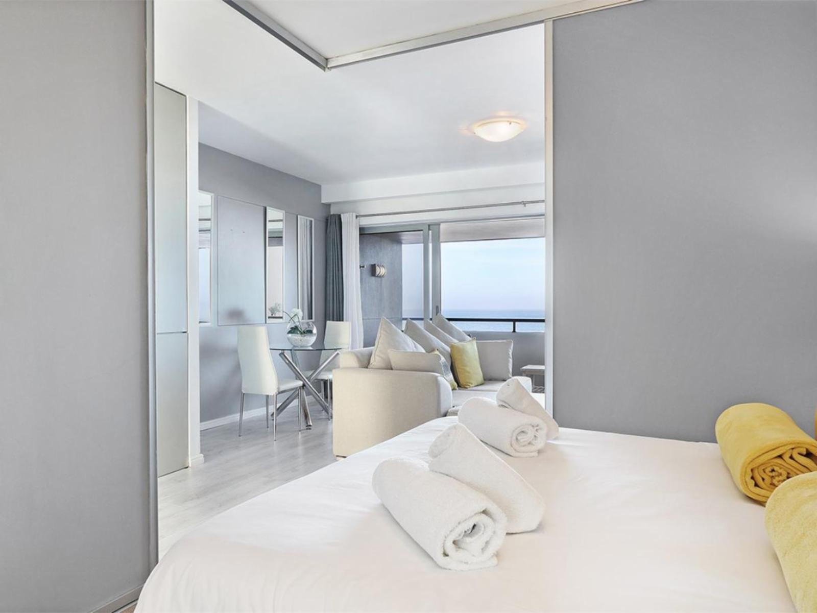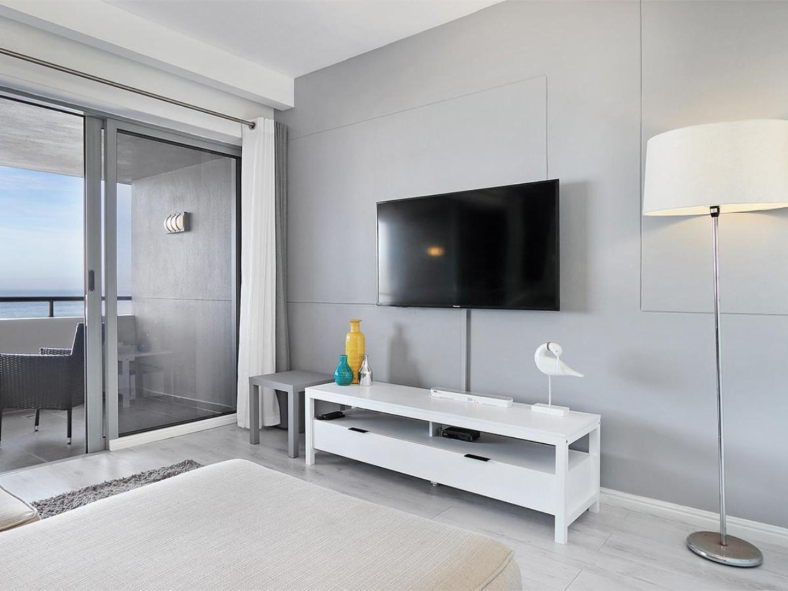 The cosy main interior is open plan, with a kitchen leading to a moderately sized dining area, a lounge and sliding doors that lead out to a balcony. The sleek kitchen is fully equipped, including a stove, oven, microwave and fridge. The casual dining area comfortably seats 2 around a round glass table. Sit back and relax in the nearby and gorgeous lounge, which includes a large couch that additionally serves a daybed, and enjoy your favourite movie or show on a wall-mounted flat-screen TV with a DStv decoder. Out on the balcony, you can indulge in breathtaking views over the magnificent Atlantic Ocean towards the majestic Table Mountain.