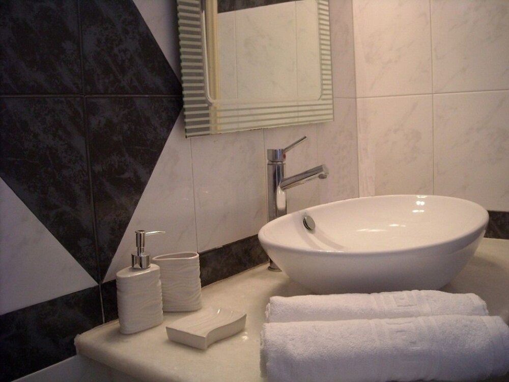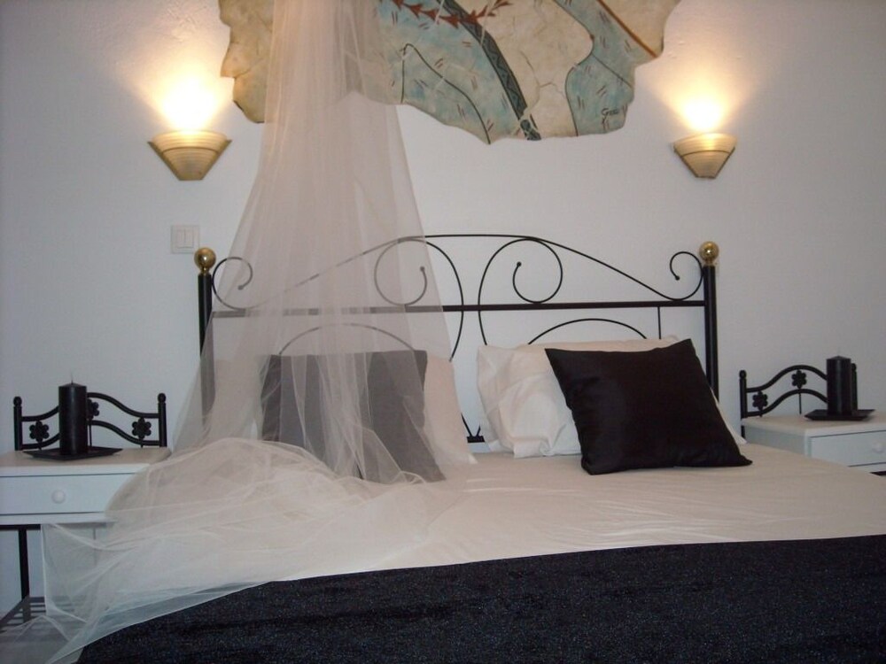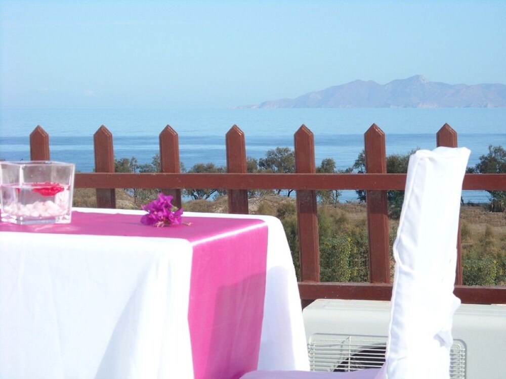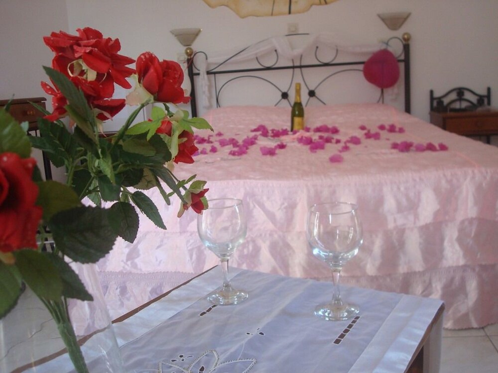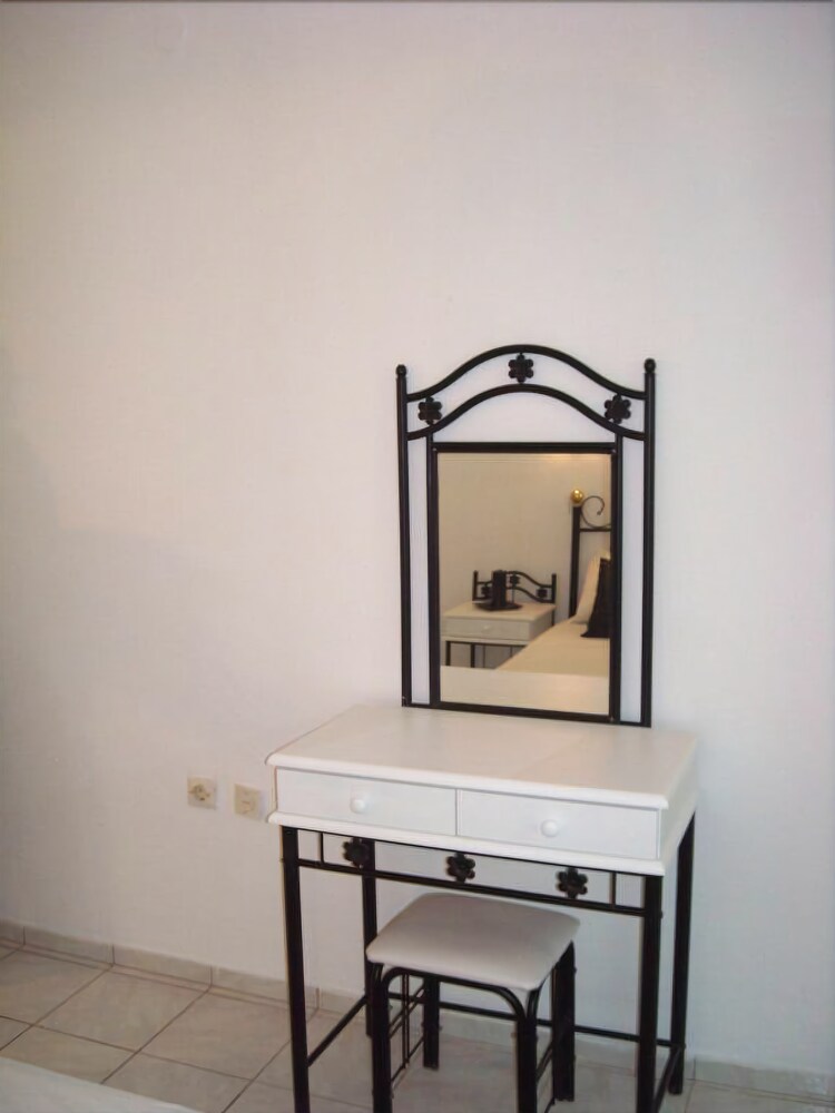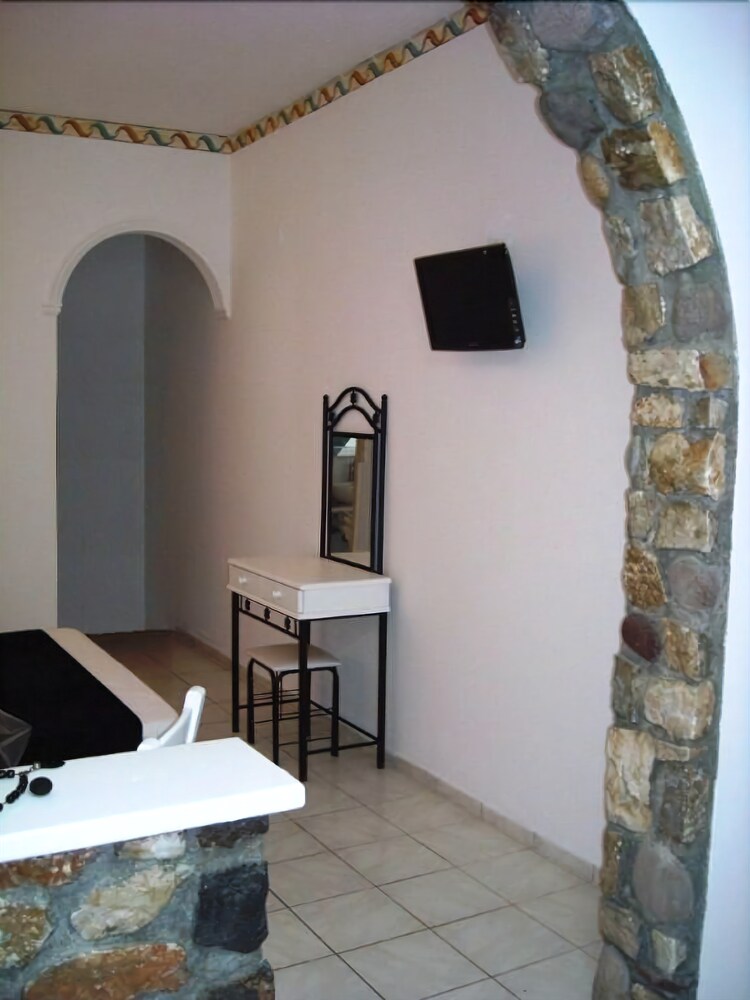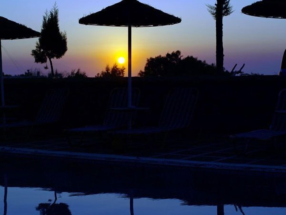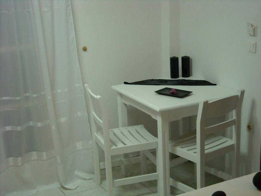 The apartment hotel is located 300 metres from the centre of the resort of Kamari, where guests will find the beachfront with its many restaurants, bars, shops and supermarkets. The apartment hotel is situated 100 metres down a small road which leads to the beach of Kamari and on which more tavernas and a mini market are located. The nearest bus stop is situated 300 metres away in the centre of the resort. From here, guests are able to take a transfer to the capital of Fira. Ancient Thira is approximately 1 km away from the apartment hotel. The distance from Kamari to the port is 11 km, and Santorini (Thira) Airport is 4 km away.This apartment hotel comprises a total of 12 studios in a family-run complex that was built in a traditional style. It has been tastefully decorated and is the ideal place for a quiet and comfortable holiday. Guests are welcomed in the lobby. Facilities on offer to guests include a breakfast room.The studios are spacious and feature a fully fitted kitchenette with a fridge. All studios come with a private en suite bathroom with a shower. Guests can enjoy a good night's rest on their double bed. The studios also come equipped with a safe and air conditioning (each for an extra charge). Furthermore, a kettle for tea and coffee is provided in all accommodation units as standard. Each studio also features a balcony or terrace.There is an outdoor swimming pool in the centre of the apartment hotel with a poolside snack bar and seating area, with sun loungers and parasols laid out for use by the water's edge. Moreover, sun loungers and parasols are available for hire on the nearby sand and pebble beach (fees apply).