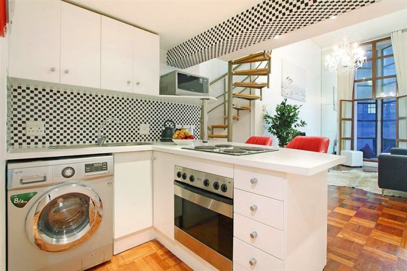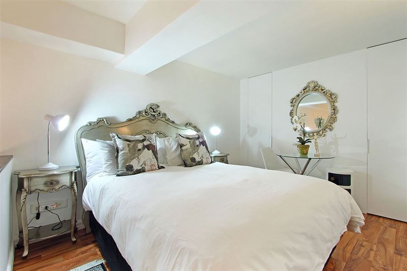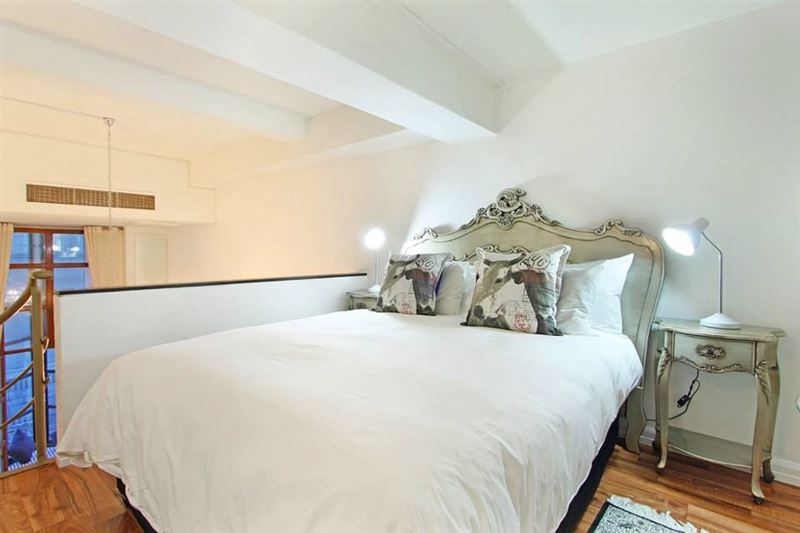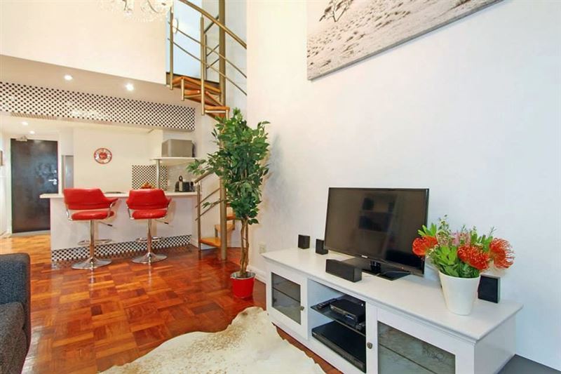 This very appealing, sophisticated 1-bedroom apartment located in the historic art deco Mutual Heights building, is your perfect self-catering lock-up-and-go Cape Town holiday apartment. It's fresh, bright and welcoming with a queen-size loft bedroom. It comes with private parking, free Wifi and use of a rooftop pool.Lady Kepple sleeps two in a queen-size bed in the loft bedroom overlooking the lounge. This art deco feature of Mutual Heights, along with double-volume ceilings, tall windows, parquet floors and a spiral staircase combine to give you a Cape Town holiday b