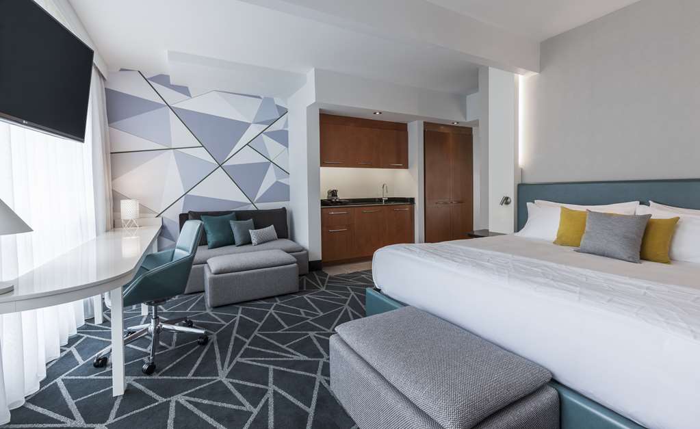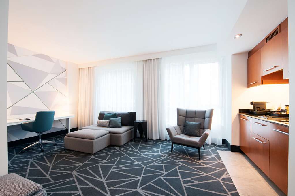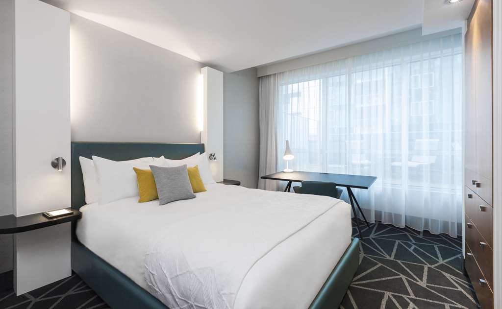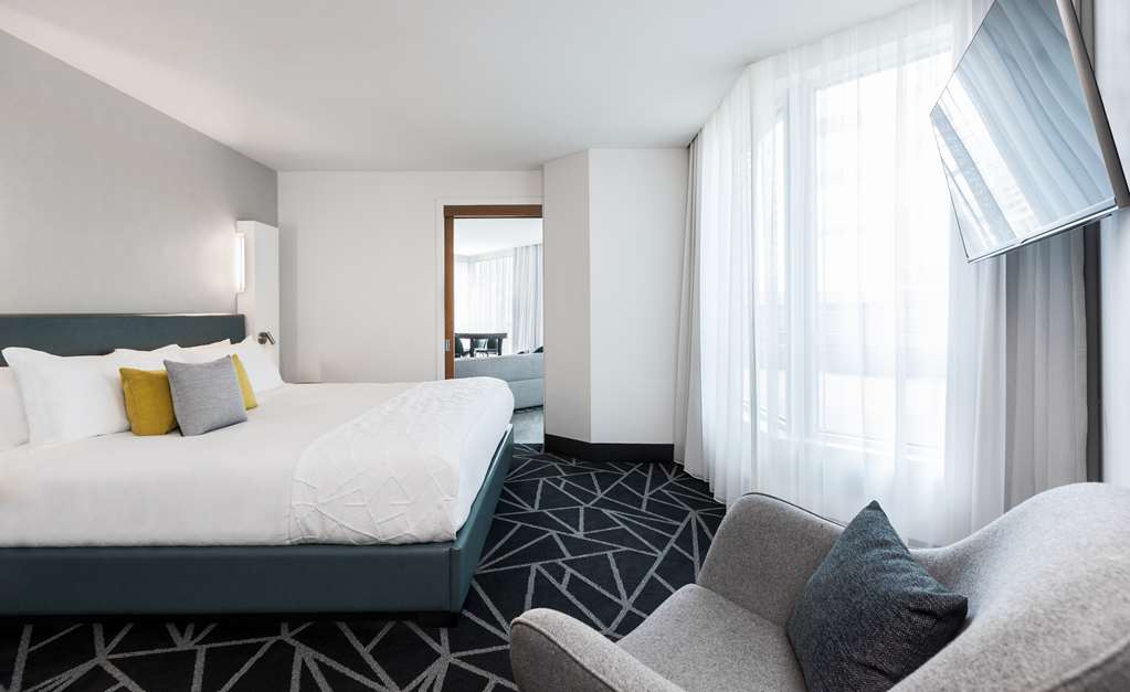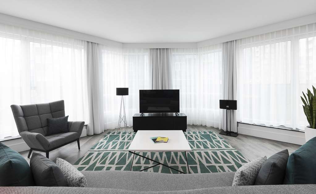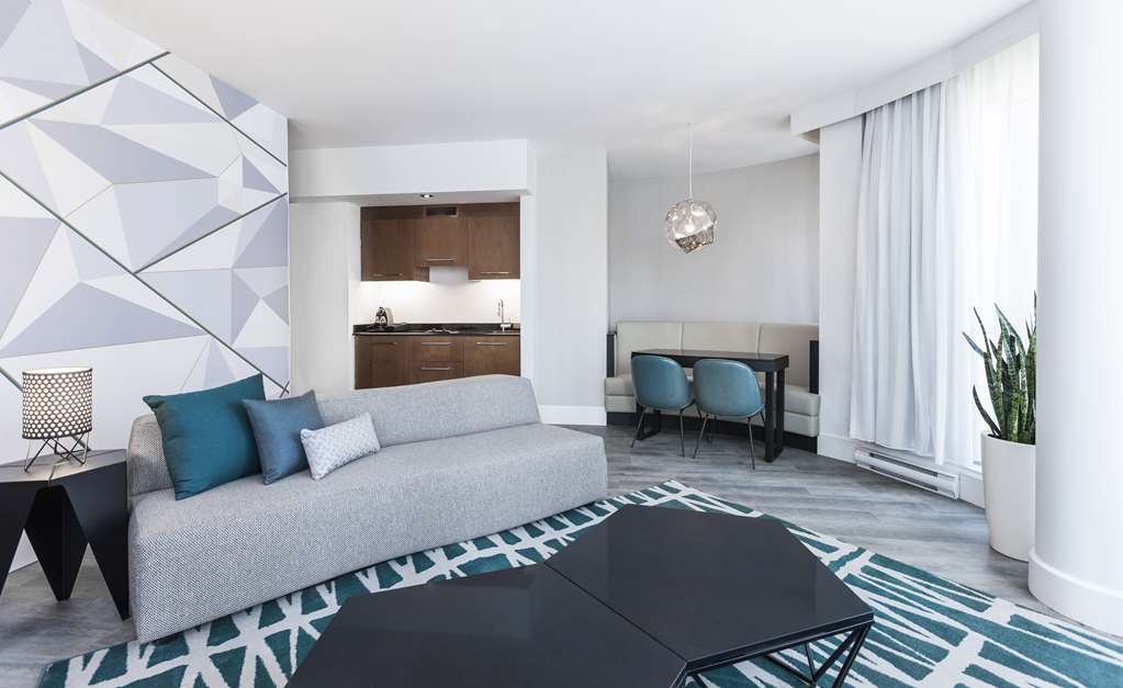 This all-suite hotel is located in the heart of Montreal's business district, on the fashionable Rue de la Montagne and Rene Levesque Boulevard. It is right next to links to the public transport network and just steps from the best shopping and dining and the vibrant Montreal nightlife. The Bell Center, home of Les Canadiens de Montreal and temple of international entertainment, is just across the street and it is 500 m to Old Montreal, the city's historic area and 700 m to the Montreal Museum of Fine Arts. Jean Drapeau Beach is 3.7 km away and it is 7.3 km to the Olympic Stadium and 8.6 km to the La Ronde amusement park.Built in 2008, this charming all-suite city design hotel rises up as a gleaming tower on Montreal's Rue de la Montagne and comprises a total of 131 accommodation units. It is ideal for business travellers, conferences and holidaymakers alike. Facilities on offer to guests at this air-conditioned establishment include a lobby area with a 24-hour reception and check-out service, a hotel safe, a currency exchange facility and a cloakroom. There is a café, a bar, a pub, a disco and a restaurant as well as conference facilities and WLAN Internet access. Guests can also take advantage of the room and laundry services and there is a car park and covered garage parking for those arriving by car.The luxury suites are among the city's most spacious. They are appointed in comfortable and contemporary style for today's discerning travellers. All come with a private bathroom with a shower/bathtub and a hairdryer and offer a king-size bed. They are equipped with a direct dial telephone, satellite/ cable TV, a radio, Internet access and a safe. There is a kitchen with a minibar/fridge, a microwave, tea and coffee making facilities and a washing machine. Furthermore, an ironing set, air conditioning and heating are provided in all accommodation as standard and all units feature either a balcony or a terrace.
