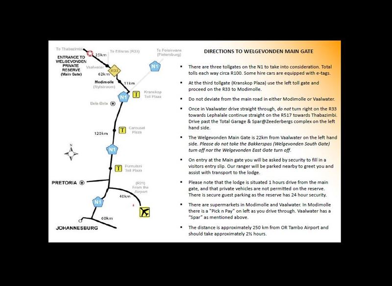 • Return scheduled transfers to the lodge from Welgevonden main gate or Welgevonden airstrip