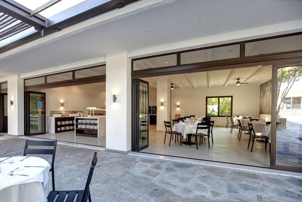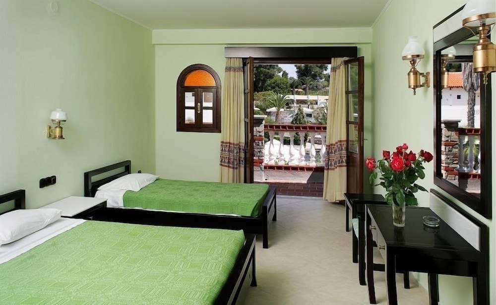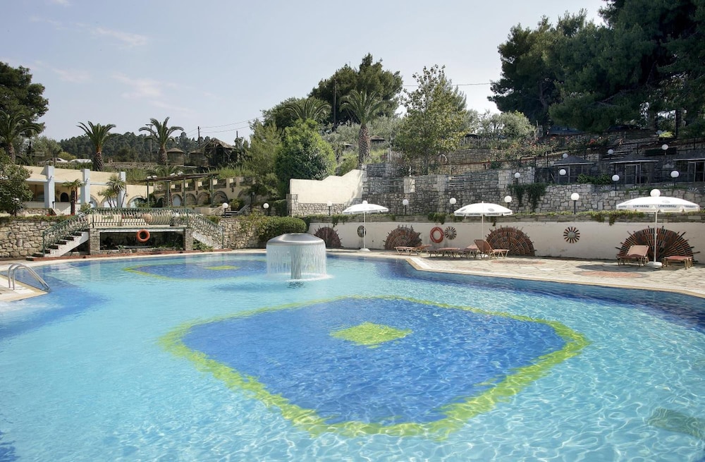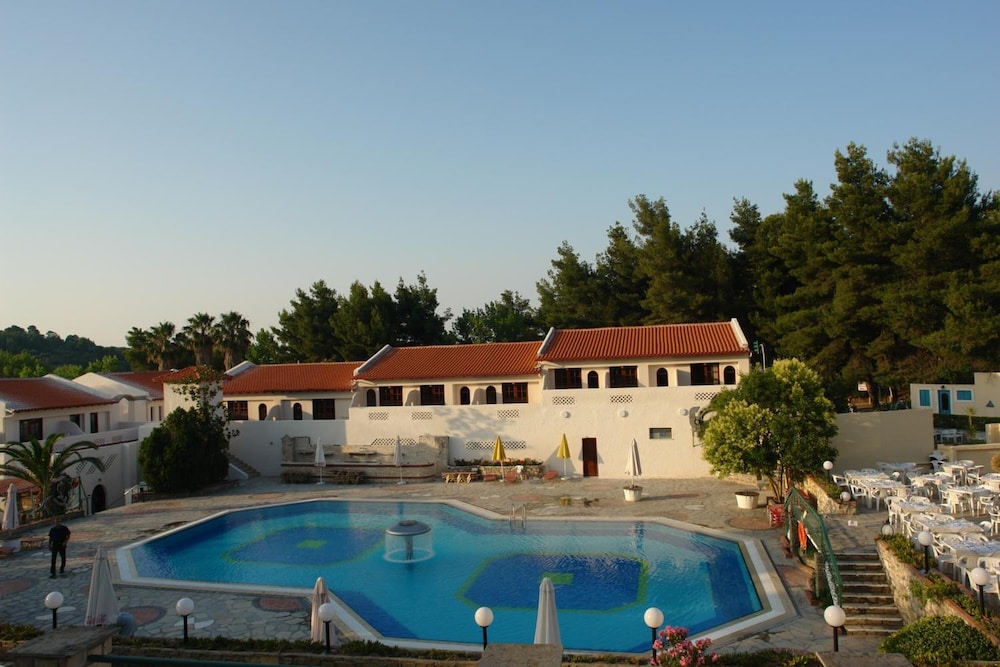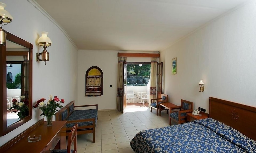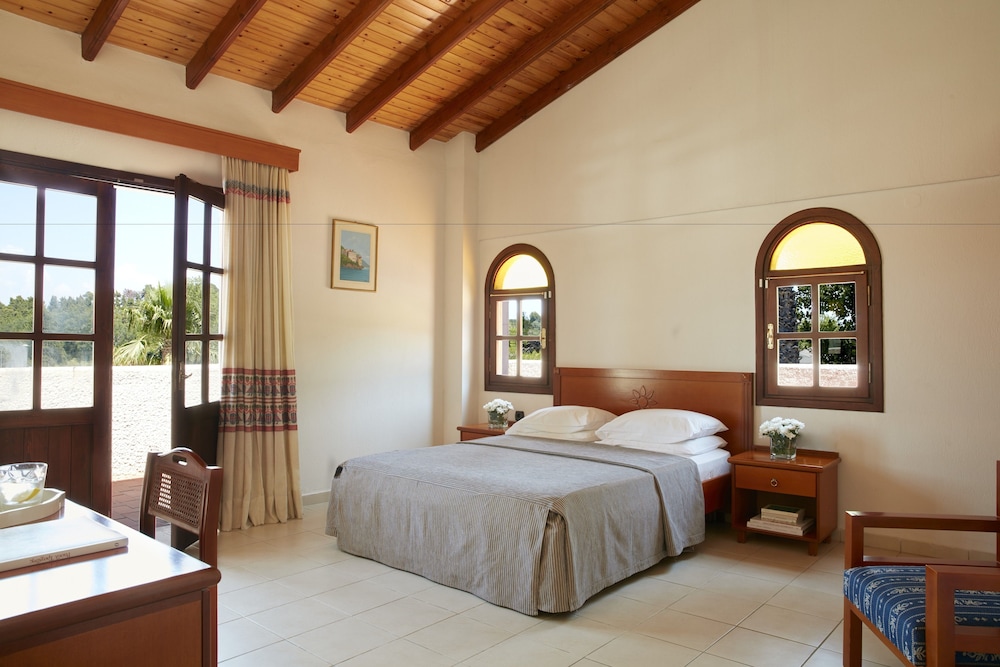 This hotel is situated just a kilometre from the village of Kallithea meaning "beautiful view", amidst natural surroundings with a wonderful outlook close to the sea. Due to the excellent location of its buildings, the hotel offers a panoramic ocean view amongst gardens blooming with rose bushes. The serenity of the grounds, with its intertwining lanes, waterfalls and traditional architecture, is certainly an alternative proposal for travellers who seek tranquillity. However there is also a children's playground for the younger guests. The hotel provides a range of eating places serving a variety of cuisine. There is an outdoor swimming pool, but for those who prefer to swim in the crystal clear Mediterranean waters the beach is not far off. The palm trees and beautifully tended grounds lend an exotic beauty to the already stunning setting.