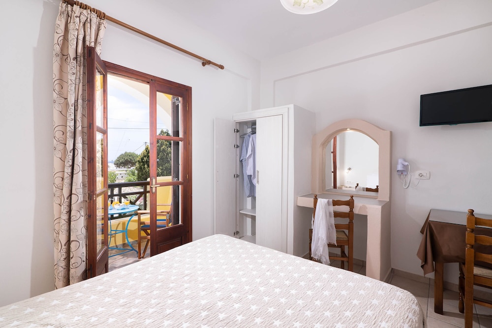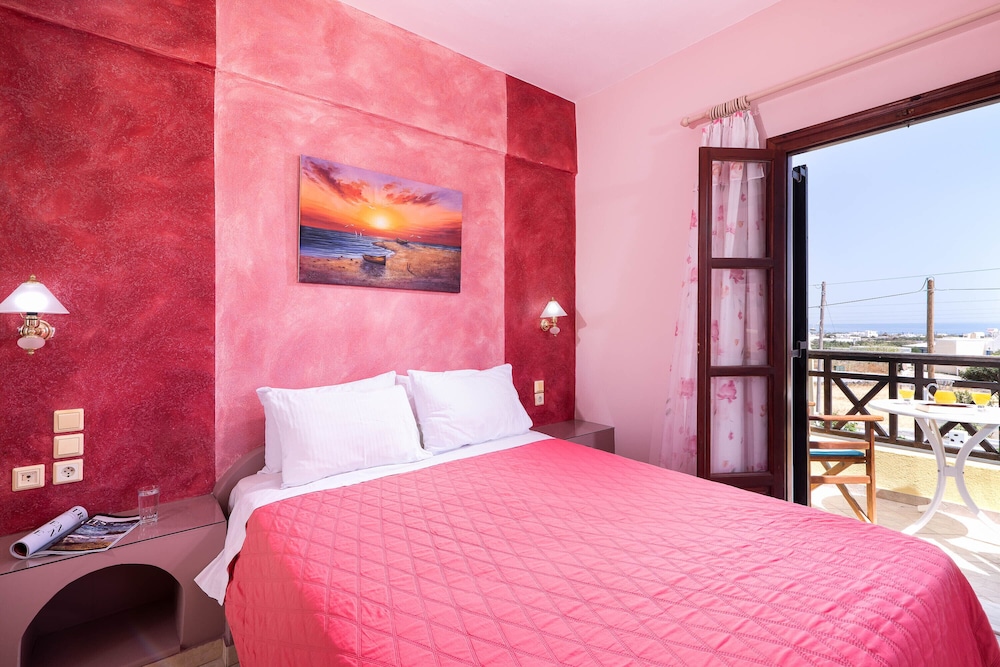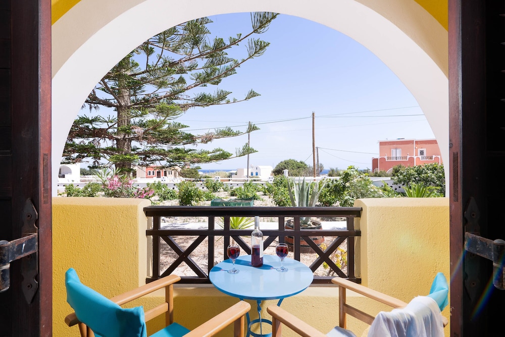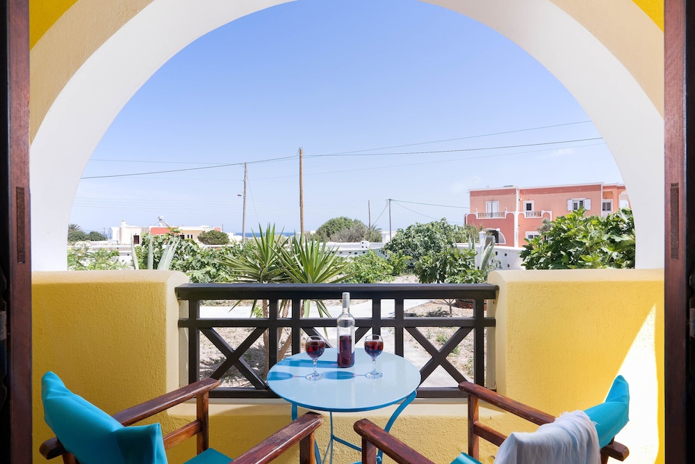 Mandilaria Studios is a complex of budget accommodation studio in Emborio at a short distance from Perivolos beach and at 2 km from Perissa.Built in an austere architectural style, in the colors of ochre and white, the studios fully integrate with the surroundings, creating a peaceful atmosphere, ideal for relaxing and carefree holidays, with your family, friends or your companion, in one of the most discerning locations of the island.andilaria complex consists of 12 airy and sunny studios, distributed in two floors. In their ample areas, interior design is plain yet pleasant, with all the necessary amenities. The complex boasts well attended public spaces, a bar, outdoor pool, a large garden and playground for the entertainment of the children, as well as a mini pool for the kids.
